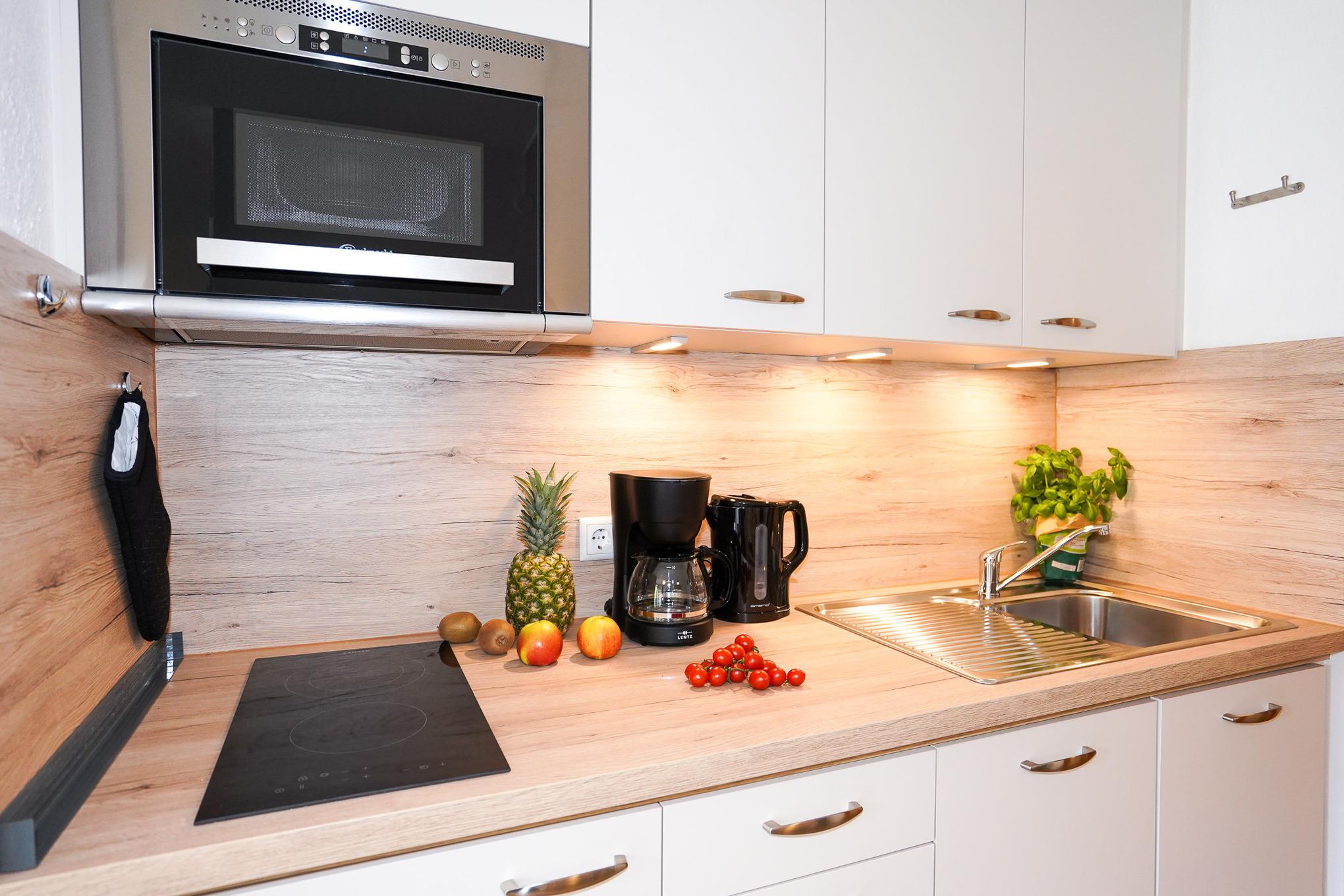 Die neue Küche verfügt über eine Spülmaschine, Kühlschrank mit Gefrierfach, Mikrowelle mit Backfunktion, Cerankochfeld und diverse Elektrokleingeräte. Direkt gegenüber der Küchenzeile befindet sich der Esstisch. Ein hell gefliestes, modernes Duschbad rundet die Ausstattung dieser Ferienwohnung ab.