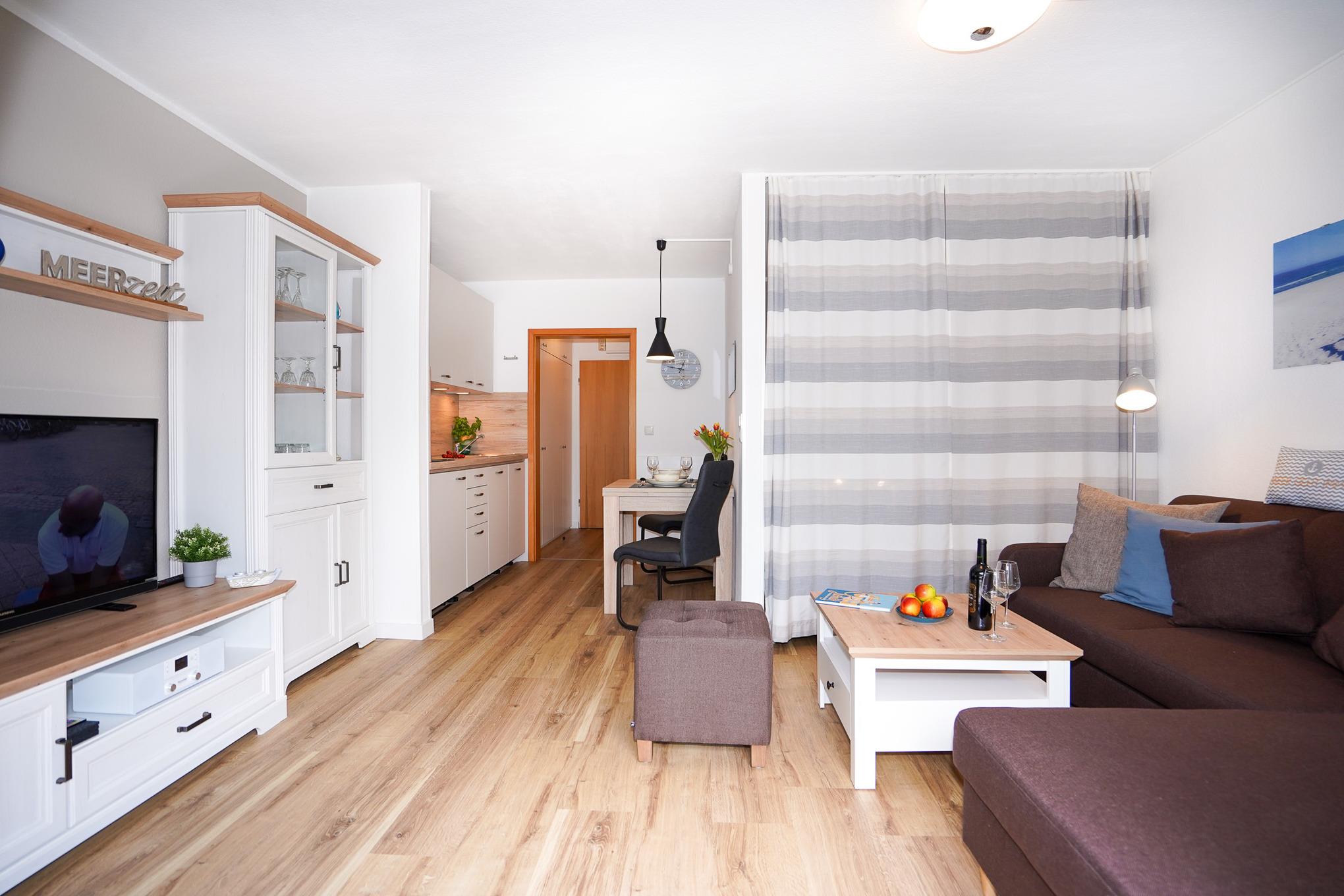 Der Wohn-/Ess- und Schlafbereich ist optisch perfekt untergliedert. Auf dem gemütlichem Sofa verbringen Sie gesellige Abende vor dem Fernseher oder bei Musik aus der Stereoanlage. Hinter einem Vorhang versteckt laden 2 Einzelbetten (80x200) zum Träumen ein. Bei Wunsch können Sie diese auch leicht zusammenschieben.