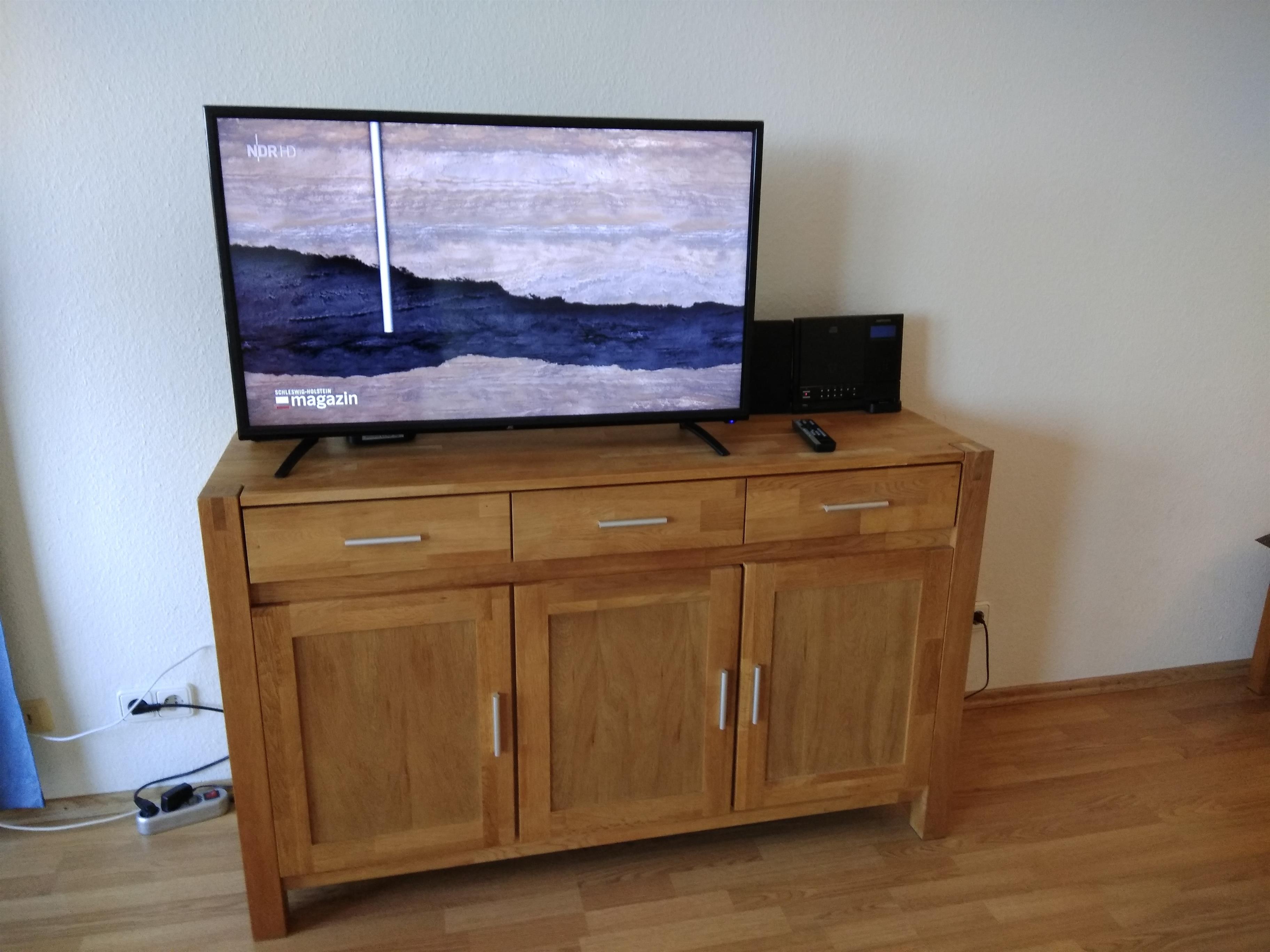 Ein internetfähiger Flachbild-TV mit DVBT-Receiver steht ebenso zur Verfügung wie eine kleine Stereokompaktanlage mit CD-Player.