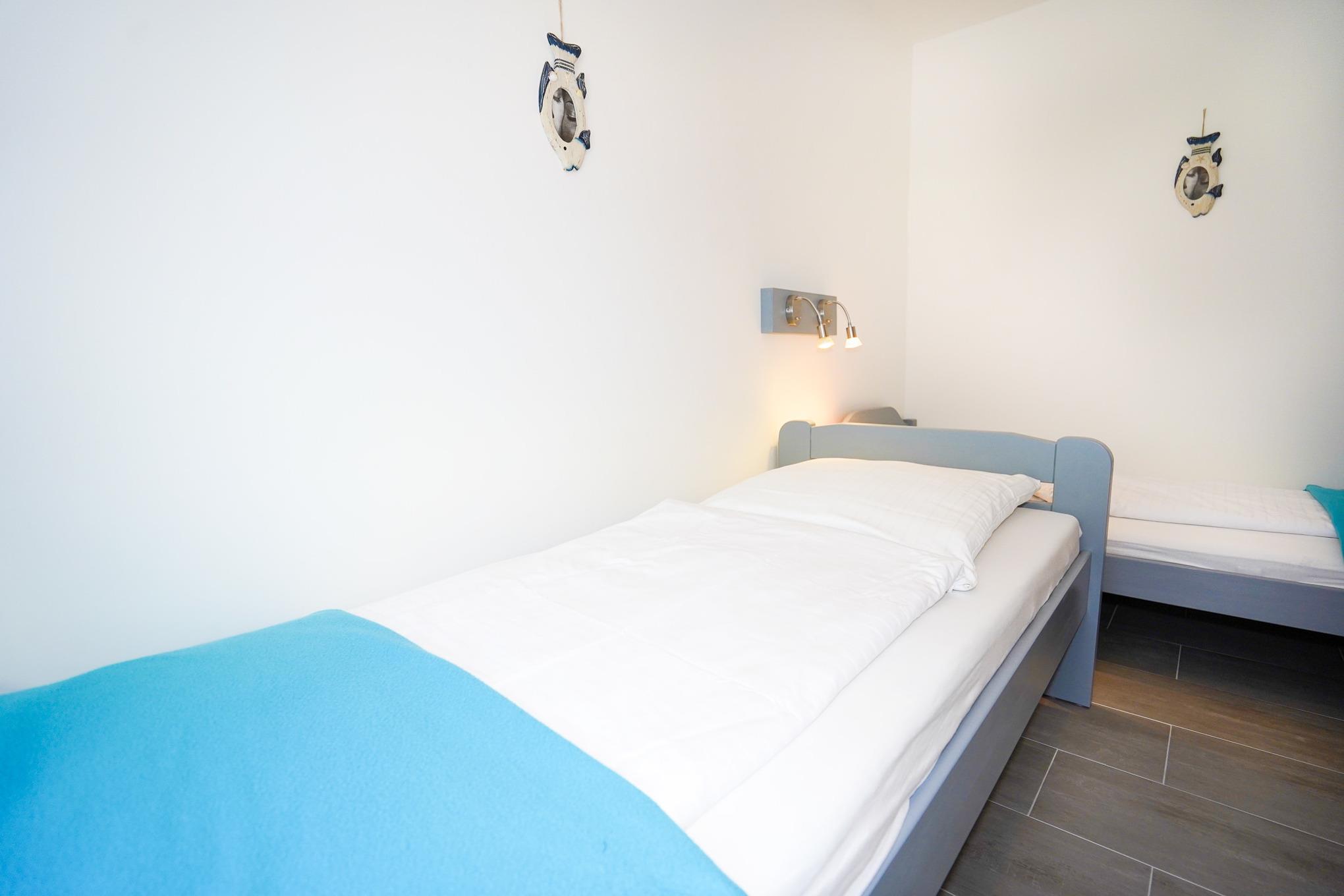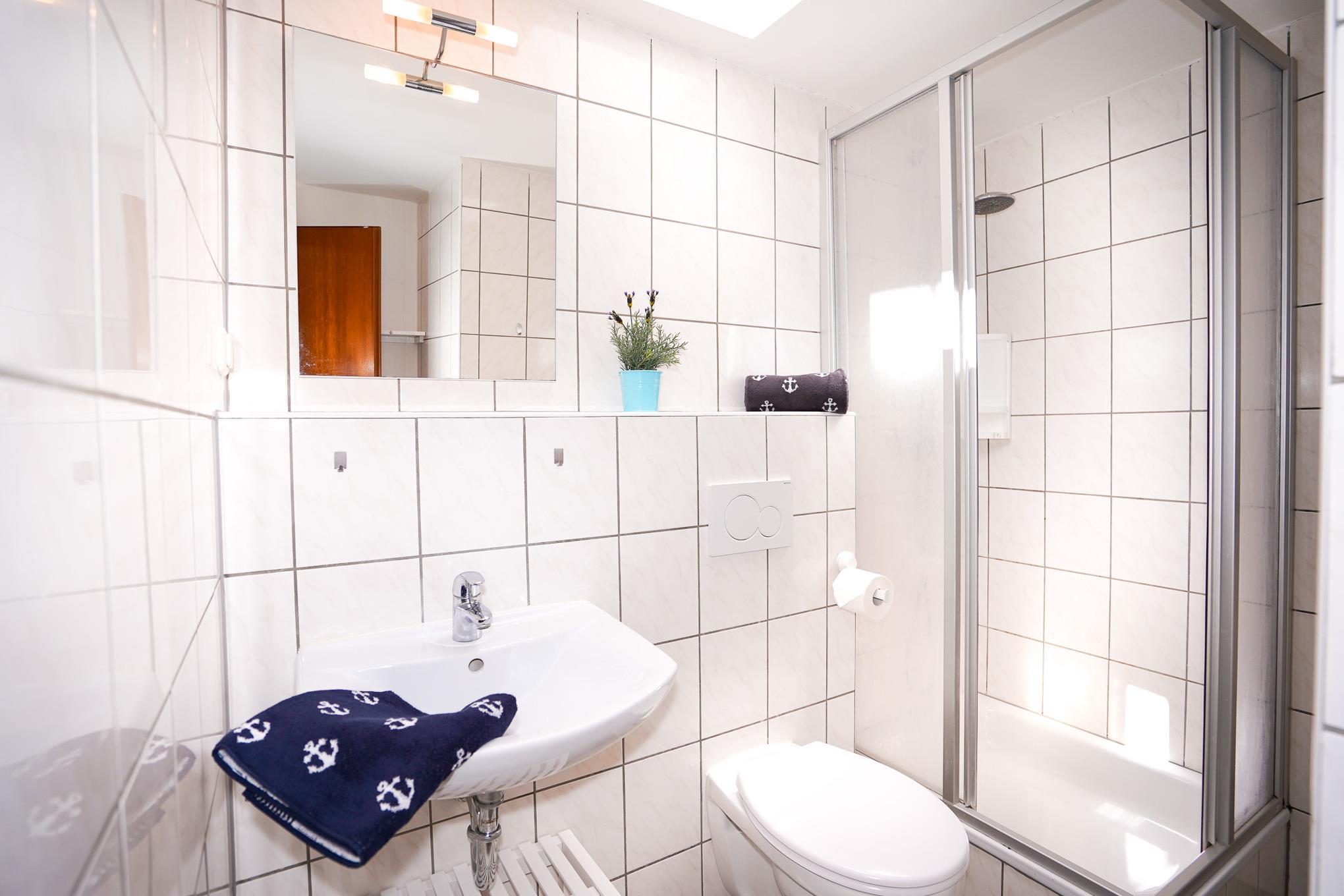 Insgesamt stehen Ihnen drei Schlafzimmer zur Verfügung. Ein Schlafzimmer verfügt über ein gemütliches Doppelbett, ein weiteres über zwei Einzelbetten und das dritte Schlafzimmer über ein Einzelbett. Ein modernes Duschbad mit WC und ein zusätzliches WC mit Waschbecken sorgen morgens für kurze Wartezeiten.