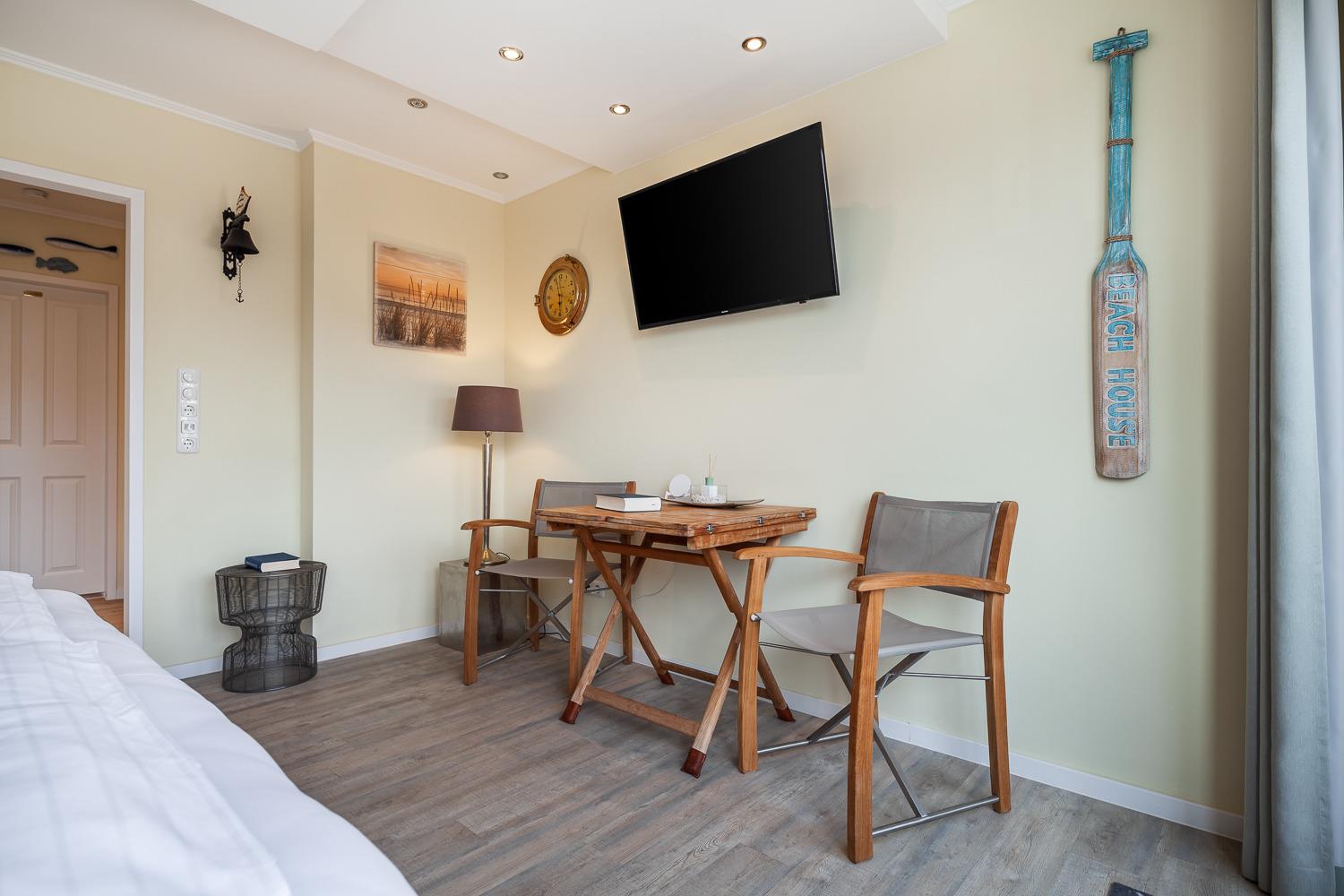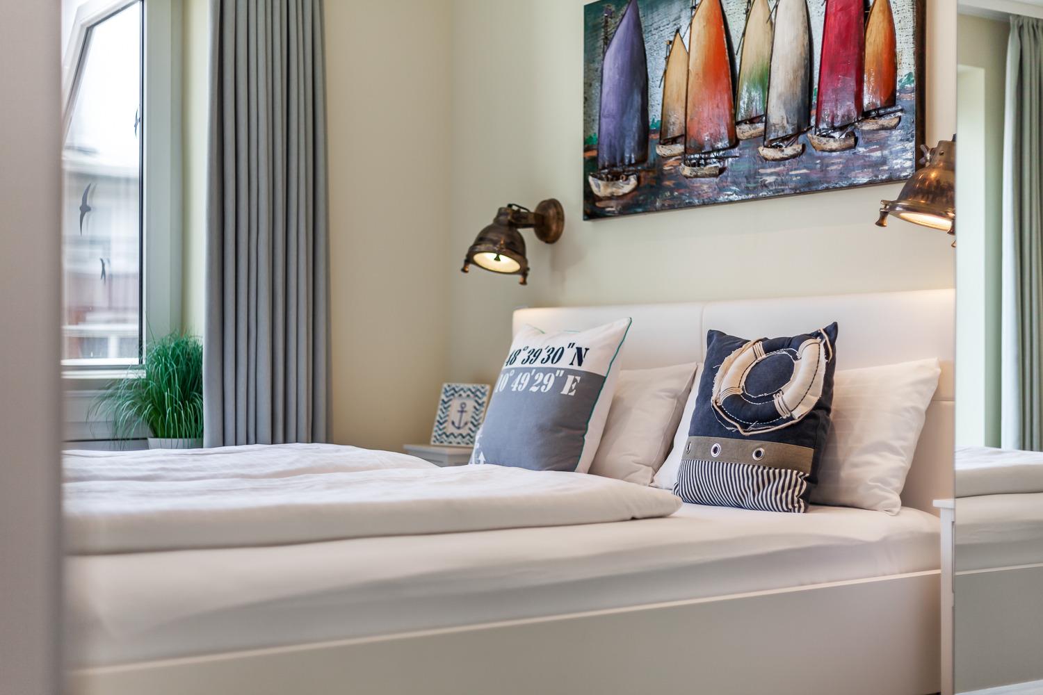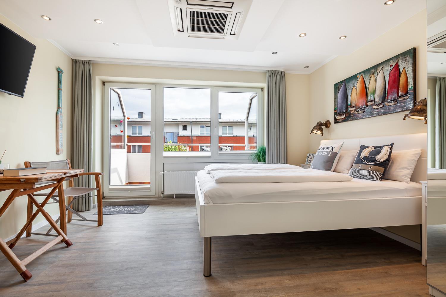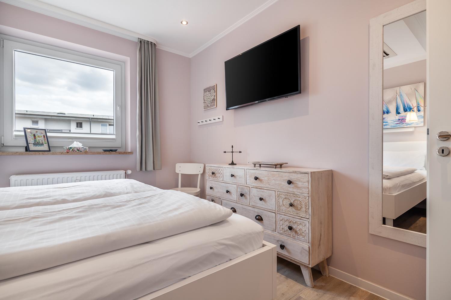 Zwei der behaglichen Schlafzimmer verfügen jeweils über ein Doppelbett mit hochwertigen 160x200 Matratzen. Ausgestattet sind beide Schlafzimmer mit einem Flachbild-TV, Kleiderschränken, sowie ein Schlafzimmer mit einem angrenzenden Balkon. Das dritte Schlafzimmer verfügt über zwei Einzelbetten (90x200). Auch in diesem Schlafzimmer stehen den Gästen ein Kleiderschrank und ein Flachbildfernseher zur Verfügung.