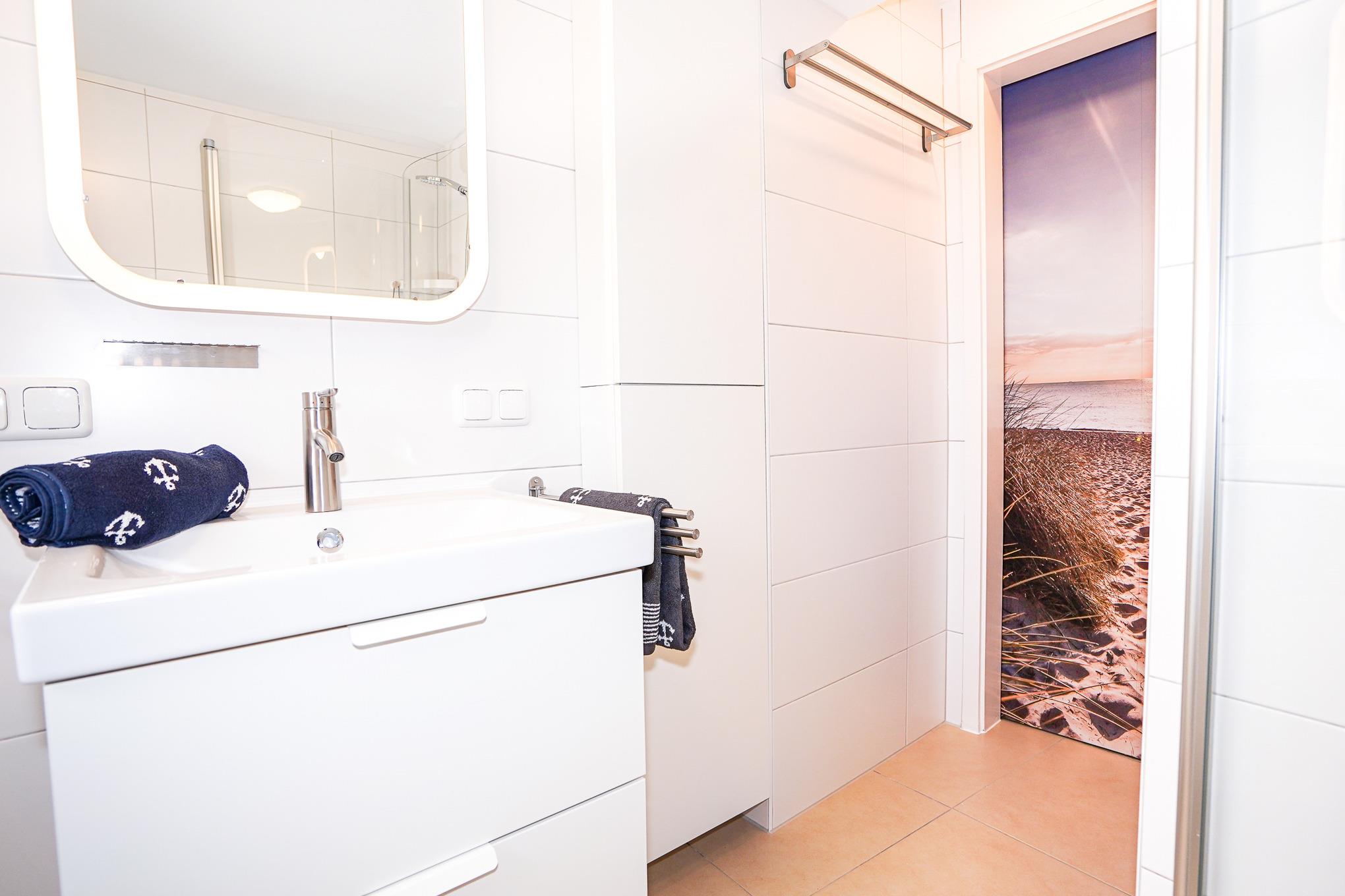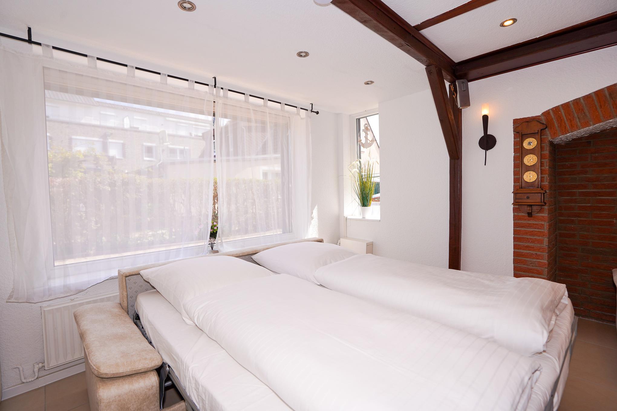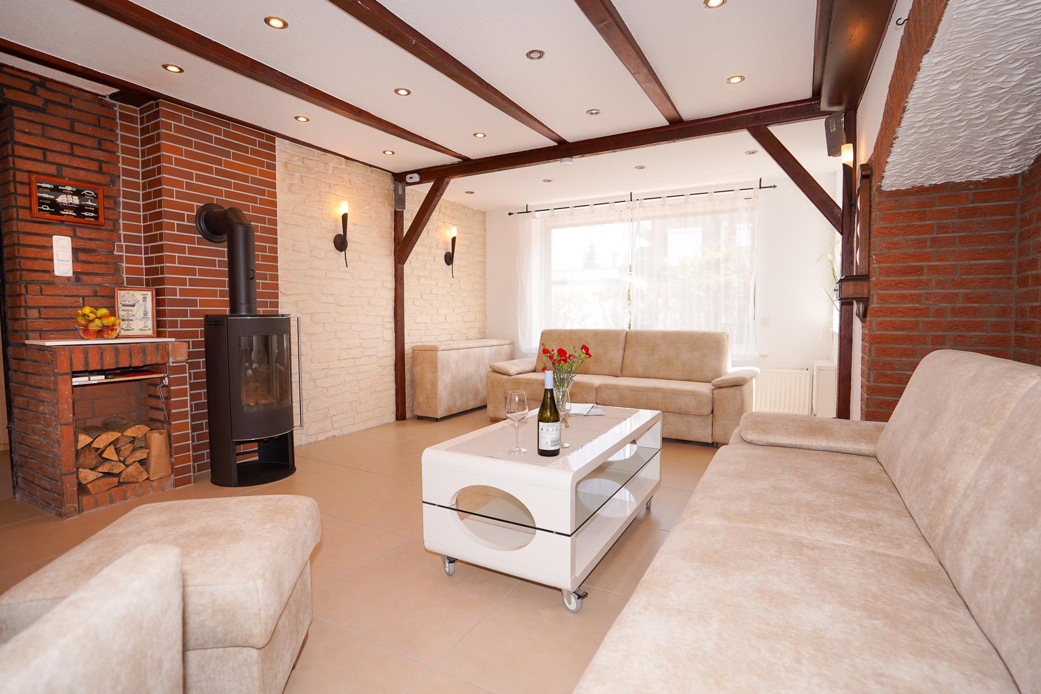 Das geflieste Wohnzimmer verfügt über zwei große, mit hochwertigen Matratzen ausgestattete (Schlaf-) Sofas, Sessel und einen Holzkamin. Ausreichend Brennholz für gemütliche Abende ist selbstverständlich vorhanden. Lassen Sie hier den Abend nach einem ausgiebigen Tag am Strand vor dem Kamin oder dem Fernseher mit MagentaTV ausklingen. Kostenloses WLAN über Glasfaser mit super Qualität steht Ihnen selbstverständlich für die Dauer Ihres Aufenthaltes zur Verfügung.