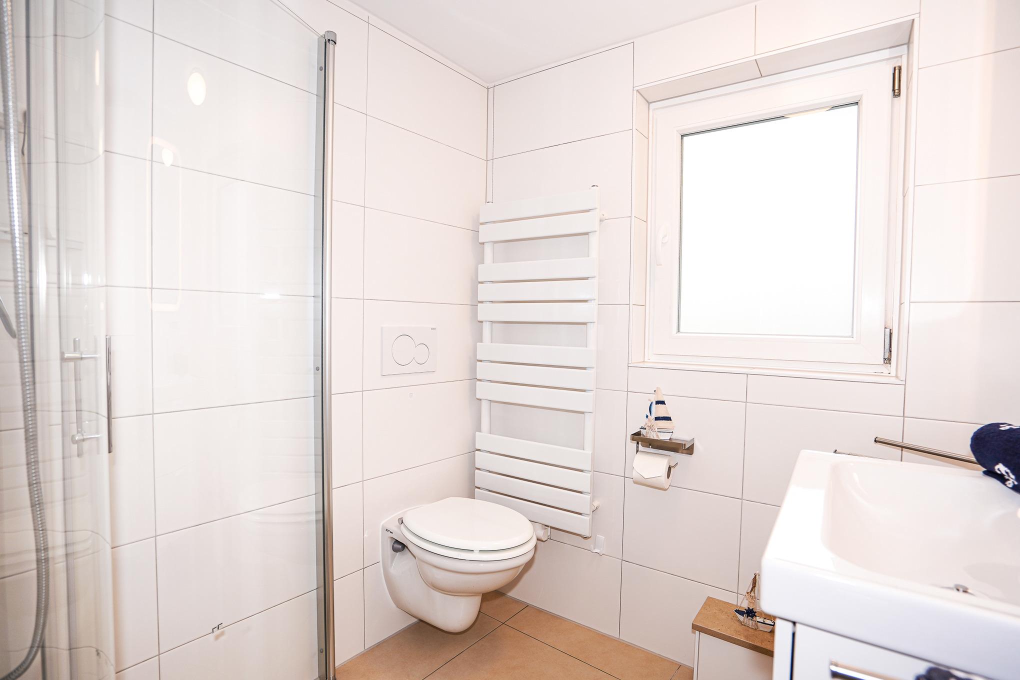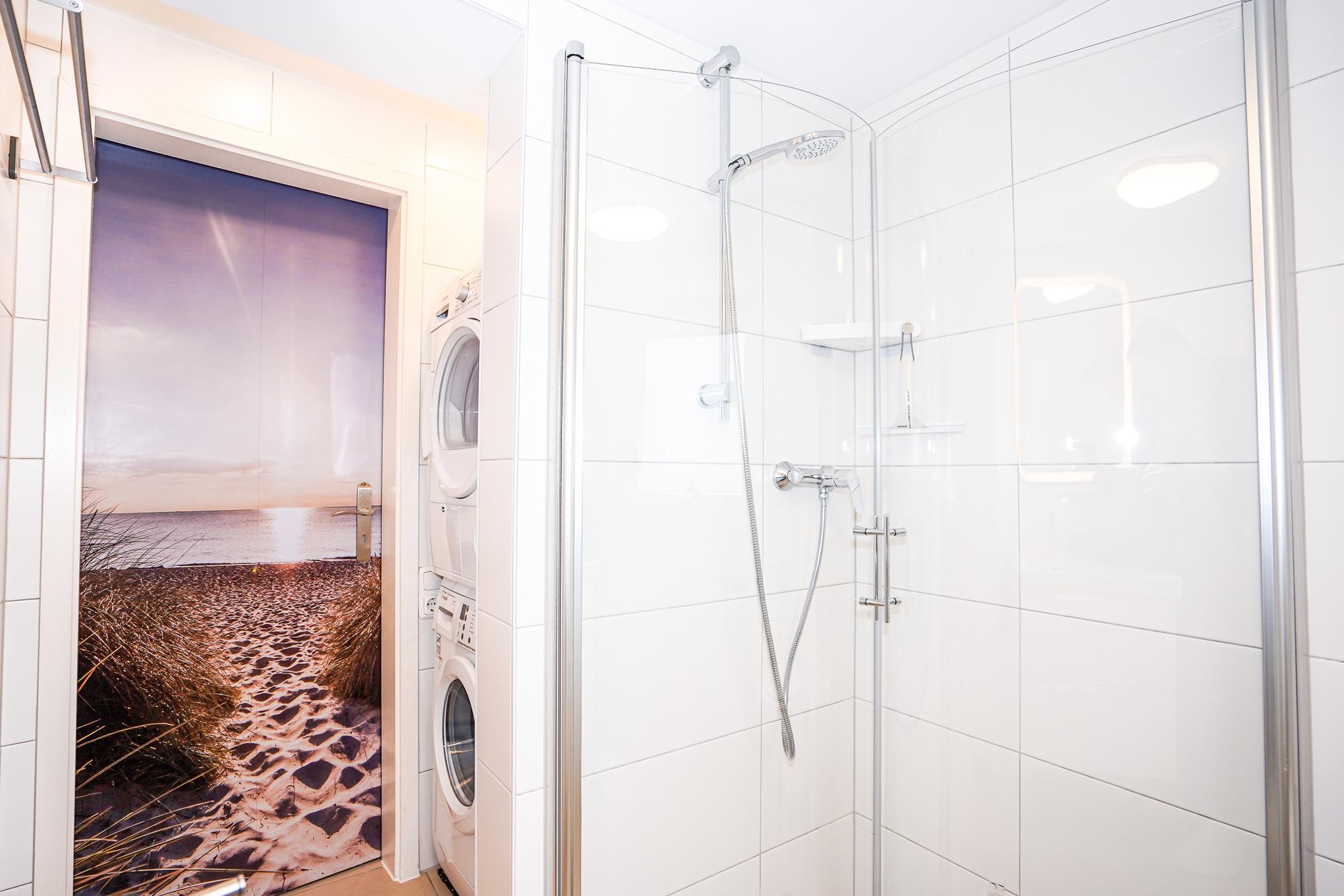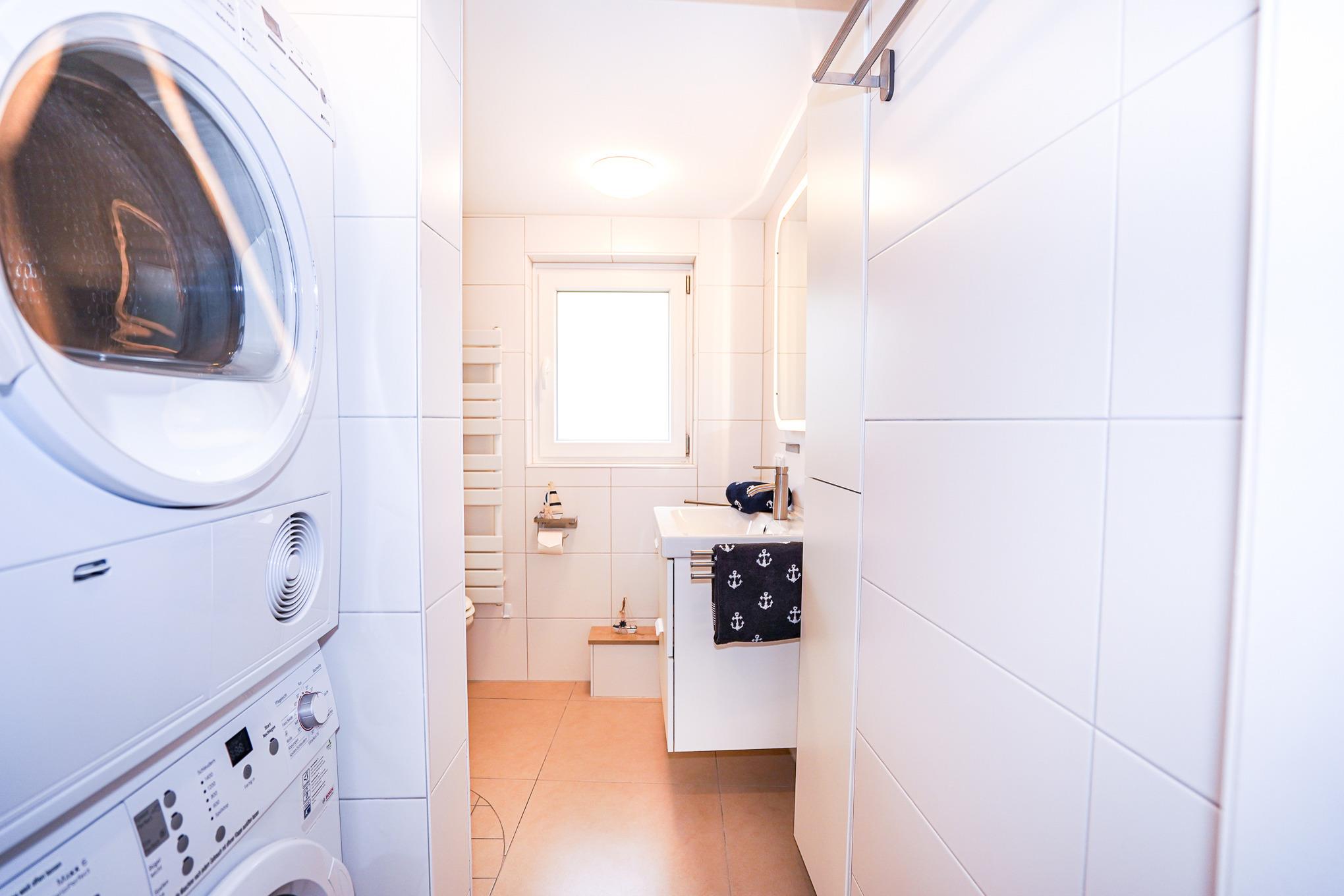 Das Badezimmer im Erdgeschoss verfügt über eine Dusche, eine Waschmaschine und einen Trockner zur freien Nutzung. Das WC hat einen integrierten Kindersitz & Fußhocker.