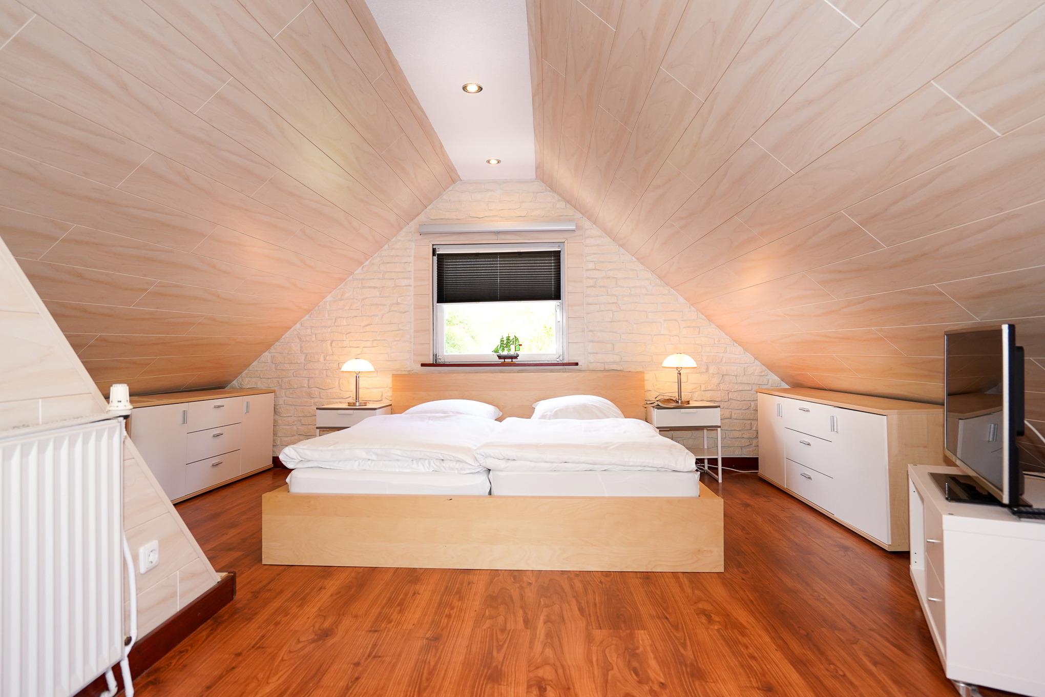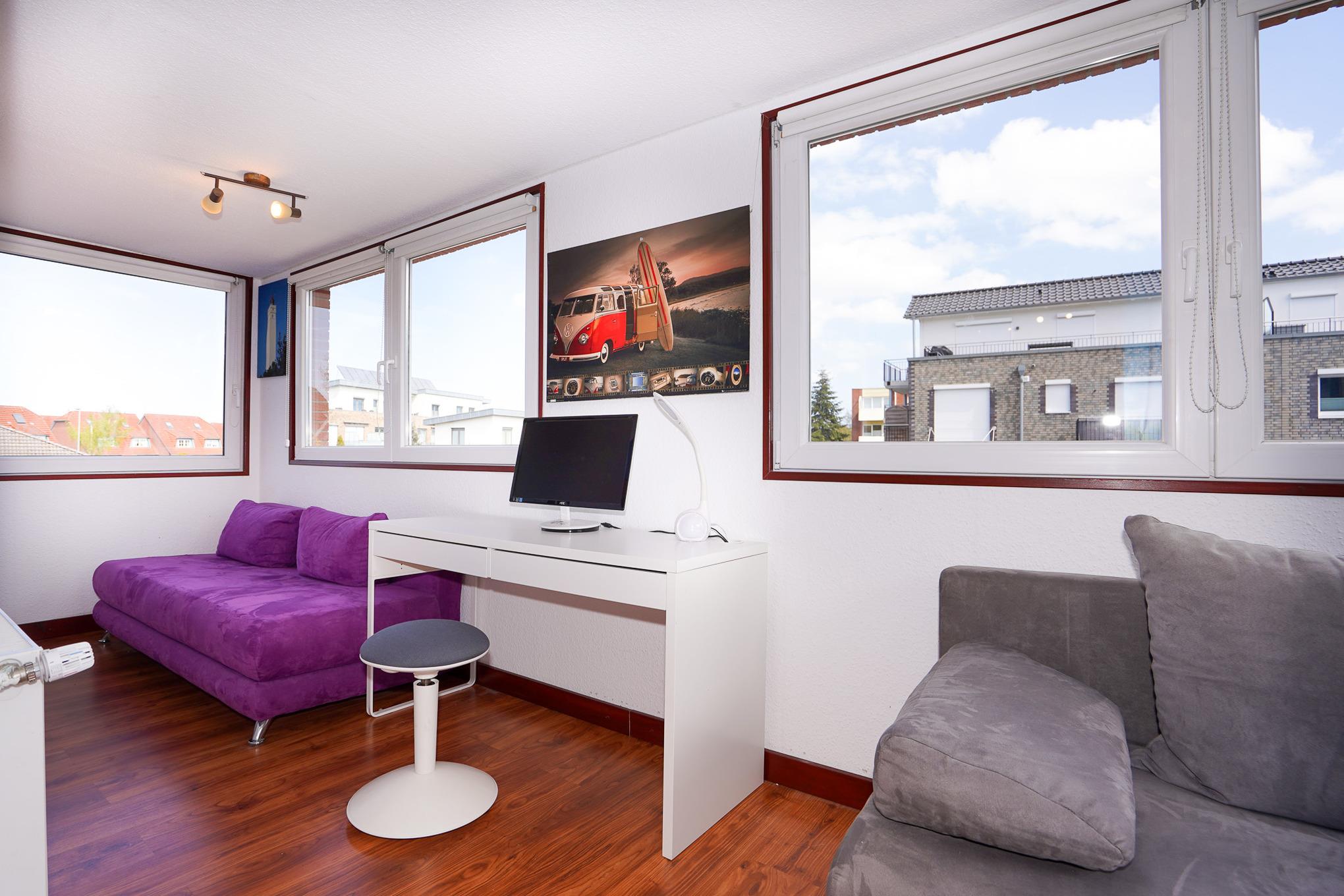 Im Obergeschoss des Hauses finden Sie zwei Schlafzimmer vor, welche insgesamt 4 Betten und 4 weitere Schlafmöglichkeiten auf Klappsofas für junge Gäste bieten. Das erste Schlafzimmer ist mit einem gemütlichen Doppelbett, 3 Kommoden und großzügigen Wandkleiderschränken ausgestattet. Hier finden Sie für junge Gäste Wickelauflage, Babybadewanne, Kinderklappbett, 2 Hochstühle, 1 Turn- und Spielmatte und Reserveklappstühle. Das zweite Schlafzimmer verfügt über zwei Einzelbetten und darüber hinaus in einem angrenzenden Bereich noch über zwei Schlafsofas - folglich 6 Schlafgelegenheiten zur flexiblen Nutzung und im Eingangsbereich über ein Kinderschutzgitter. Ausreichend Ablagefläche für Ihre Kleidung ist natürlich vorhanden. Hier finden Ihre Kinder Platz zum Toben, Spielen oder Fernsehen. Ein Schreibtisch mit Maus & Monitor steht für Ihren Laptop bereit. Natürlich bietet sich dieser Bereich auch für zwei Erwachsene perfekt an.