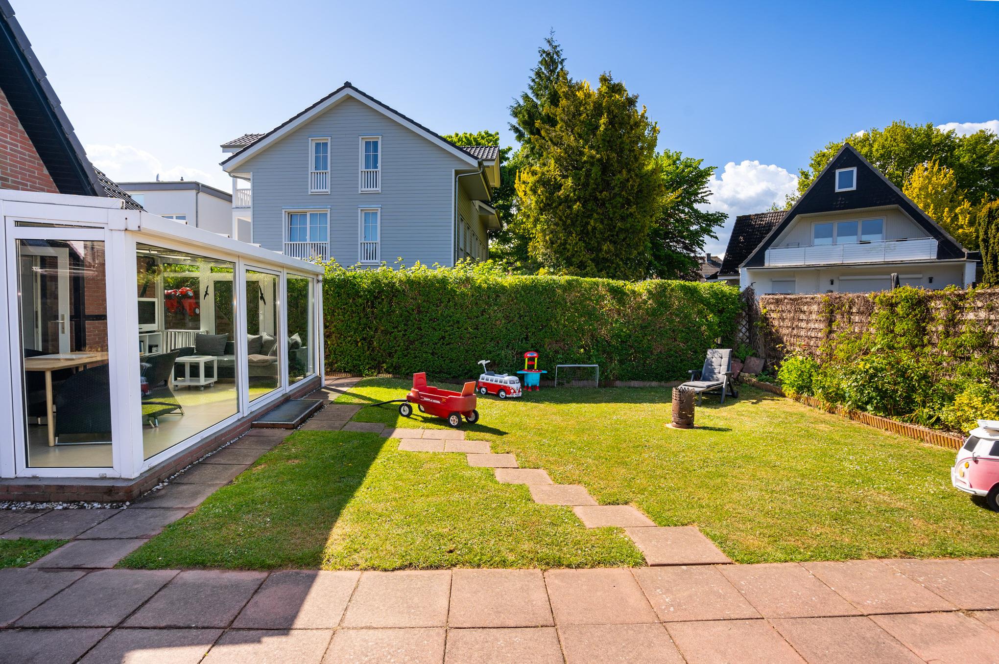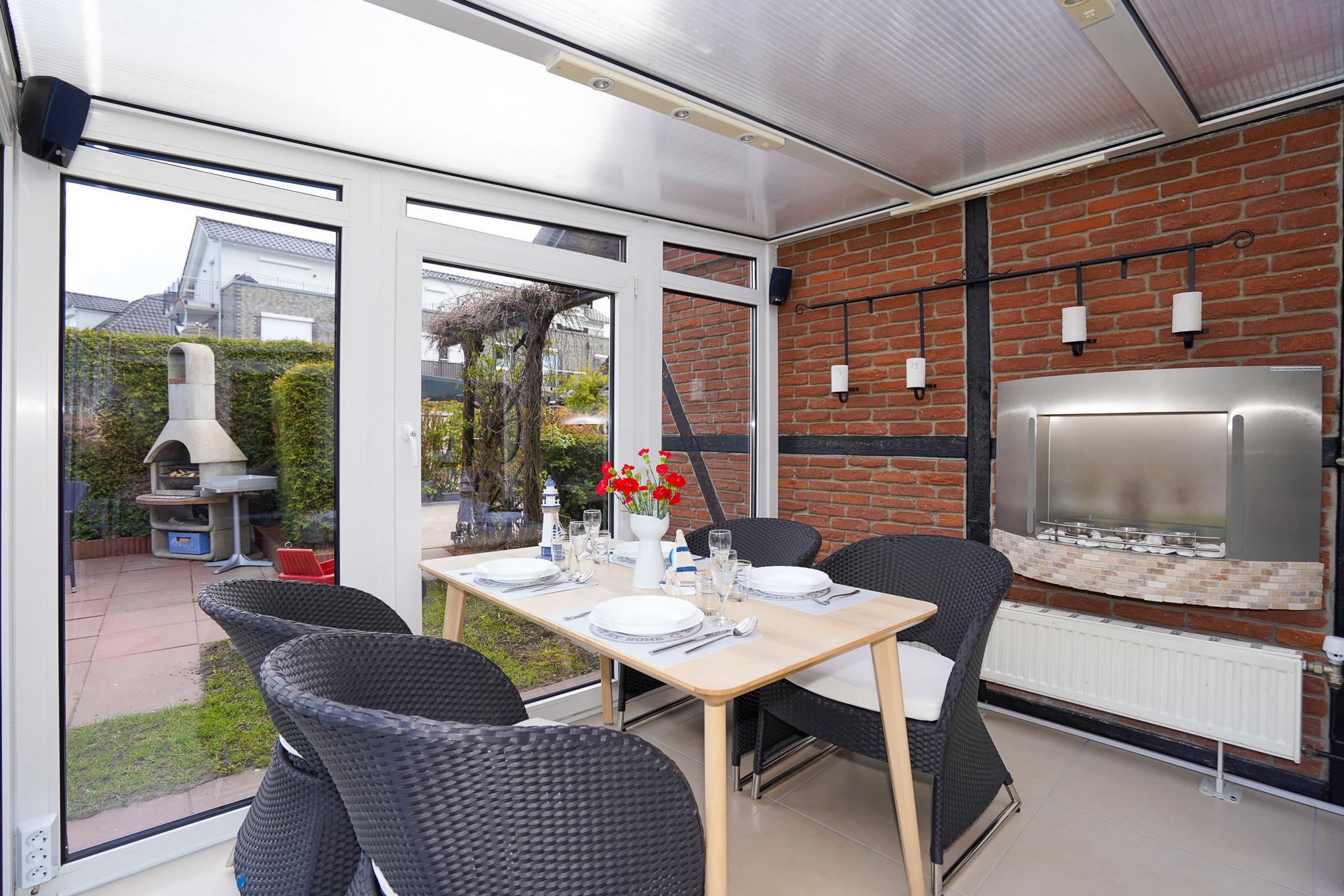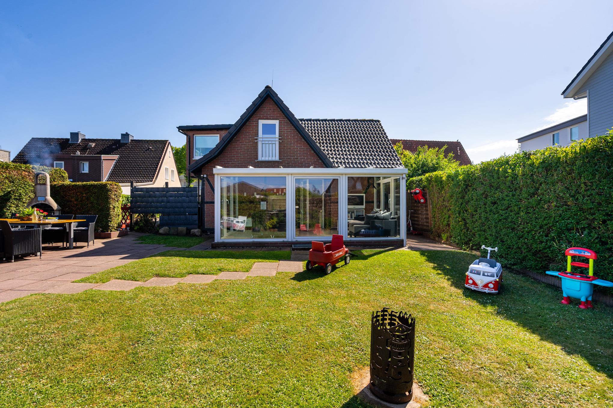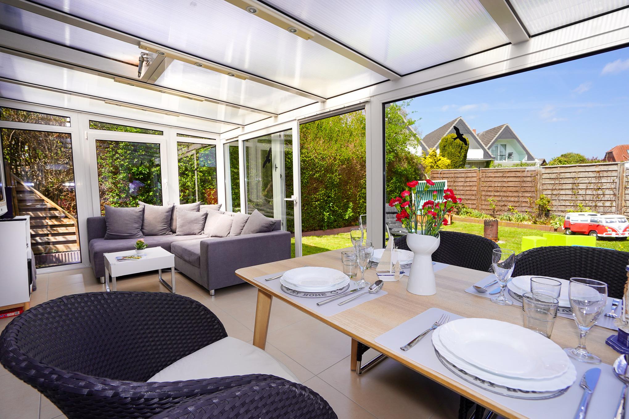 Modernes, familienfreundliches Ferienhaus in Grömitz mit großem Garten, Wintergarten und Sauna, nur wenige Minuten vom Strand entfernt.