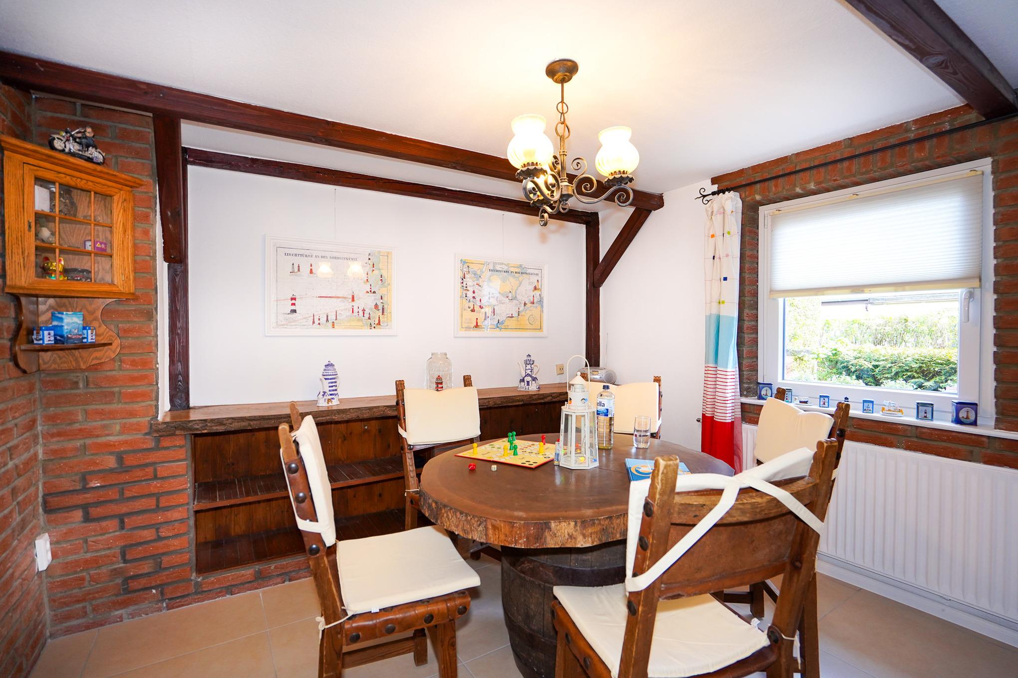 Angrenzend erreichen Sie die neue, voll ausgestattete und großzügige Küche, welche über eine Geschirrspülmaschine, Induktionsherd, Backofen, Kühlschrank, Gefrierschrank und diverse Elektrokleingeräte verfügt. Ihre Mahlzeiten nehmen Sie in dem angrenzenden und rustikalen "Kapitänszimmer" ein.