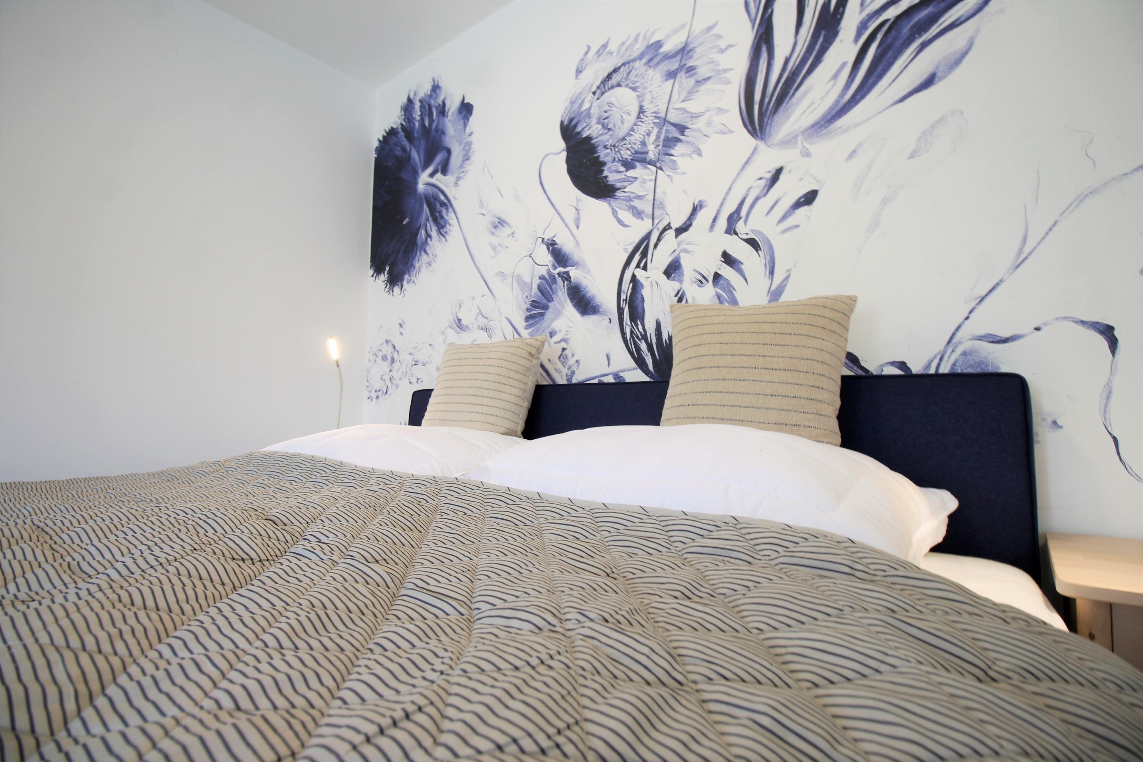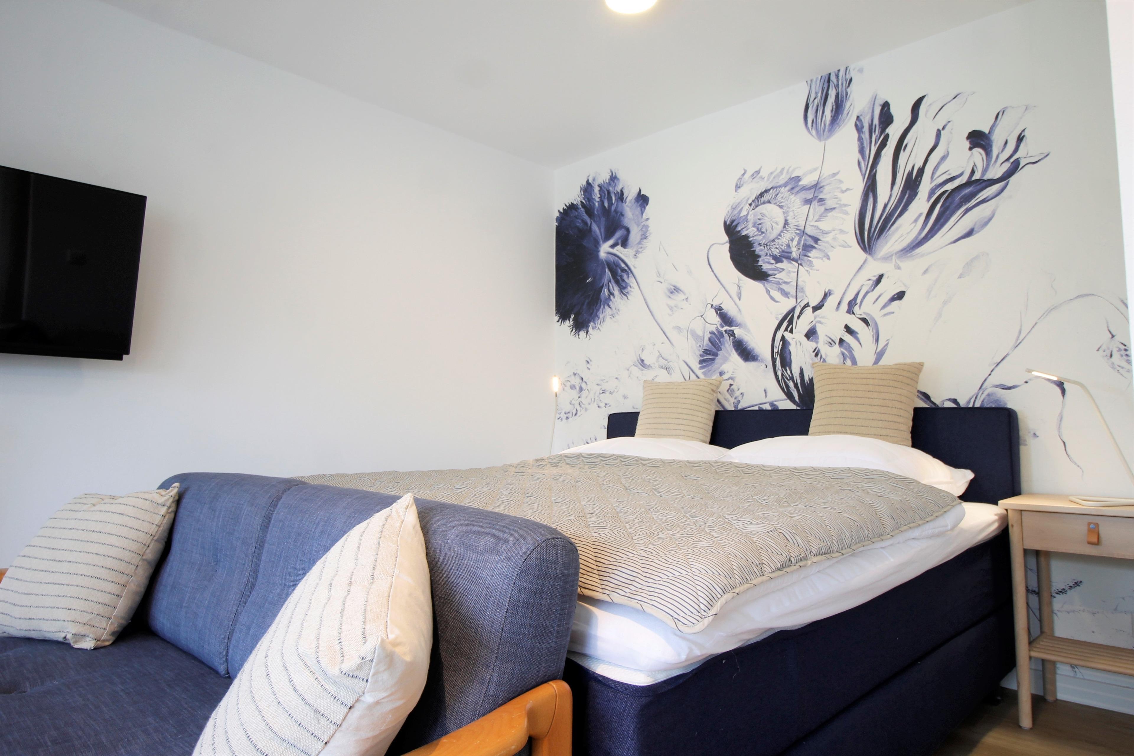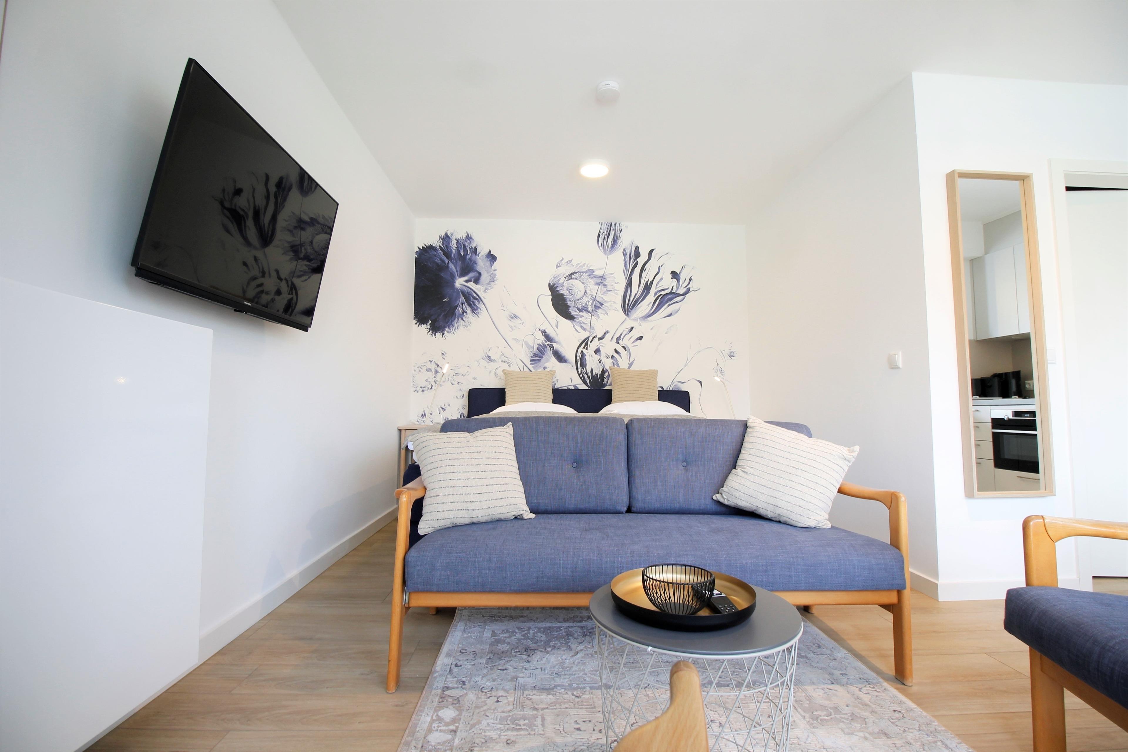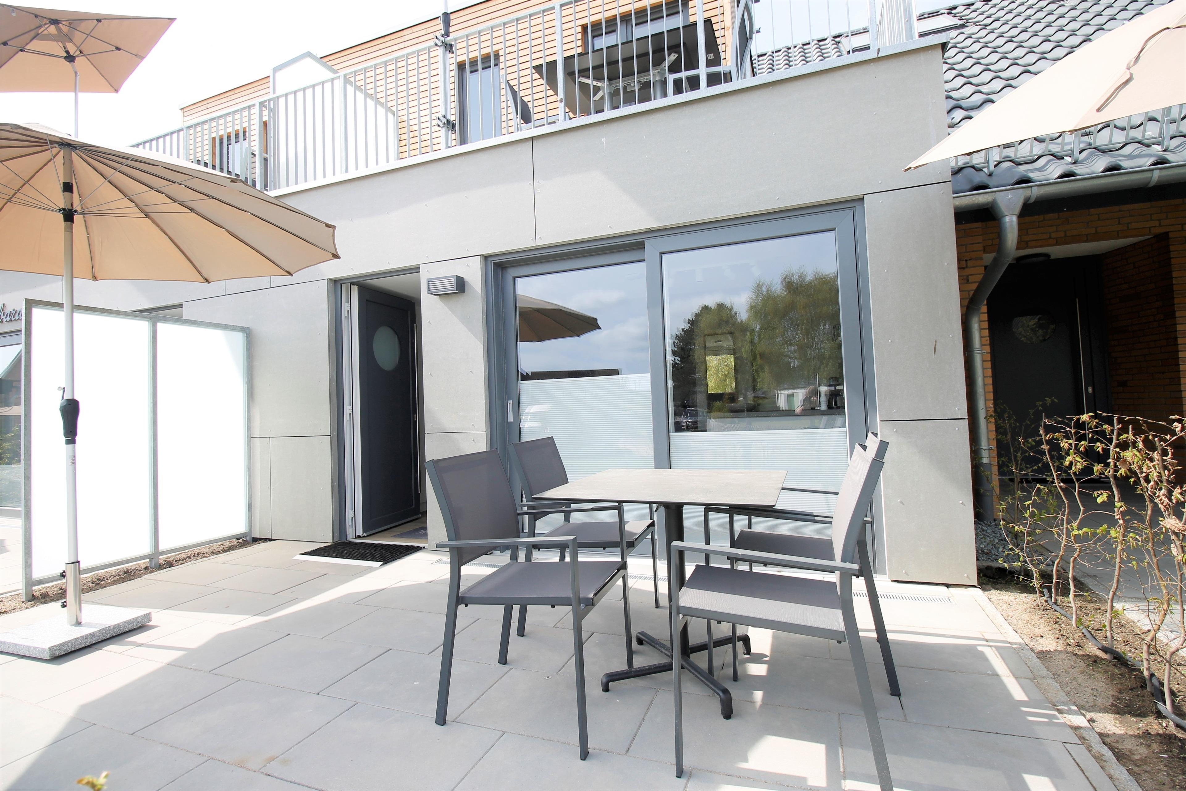 Die 2021/22 frisch sanierte Ferienwohnung besitzt eine eigene großzügige Terrasse (ca. 12 m). Der Schlafbereich bietet mit seinem Boxspringbett aus hochwertigen Taschenfedern optimalen Schlafkomfort. Durch eine flexible Halterung kann sowohl vom Bett als auch vom Sofa und Essbereich ferngesehen werden.
