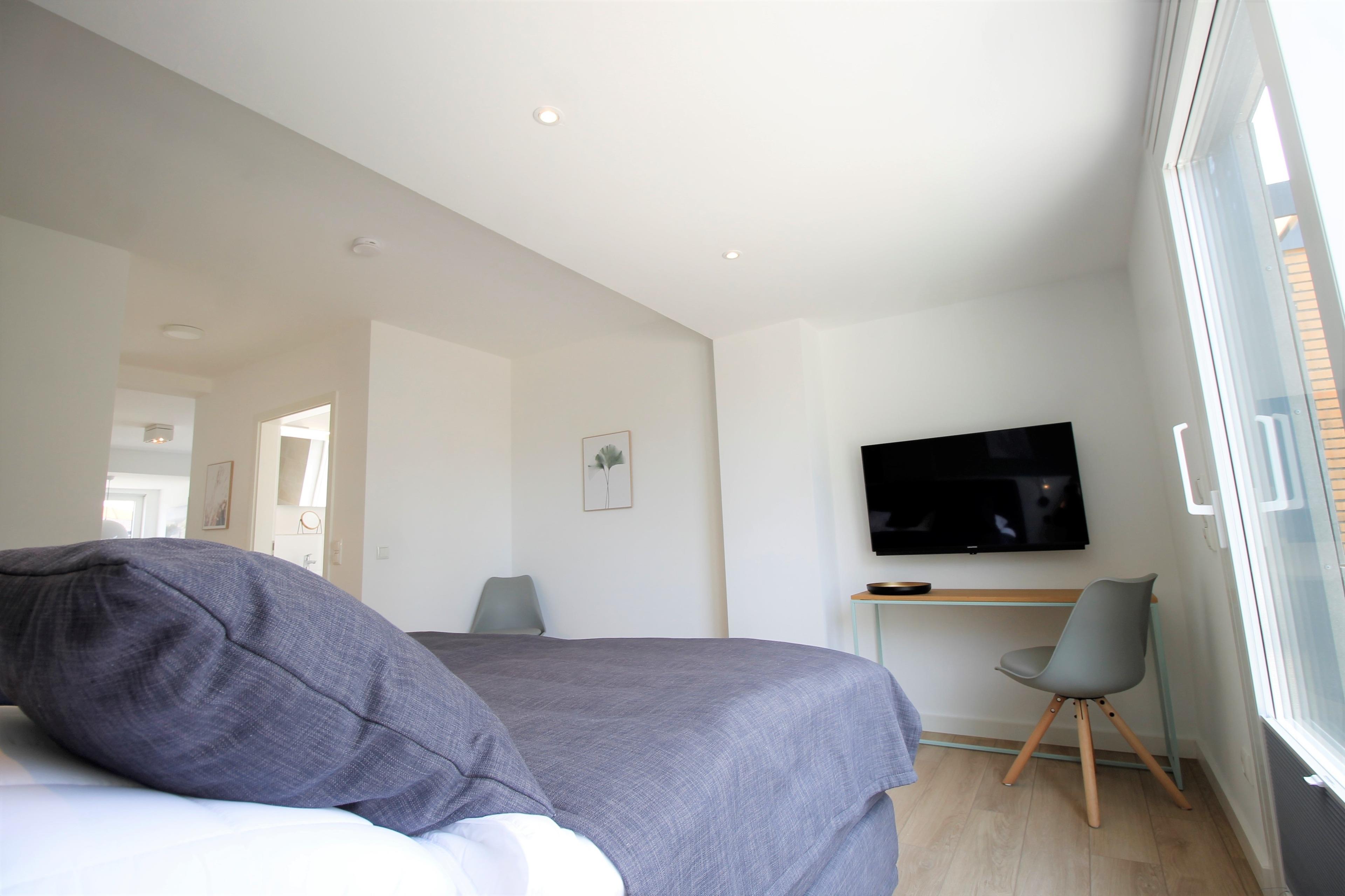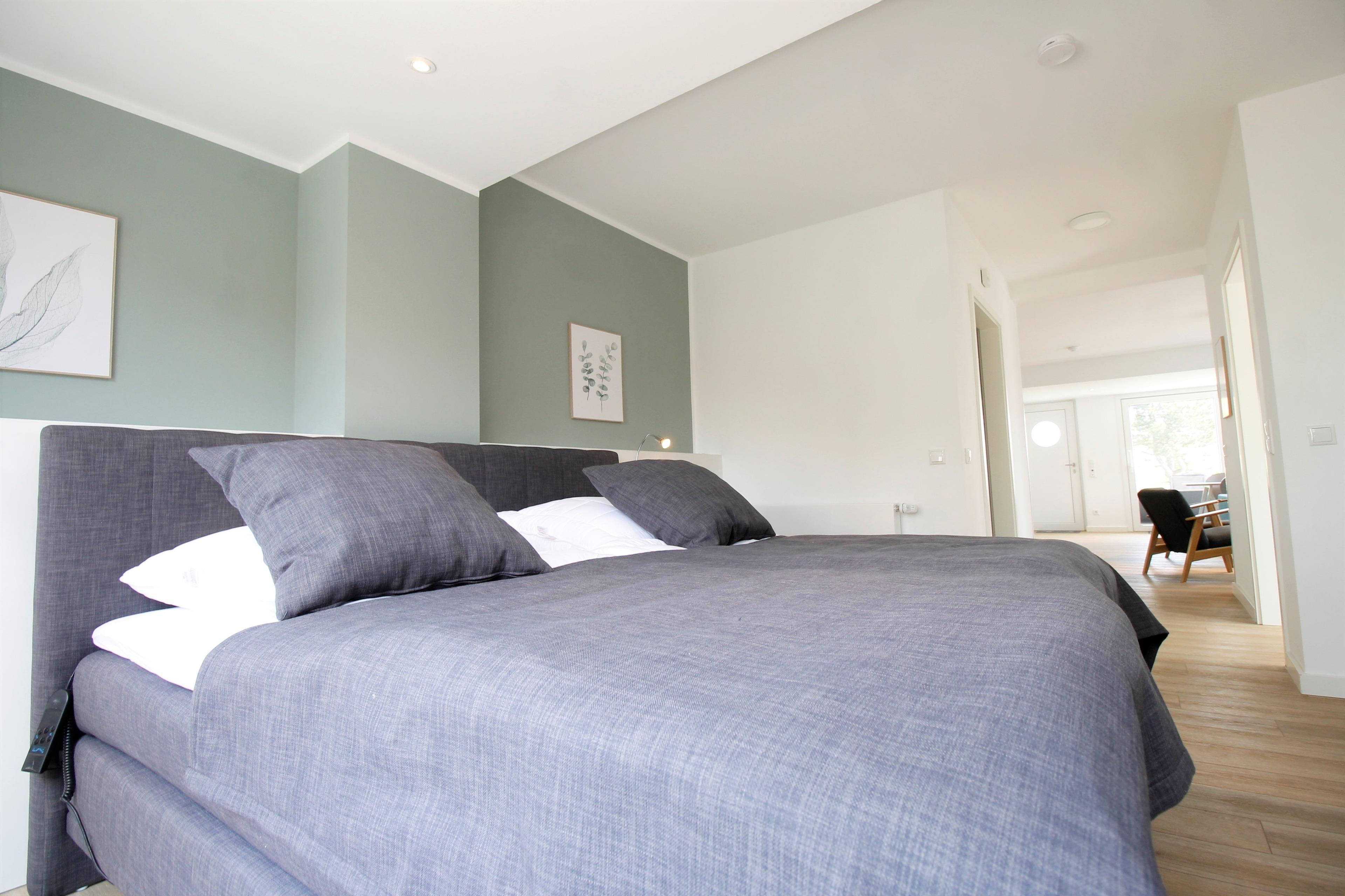 Das mit einer eigenen Terrasse versehene Schlafzimmer verschönert den Aufenthalt durch ein Boxspringbett (200x200cm) mit elektrisch verstellbarem Lattenrost und einem Fernsehgerät. Die Kleidung kann bequem in der begehbaren Kleiderkammer und im Garderobenschrank aufbewahrt werden. Das Schlafsofa bietet Platz für zwei Personen und sorgt durch seine Boxspring-Technologie und zusätzlichem Kaltschaum-Topper für besten Schlafkomfort. Mit ihren zwei eigenen großzügigen Terrassen bietet die Wohnung 10 die Möglichkeit von morgens bis abends die Grömitzer Sonne zu genießen.