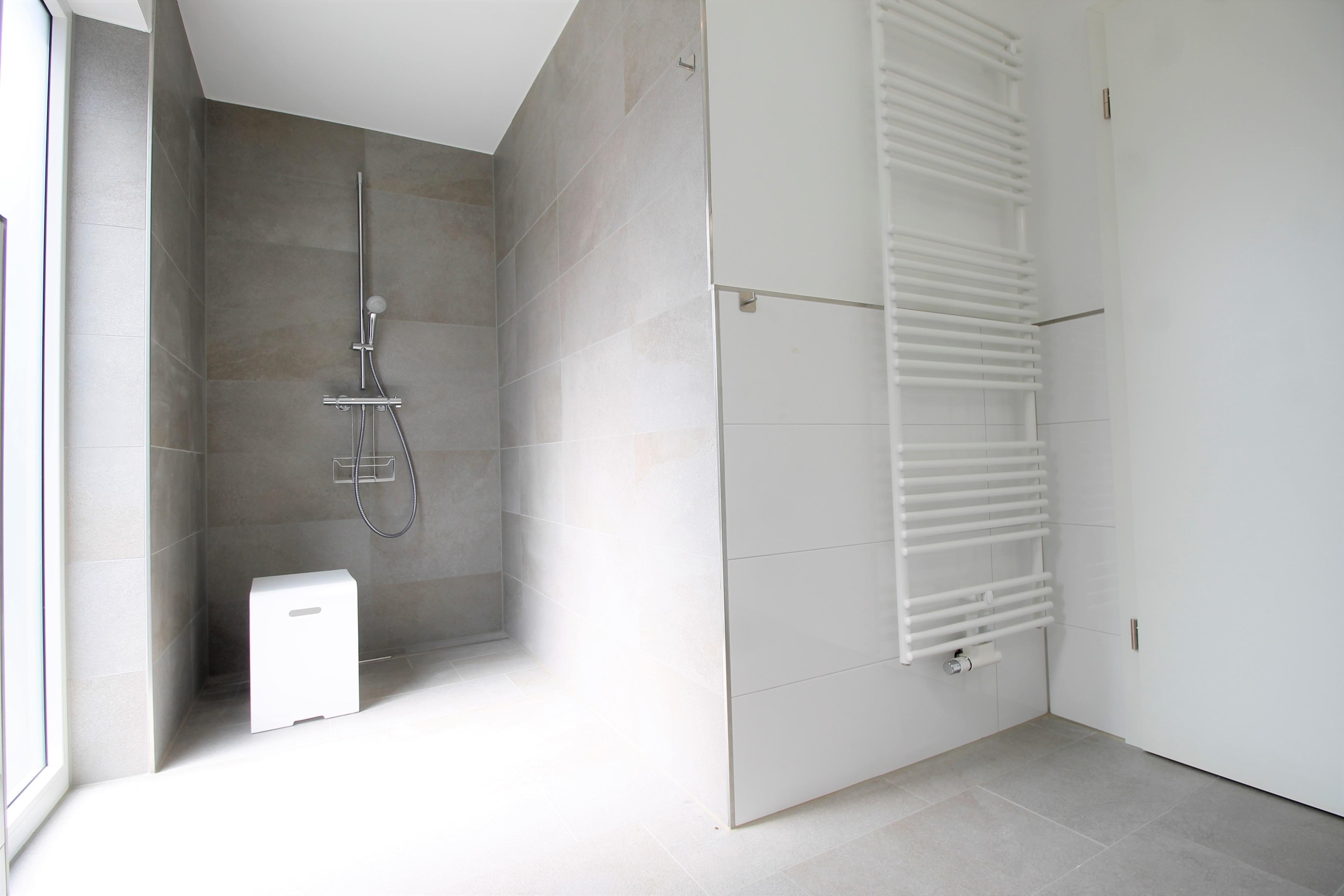 Das geräumige Badezimmer verfügt über eine bodengleiche Walk-in-Dusche, einen stabilen Duschhocker, Haltegriffe im Dusch- und WC-Bereich und einen kippbaren Spiegel. Somit ist das Badezimmer äußerst komfortabel.