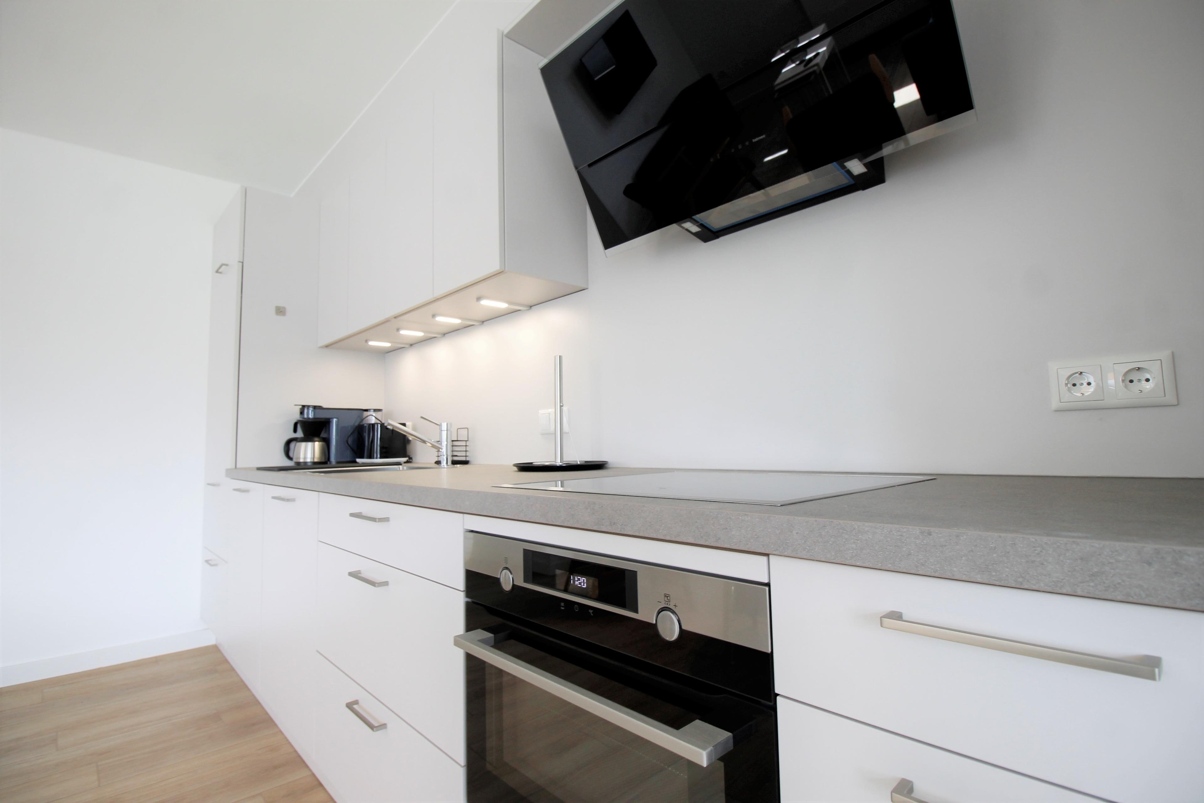 Der Essbereich bietet Platz für bis zu sechs Personen und ist durch seine Lage am bodentiefen Terrassenfenster sehr hell und freundlich. Die Küche ist u.a. mit Gefrierfach, Kaffeemaschine (Filter- und Espressomaschine), 4-Platteninduktionsherd, Backofen-Mikrowellenkombigerät, Ablufthaube und einer Spülmaschine ausgestattet.