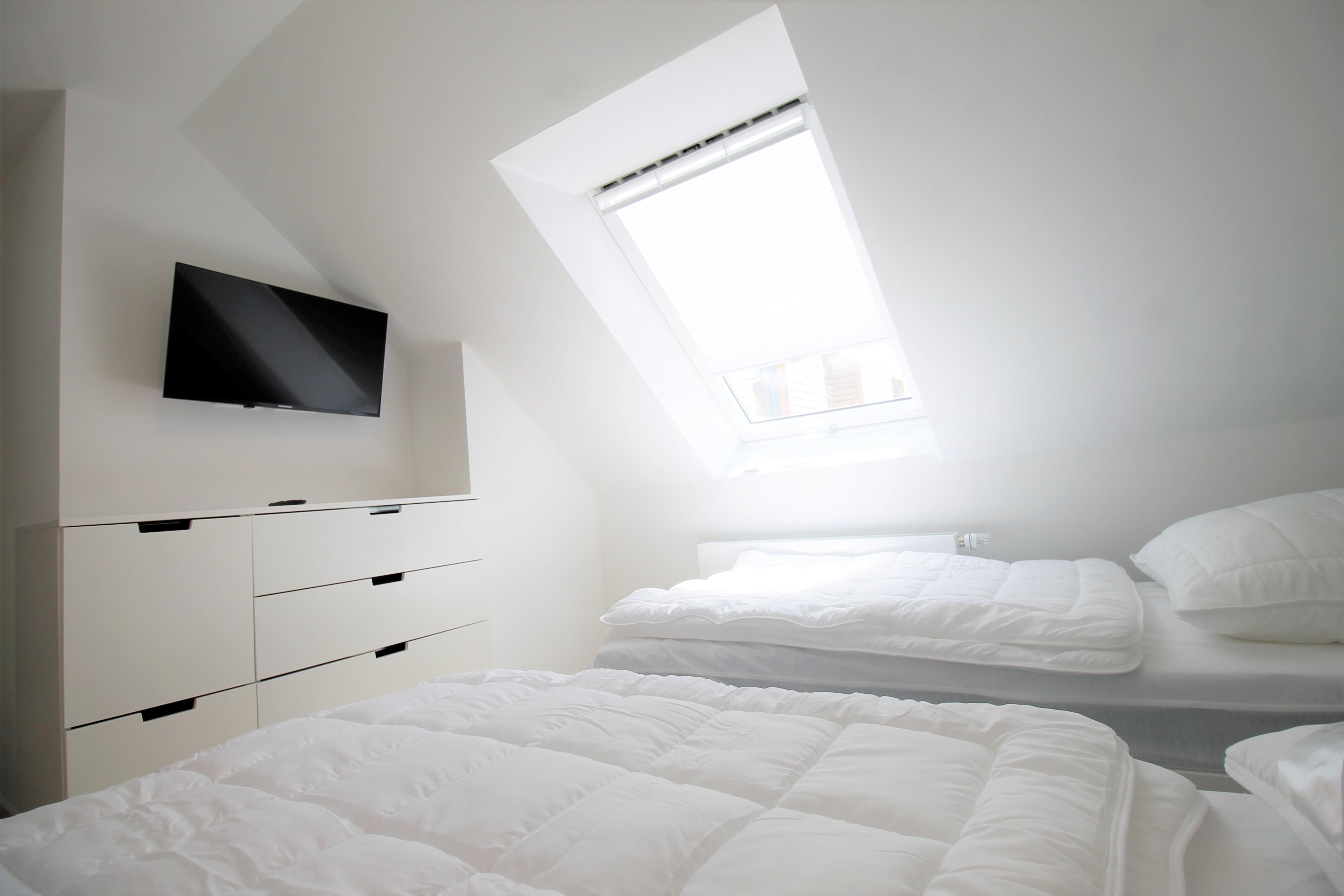 Das kleine Schlafzimmer verschönert den Aufenthalt durch ein Boxspringbett (180x200cm), dass bei Bedarf auch auseinandergeschoben werden kann und durch ein Fernsehgerät. Im zweiten Schlafzimmer befinden sich drei Einzelbetten (90x200cm) und ein Fernseher.