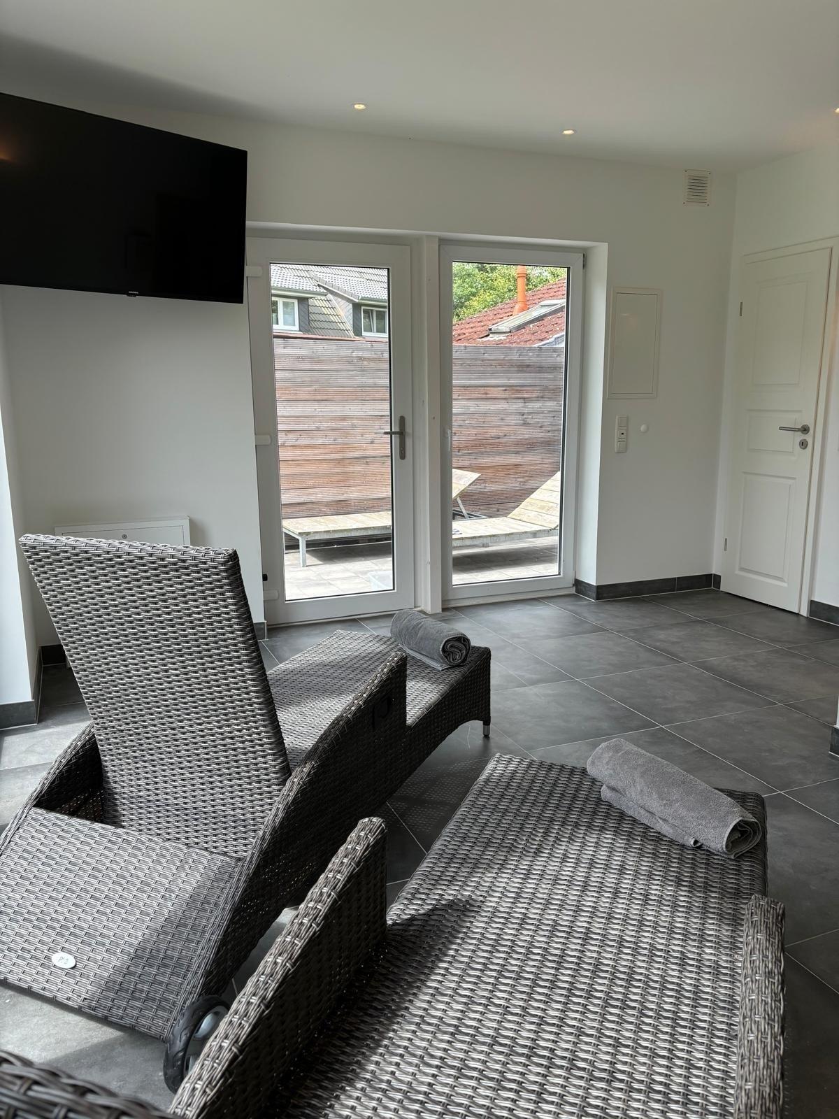 Im Garten befindet sich ein Wellnesshaus mit Sauna, Whirlbadewanne, Dusche, WC und Ruhebereich mit TV.
