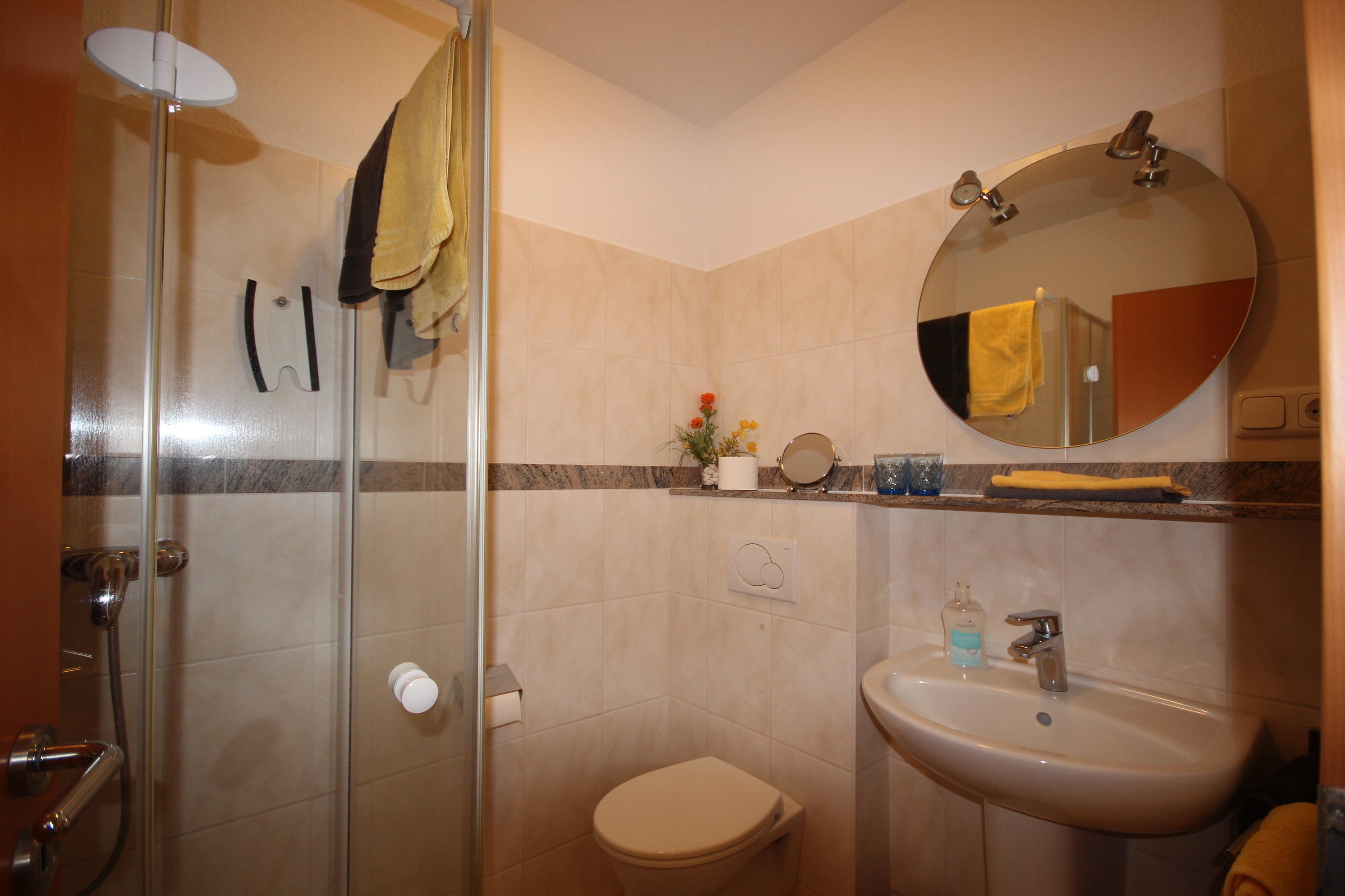 Im hell gefliesten Bad befindet sich eine Duschkabine, Waschbecken und WC.
