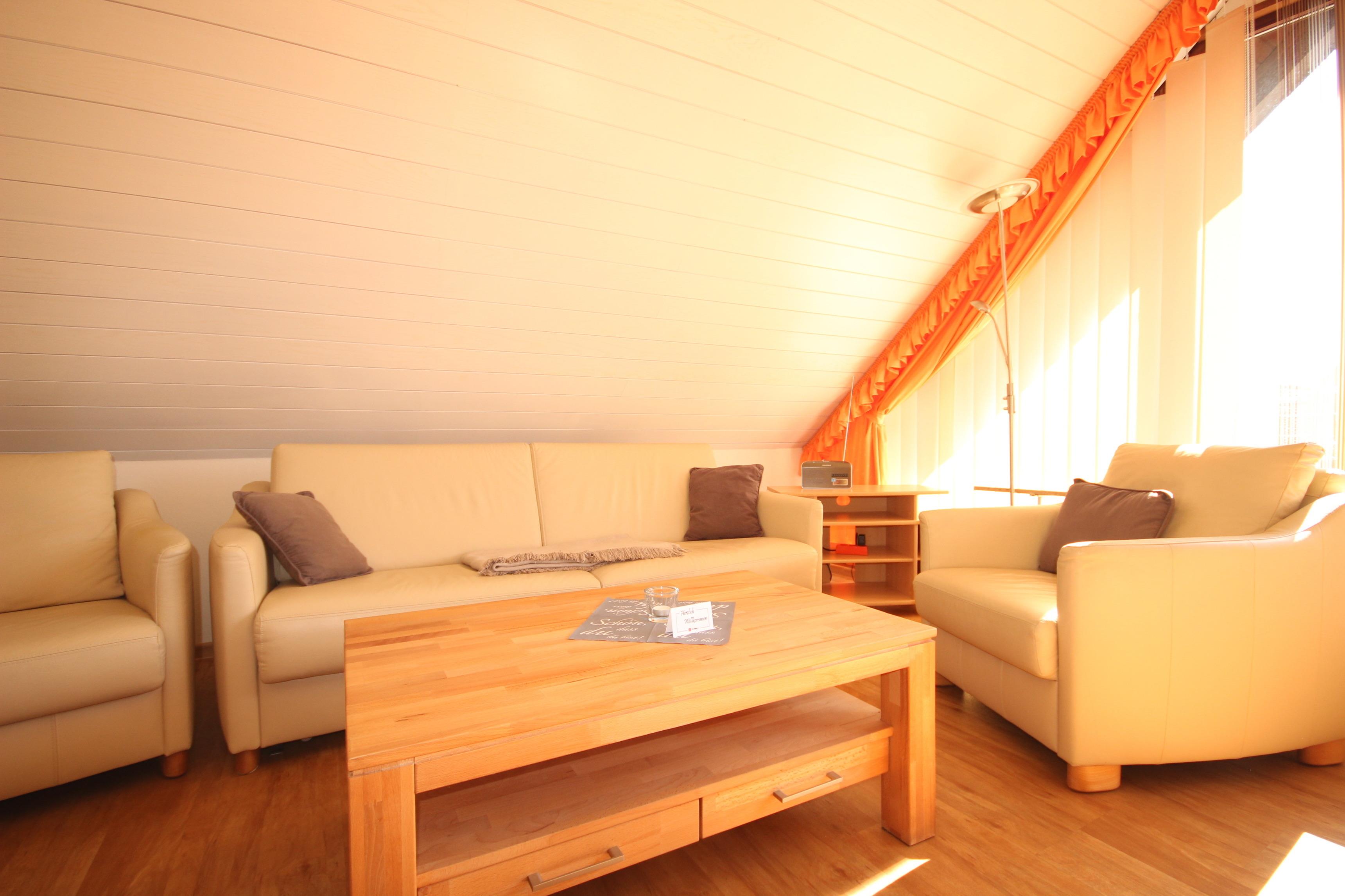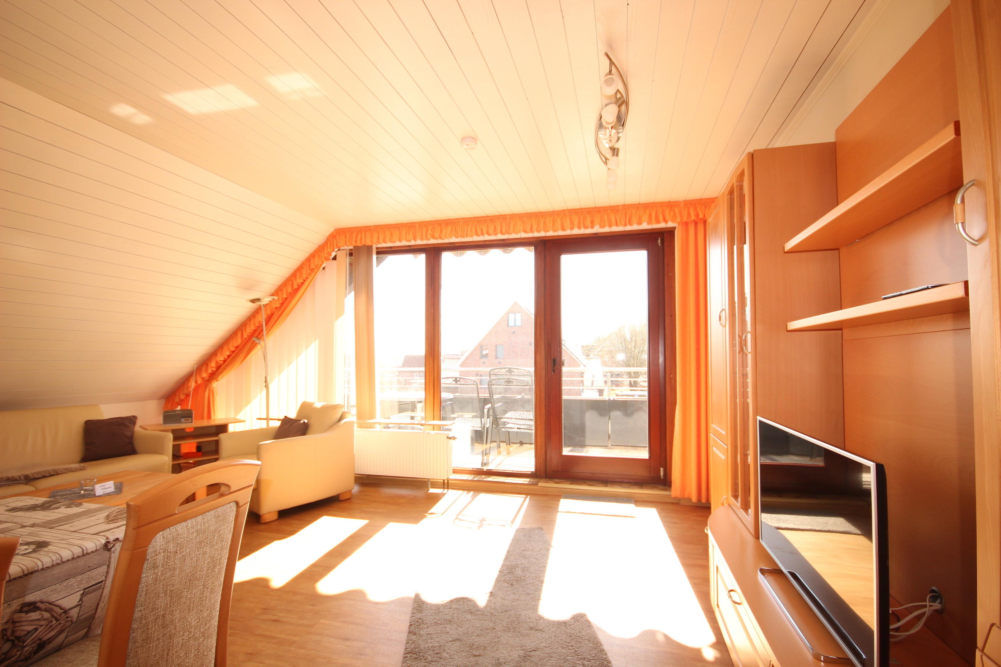 Das geschmackvolle Wohn-/Esszimmer verfügt über eine gemütliche Couch, TV, CD-Radio, Essplatz & Zugang zum Süd-West-Balkon mit Markise.