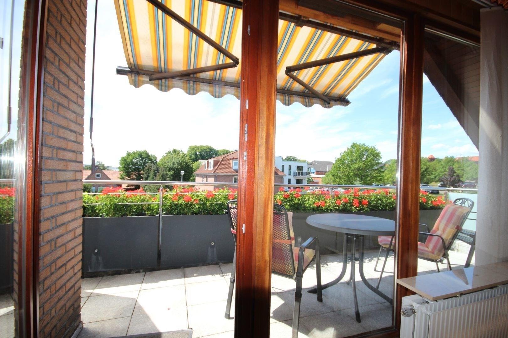 Das helle Wohn-/Esszimmer verfügt über eine bequeme Couch, TV, CD-Radio, Essplatz & Zugang zum Süd-West-Balkon mit Markise.