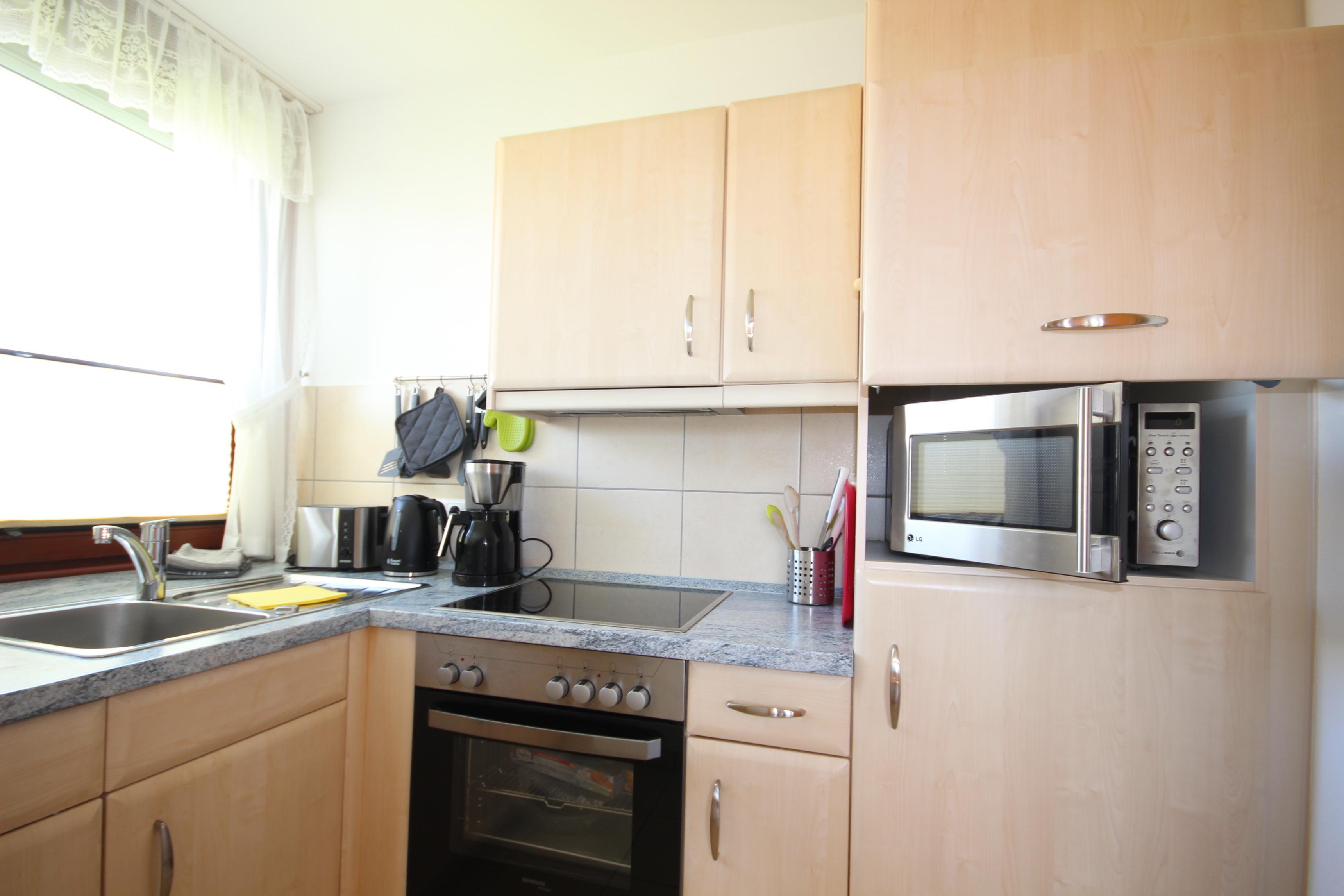 Die offene Küche ist mit einem Cerankochfeld, Backofen, Kühlschrank mit Gefrierfach, Geschirrspüler sowie den üblichen Küchengeräten sehr gut ausgestattet.