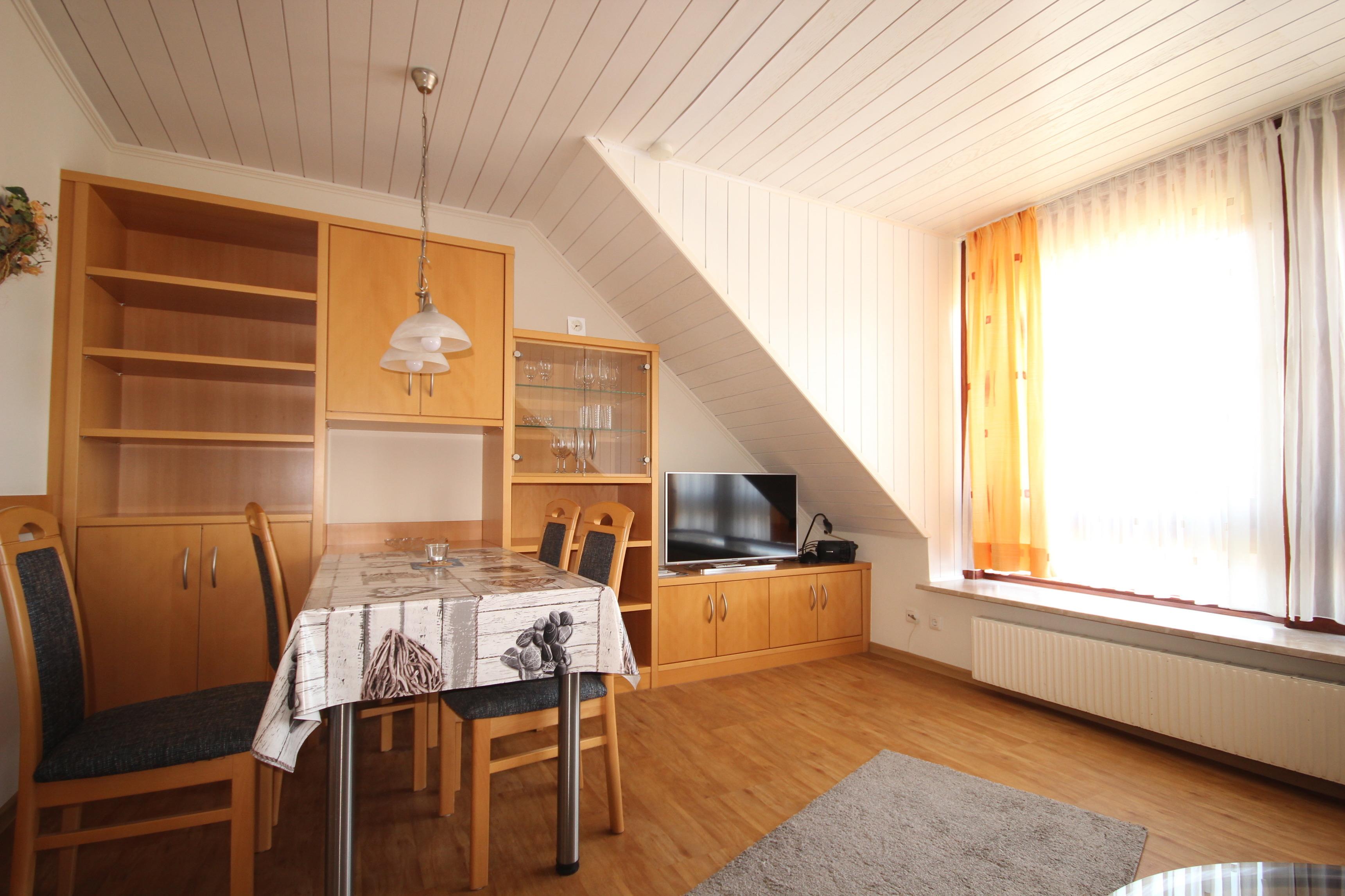 Das geschmackvolle Wohn-/Esszimmer verfügt über eine gemütliche Couch, TV, CD-Radio und Essplatz.
