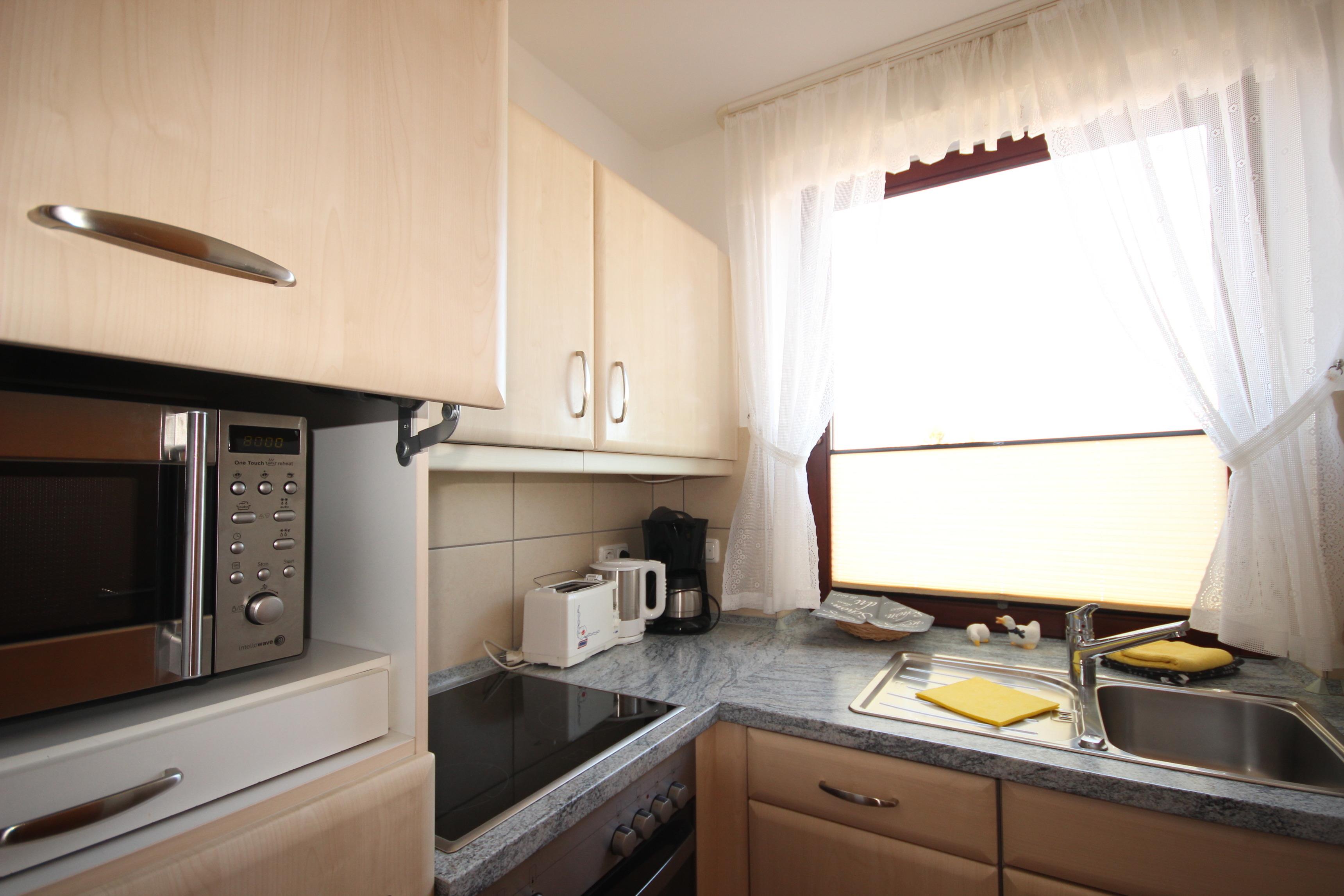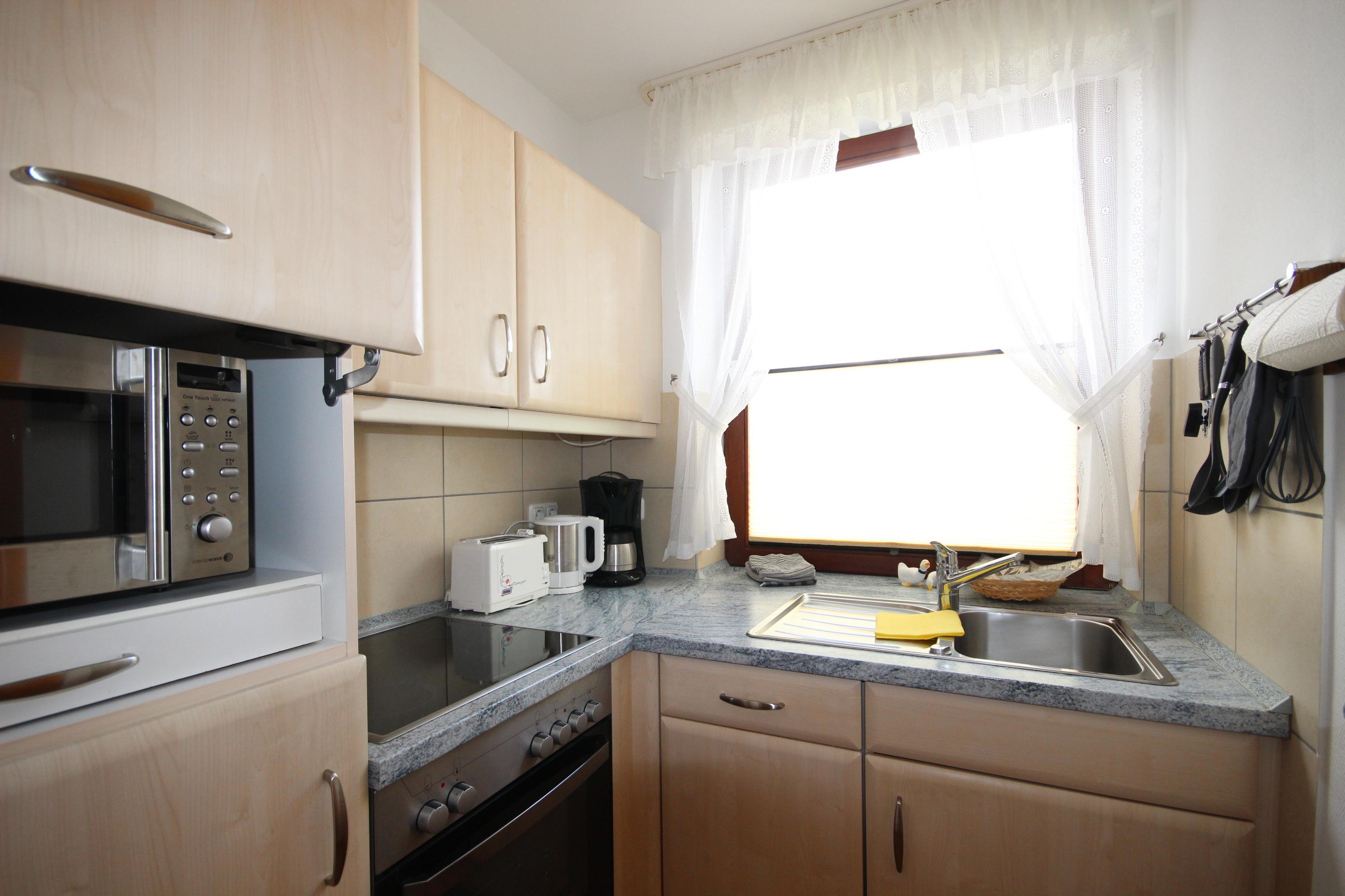 Die Küche ist mit einem Cerankochfeld, Backofen, Kühlschrank mit Gefrierfach, Geschirrspüler sowie den üblichen Küchengeräten sehr gut ausgestattet.