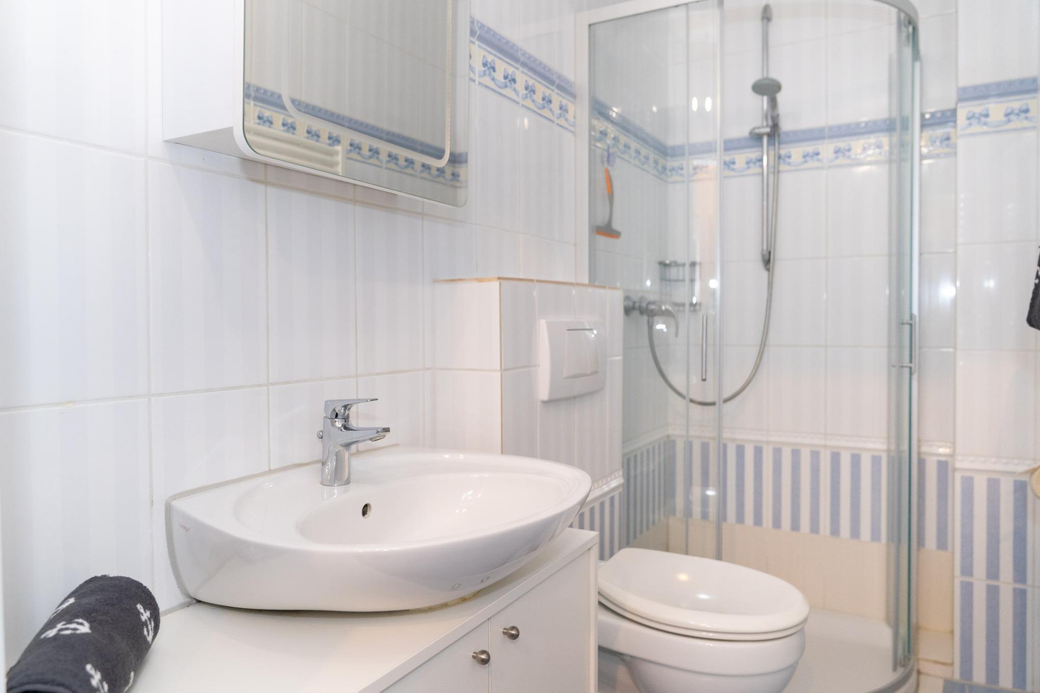 Das helle und im maritimen Stil gestaltete Badezimmer bietet neben einer Dusche, Waschbecken und WC auch eine Handtuchheizung.
