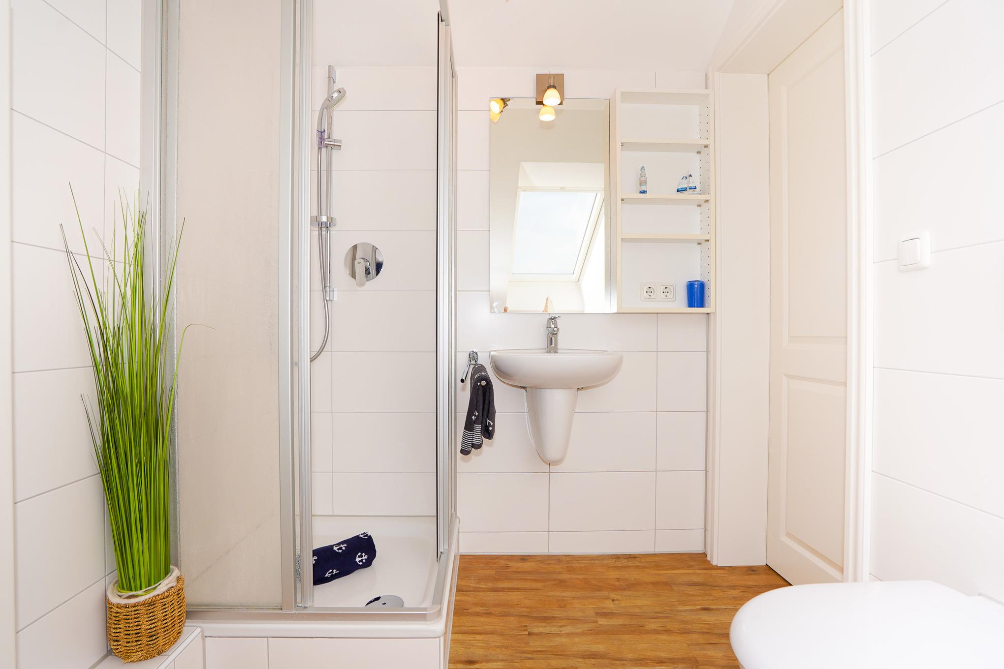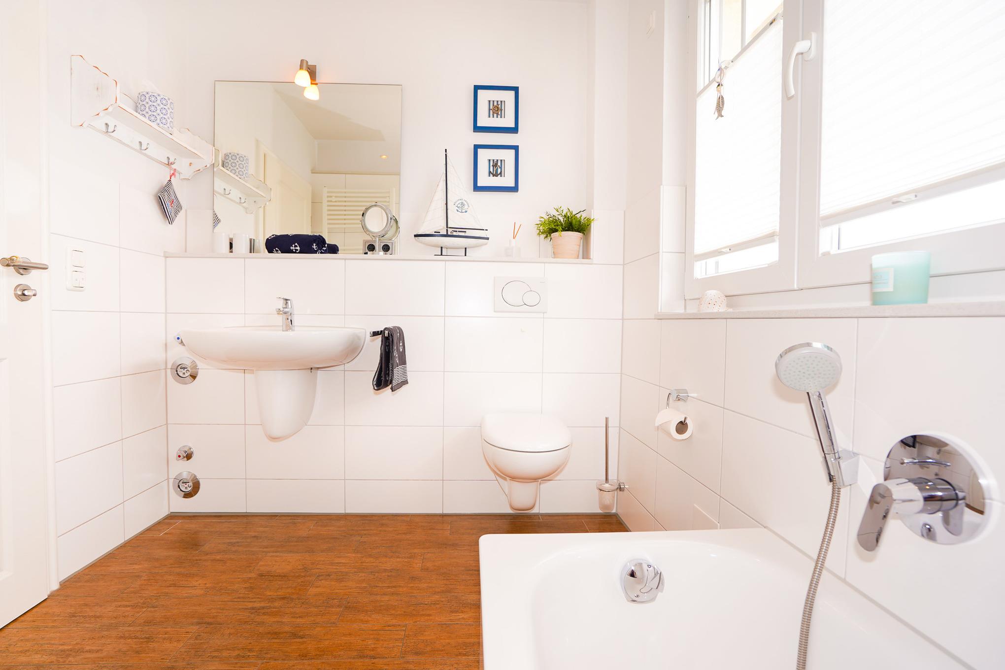 Das helle Badezimmer hat eine bodengleiche Dusche sowie eine Badewanne und ist mit Fußbodenerwärmung, Handtuchwärmer und Föhn ausgestattet.