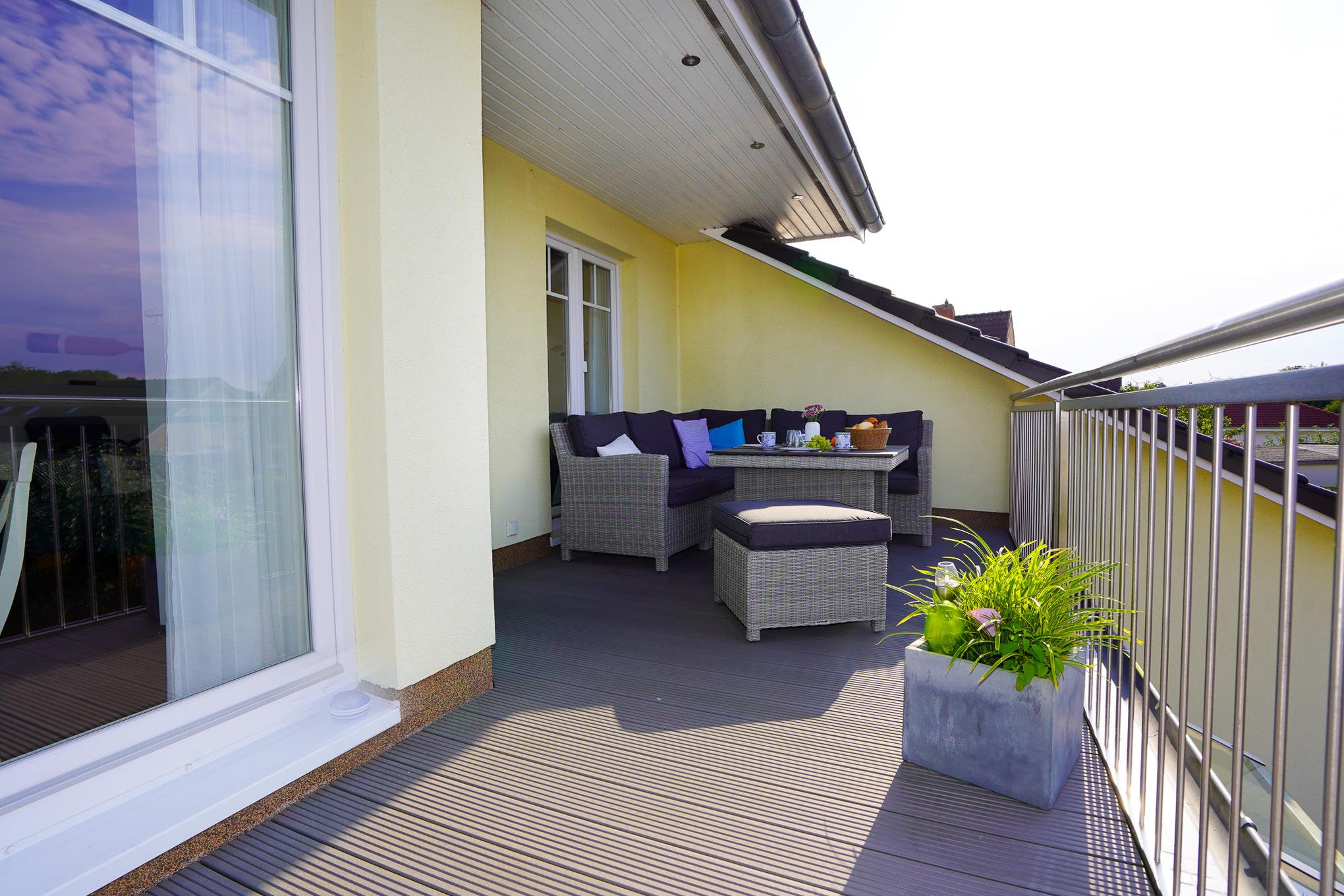 Moderne Ferienwohnung in Grömitz mit Balkon, zwei Schlafzimmern und maritimem Landhausstil für erholsame Tage am Meer.