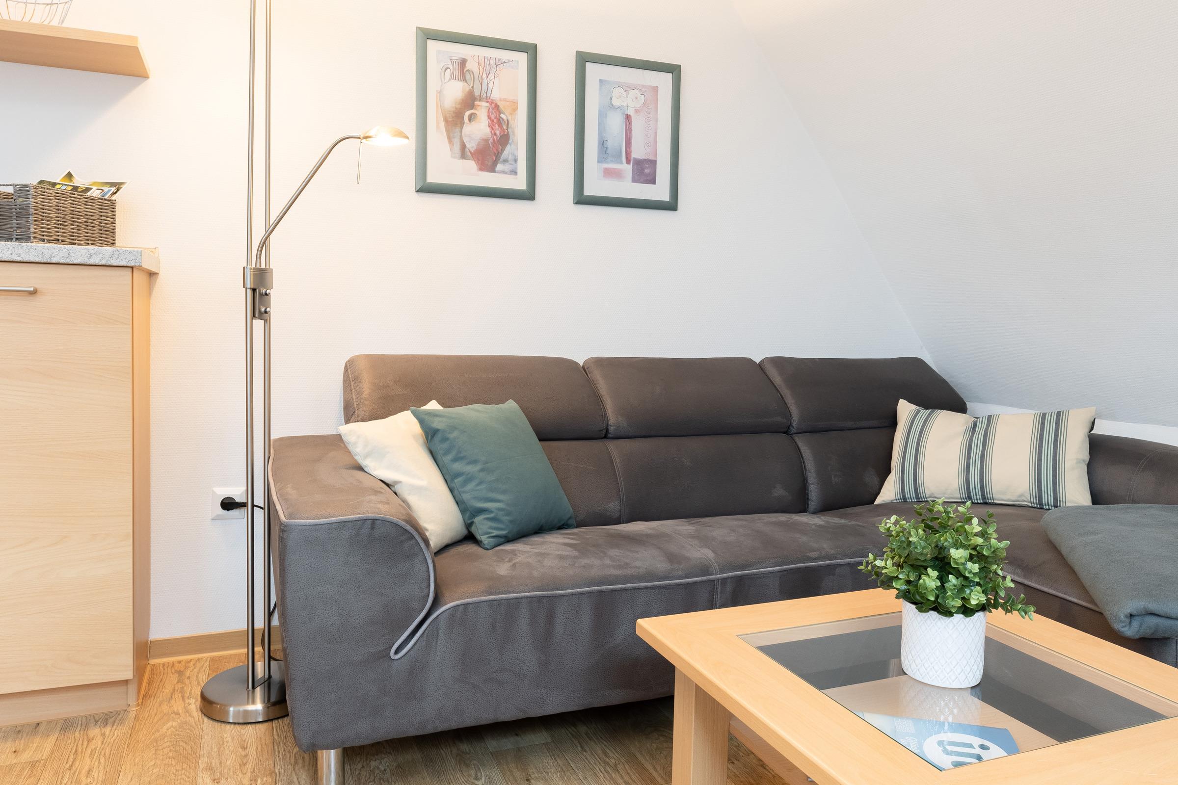 Die 3-Zimmer-Wohnung (55 qm) in der ersten Etage mit 16 qm Dachterrasse erlaubt sogar einen kleinen Blick über den Deich auf die Ostsee. Mit den 2 Schlafräumen ideal für die kleine Familie oder auch 2 Erwachsene, die getrennte Schlafmöglichkeiten suchen – bis zu 3 Personen fühlen sich hier gleichermaßen wohl.