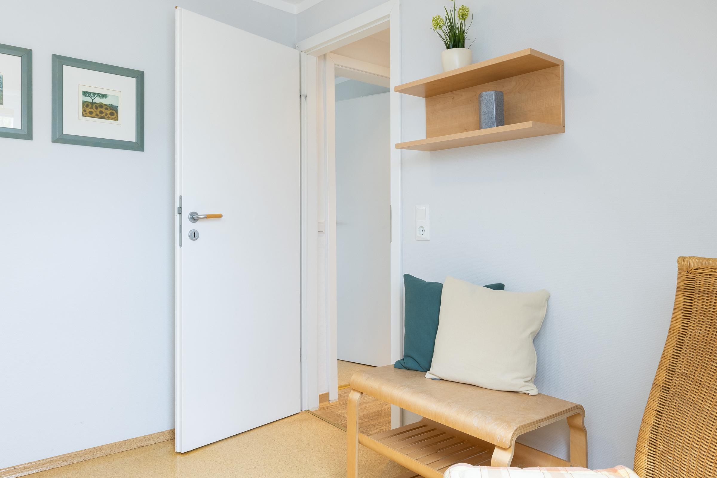 Das kleinere Schlafzimmer ist mit Einzelbett (90 x 200 cm) ohne Fußteil und Kleiderschrank sowie Stuhl und Ablagemöglichkeiten ausgestattet. Die Fußböden sind ausgelegt mit Kork – allergikerfreundlich.