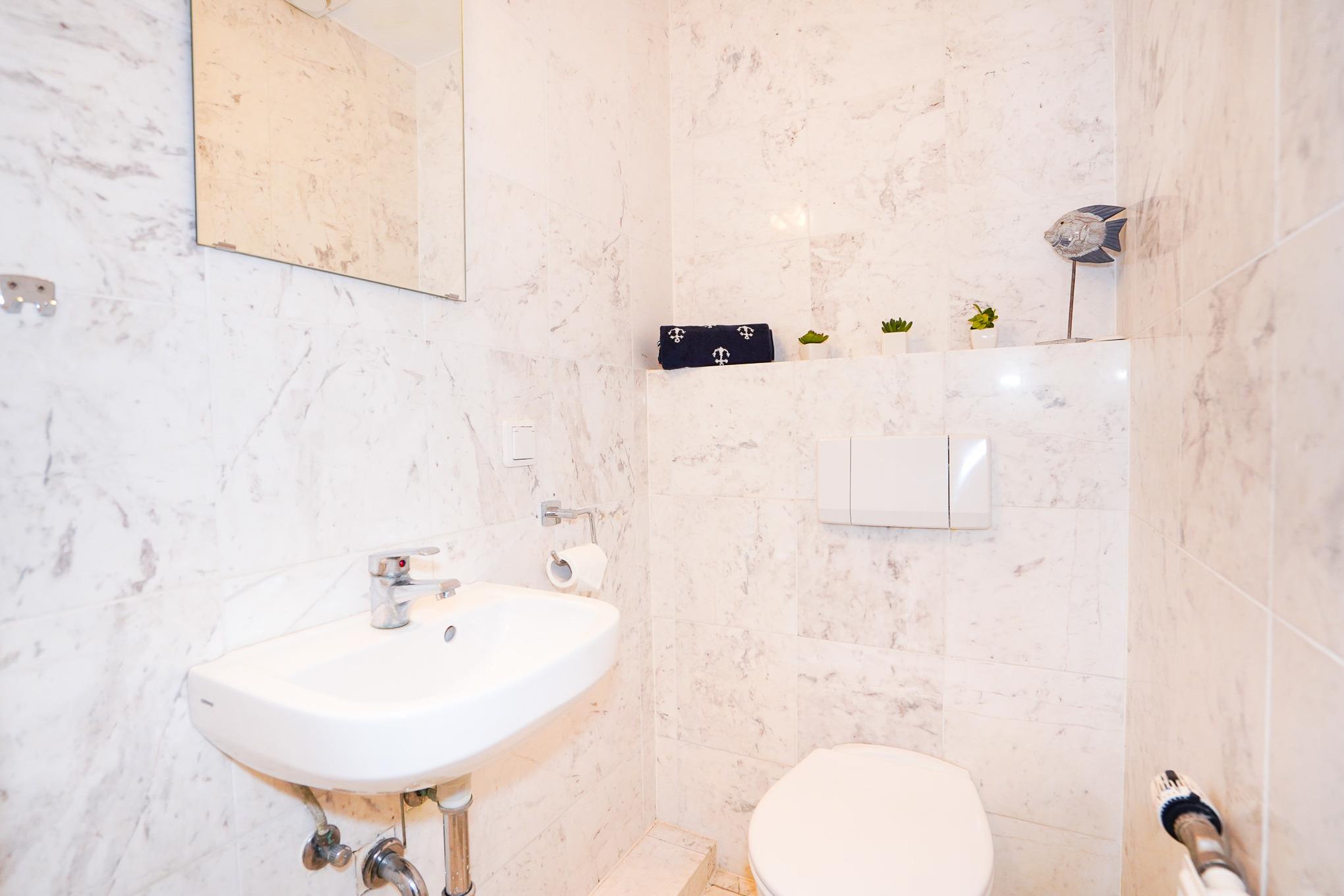 Beide Schlafzimmer verfügen über große Doppelbetten, Kleiderschränke und jeweils einen Sessel. In einem Schlafzimmer ist zusätzlich ein weiterer Fernseher vorhanden. Das in Marmor gehaltene Badezimmer ist mit einer Dusche und einer Badewanne ausgestattet. Zusätzlich ist ein Gäste-WC vorhanden.