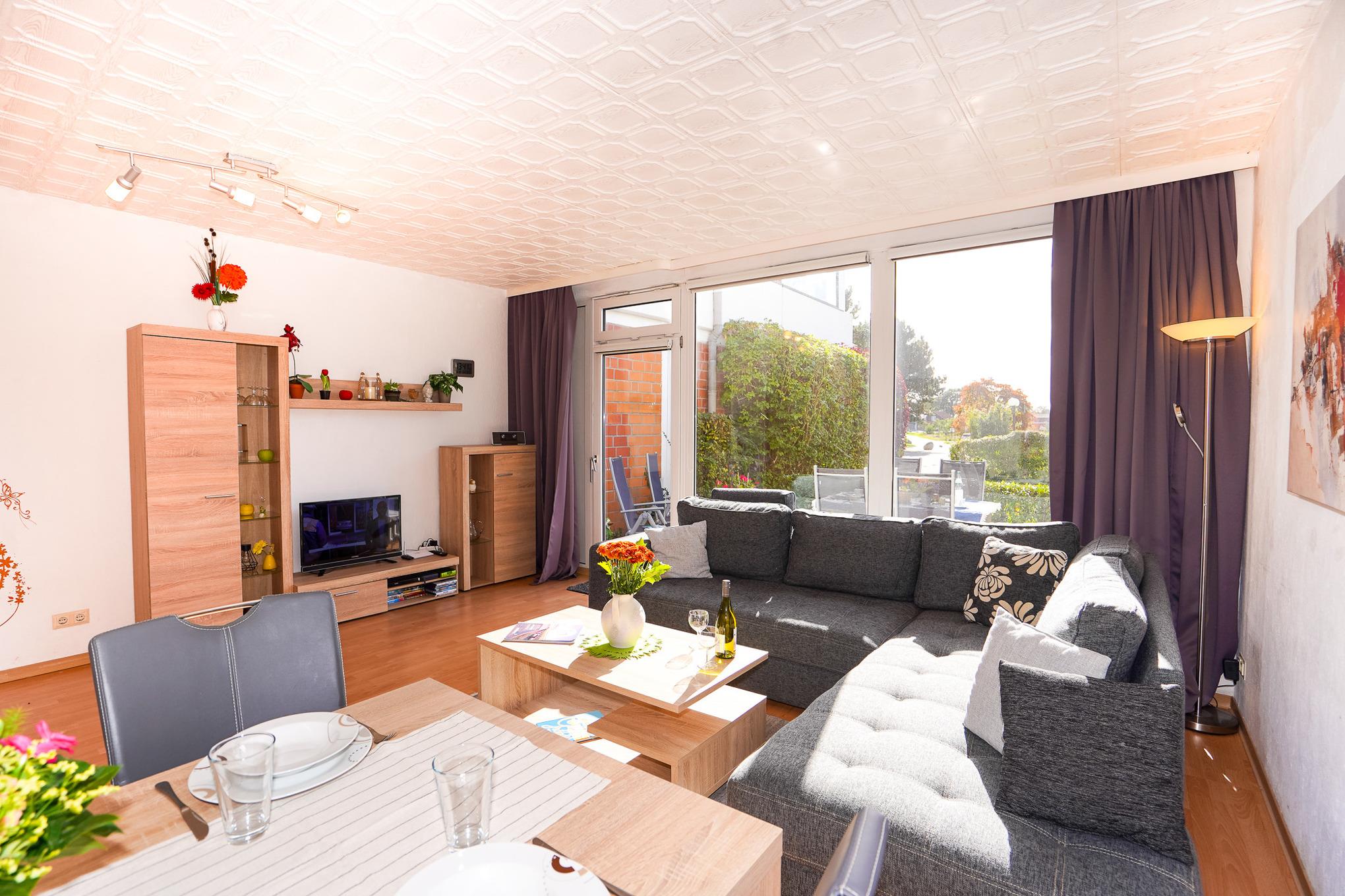Das helle und freundliche Wohn- /Esszimmer hat einen direkten Zugang zu einer sonnigen Terrasse in Süd-West Ausrichtung mit angrenzendem Gemeinschaftsgarten. Es ist mit einem Essplatz für 4 Personen, einer bequemen Eckcouch und einem Schrankbett (zweimal 80 x 200 cm) ausgestattet. Zur Unterhaltung stehen ein Flachbildfernseher, DVD-Player, Mini-Stereoanlage und kostenloses W-Lan zur Verfügung.