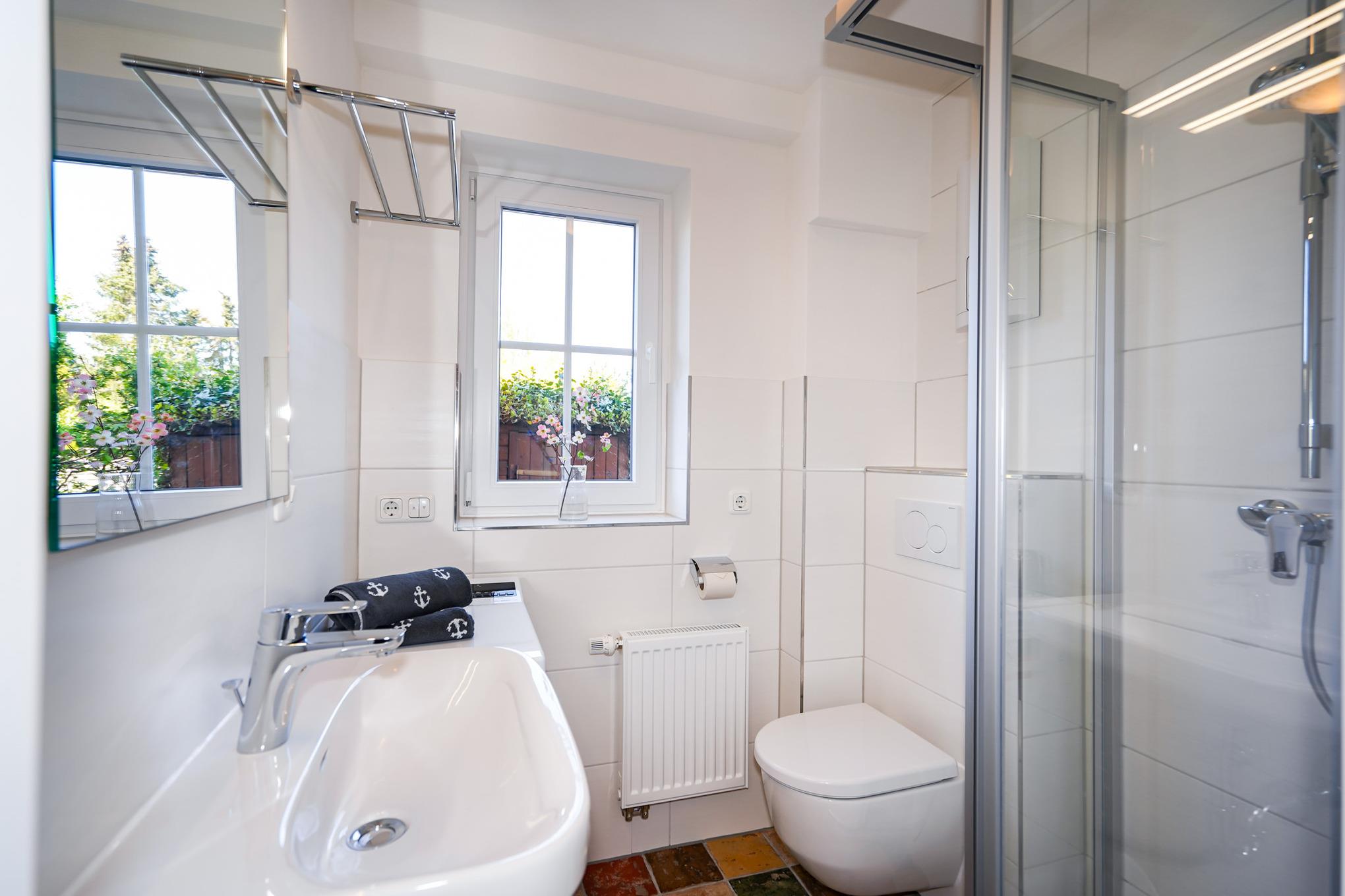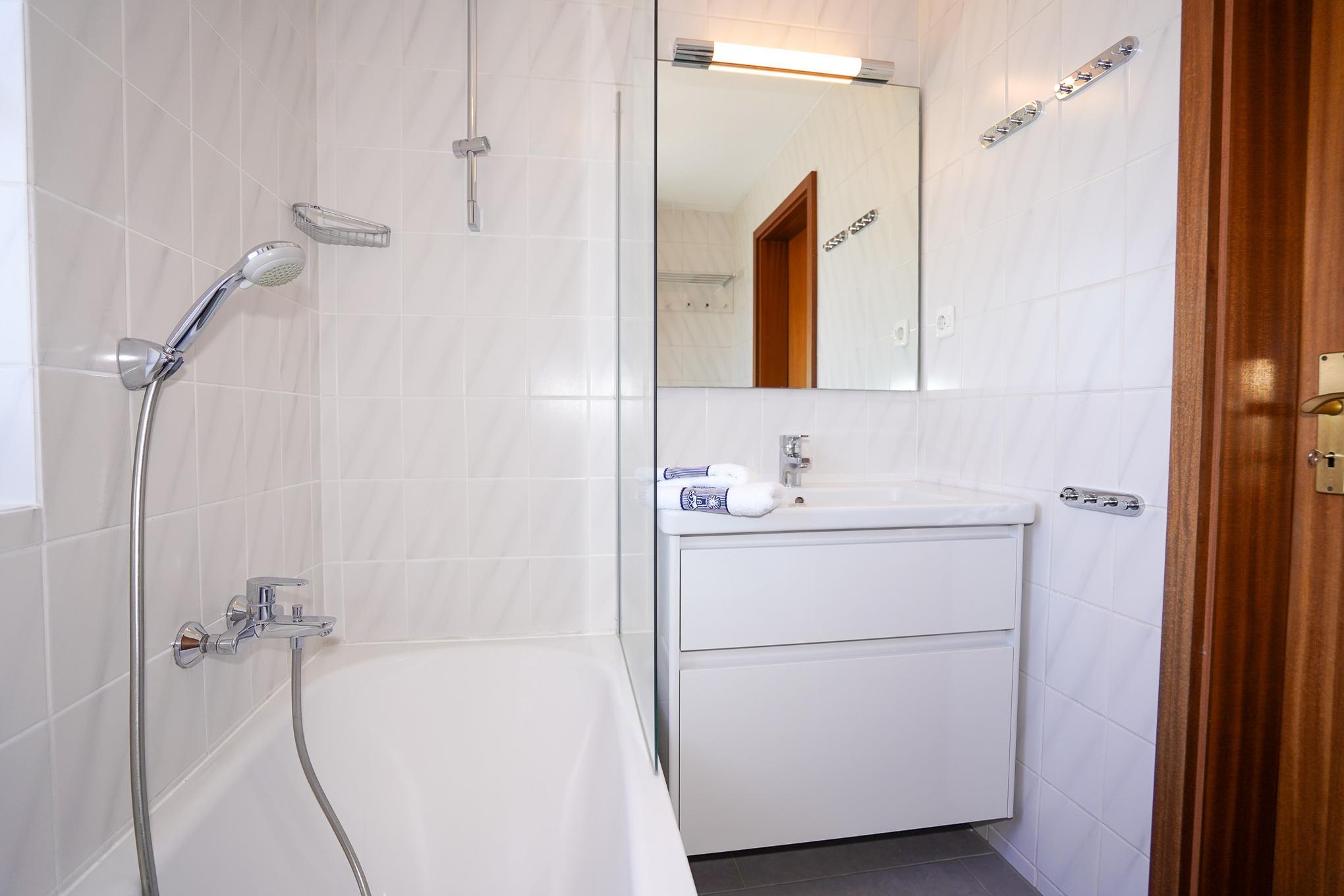 Das Haus verfügt über zwei vollwertige Badezimmer. Das modernisierte hell geflieste Tageslicht-Bad im Erdgeschoss ist mit einer großen Dusche, WC, Waschbecken und einer Waschmaschine ausgestattet. Das zweite Badezimmer im 1. OG ist mit einer Badewanne mit Duschtrennwand, einem WC und einem Waschbecken ausgestattet.