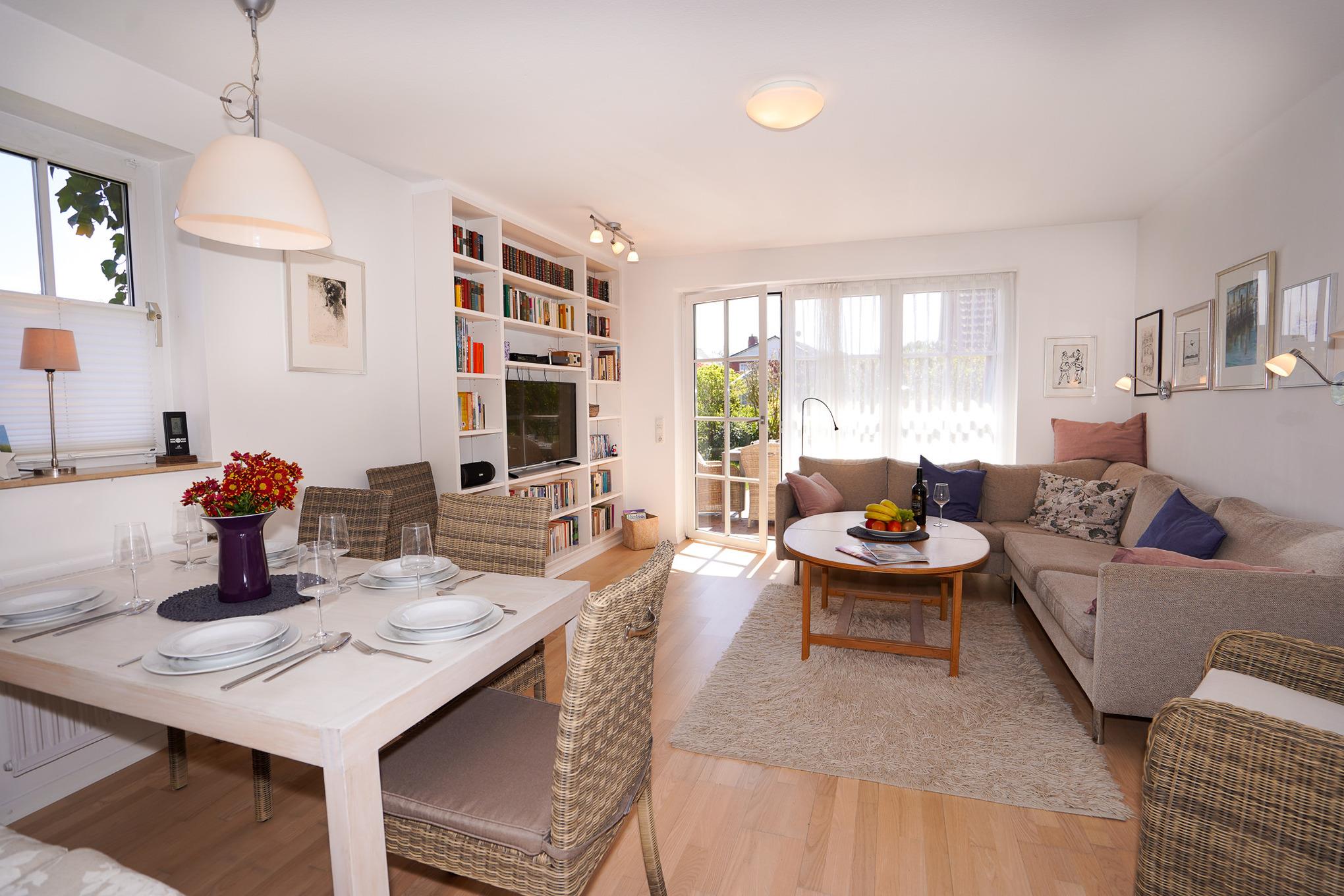 Das modern ausgestattete helle Wohn- und Esszimmer hat einen direkten Zugang zur Terrasse und ist mit einer gemütlichen Eckcouch, einem Sessel, einem großen Esstisch und einem Bücherregal ausgestattet. Zur Unterhaltung stehen eine Mini-Stereoanlage, ein großer Flachbildfernseher und selbstverständlich kostenloses W-LAN zur Verfügung. Alle Fenster im Erdgeschoss lassen sich durch elektrische Rollläden verdunkeln.