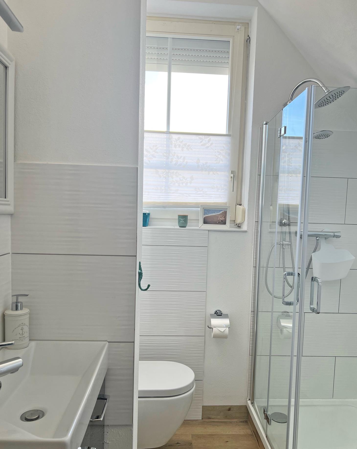 Im ersten Stock befindet sich das freundlich helle und moderne Tageslichtbadezimmer – mit Dusche, WC und Platz für Ihre Wäsche.