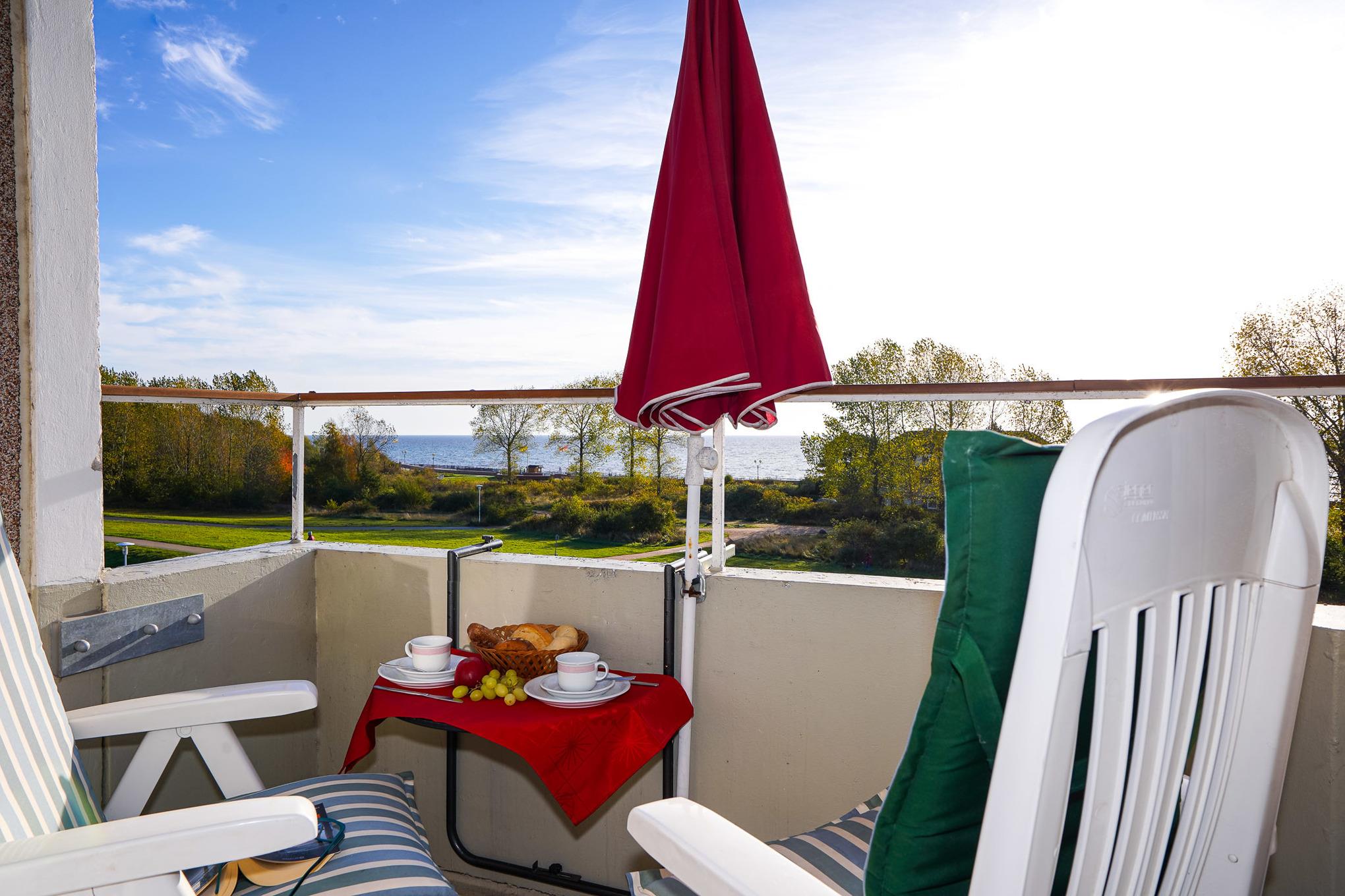 Helle Ferienwohnung mit direktem Meerblick und Balkon in Grömitz, ideal für entspannte Tage an der Ostsee.