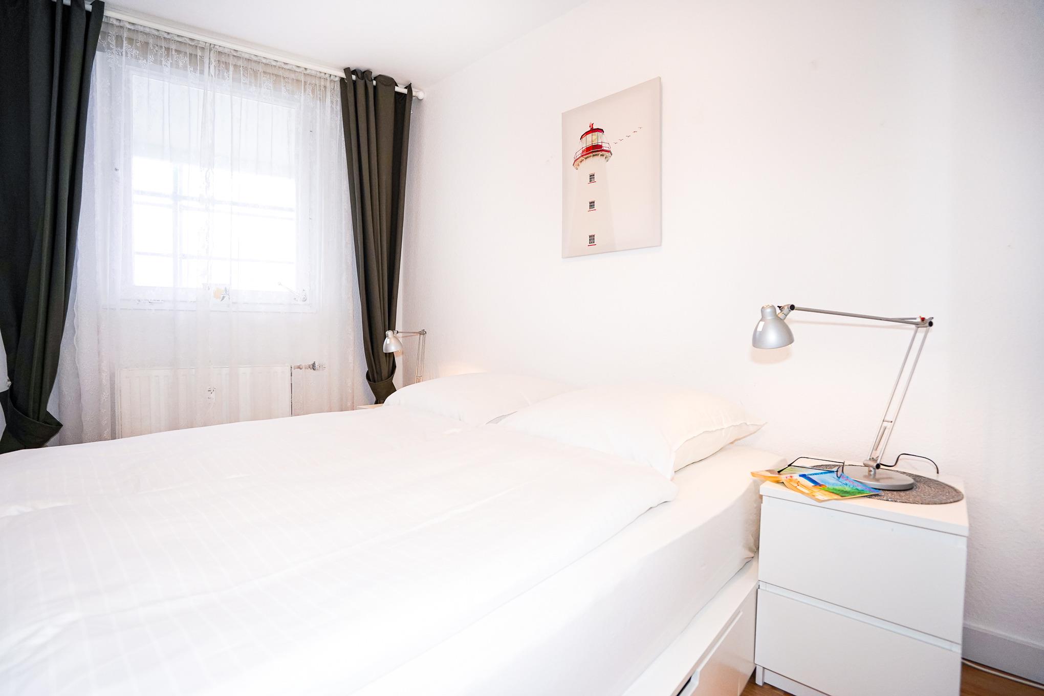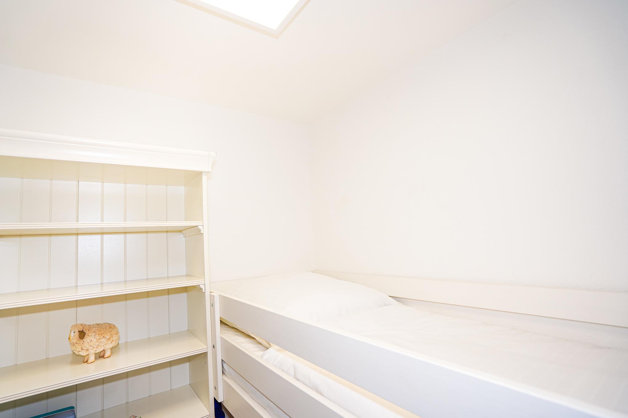 Das Elternschlafzimmer verfügt über ein Doppelbett, Nachttische sowie einen geräumigen Kleiderschrank. Im Kinderzimmer finden Sie ein Etagenbett und ein großes offenes Regal vor.