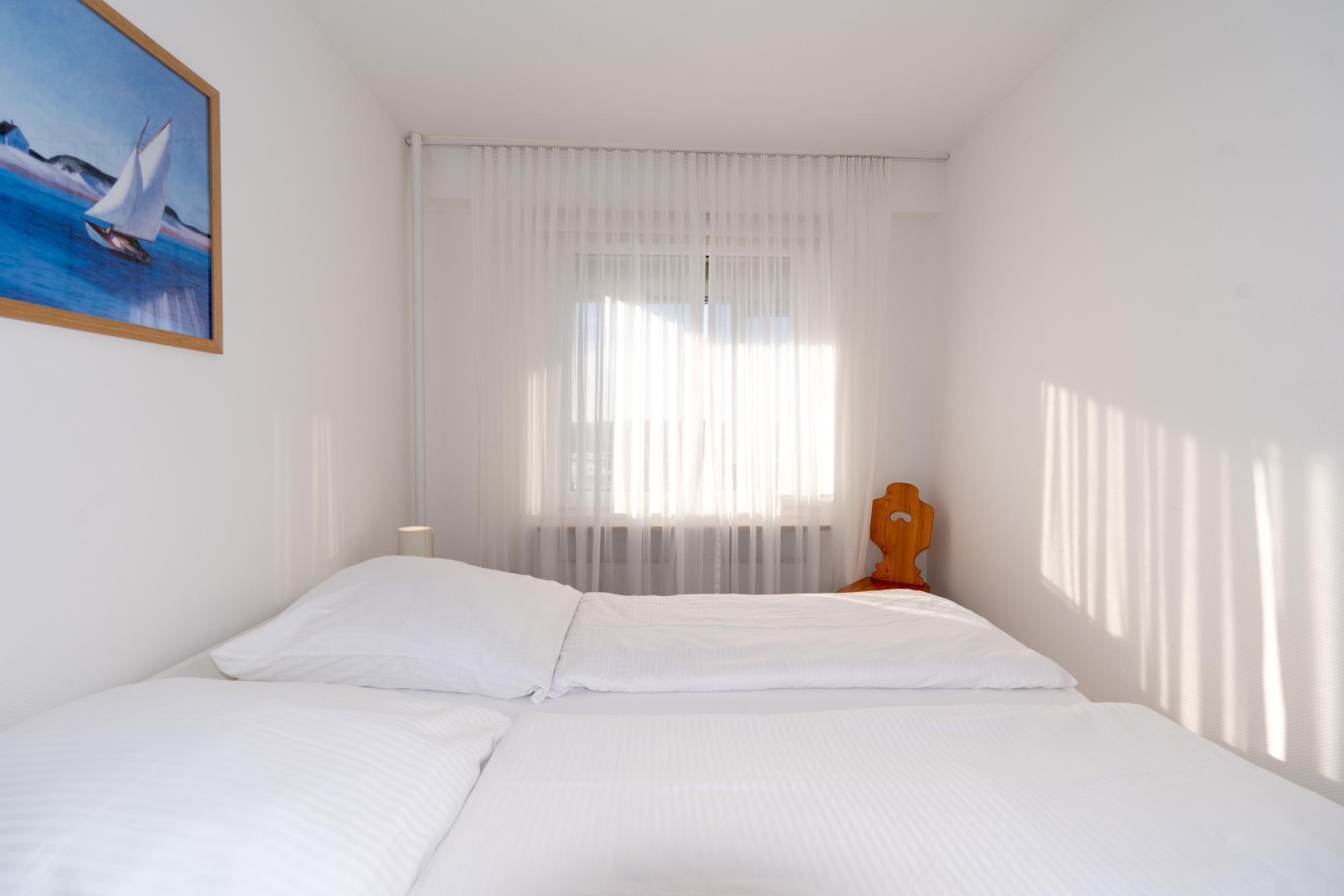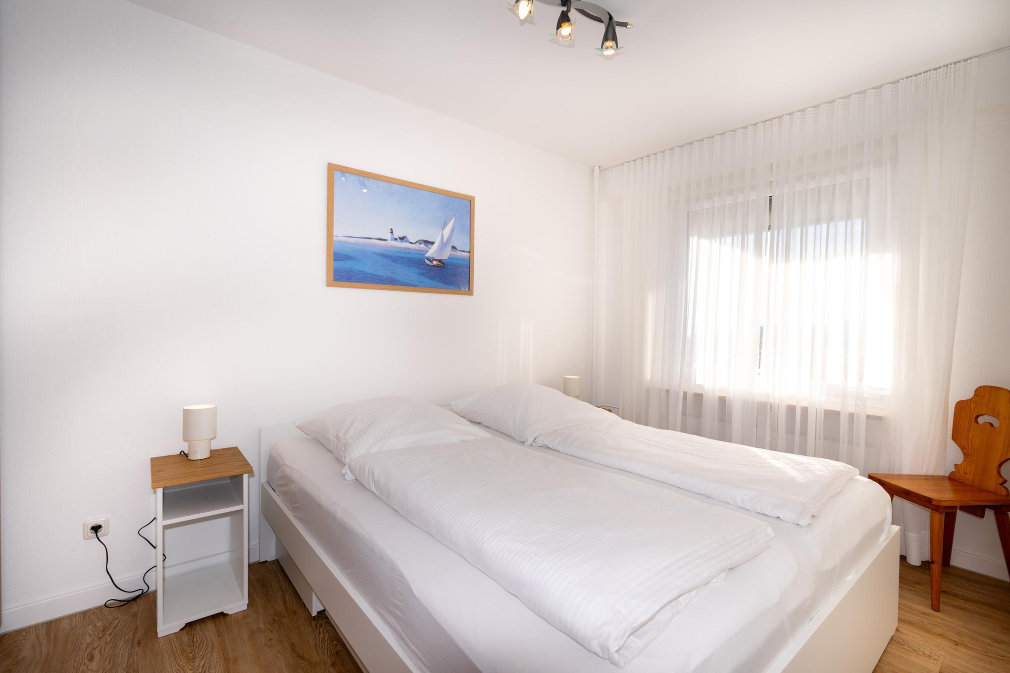 Das lichtdurchflutete Wohnzimmer wurde vollständig mit neuen Möbeln und einem neuen Fussboden ausgestattet. Es verfügt über eine große Eckschlafcouch, einen Esstisch für fünf Personen und einen großen Fernseher. Im ebenfalls neu möblierten Schlafzimmer finden Sie ein Doppelbett mit hochwertigen Matratzen (180 x 200cm), zwei Nachttische und einen Kleiderschrank vor. Weitere Ablagemöglichkeiten befinden sich in den geräumigen Wandschränken im Flur der Wohnung.