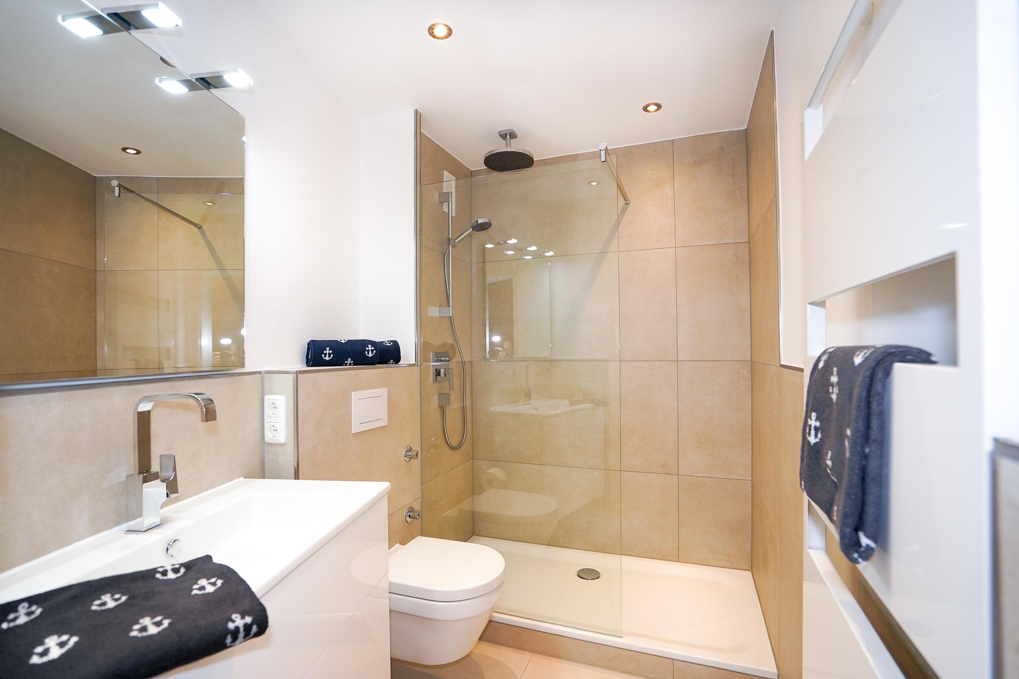 Die separate Küche ist mit einem Ceranfeld, einem Backofen, einer Mikrowelle, einem Kühlschrank mit Gefrierfach und diversen Elektrokleingeräten ausgestattet. Ein weiteres Highlight ist das vollständig modernisierte Badezimmer. Hier erwarten Sie eine große Walk in Dusche inkl. Regendusche, ein Handtuchheizkörper und ein Waschbecken mit einem beleuchteten Spiegel.