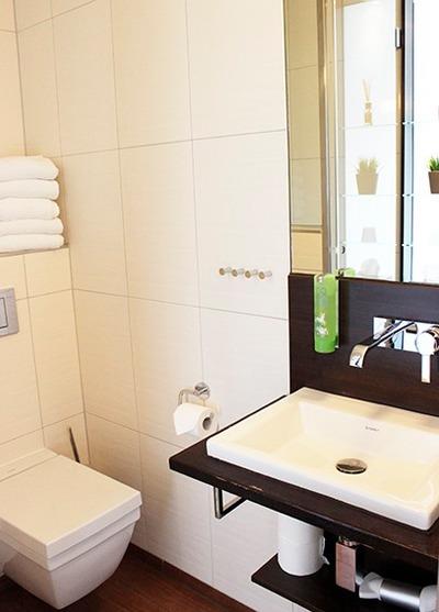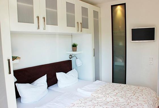 Ausstattung: ca. 25 m², Doppelbett, Bad mit Regenkopfdusche und WC, Balkon mit Sitzmöbeln, voll ausgestattete Pantryküche mit 2 Herdplatten, Esstheke mit Sitzgelegenheiten, kostenloses W-LAN, Flat-TV, Waschmaschinen- und Trocknernutzung (gegen Gebühr).