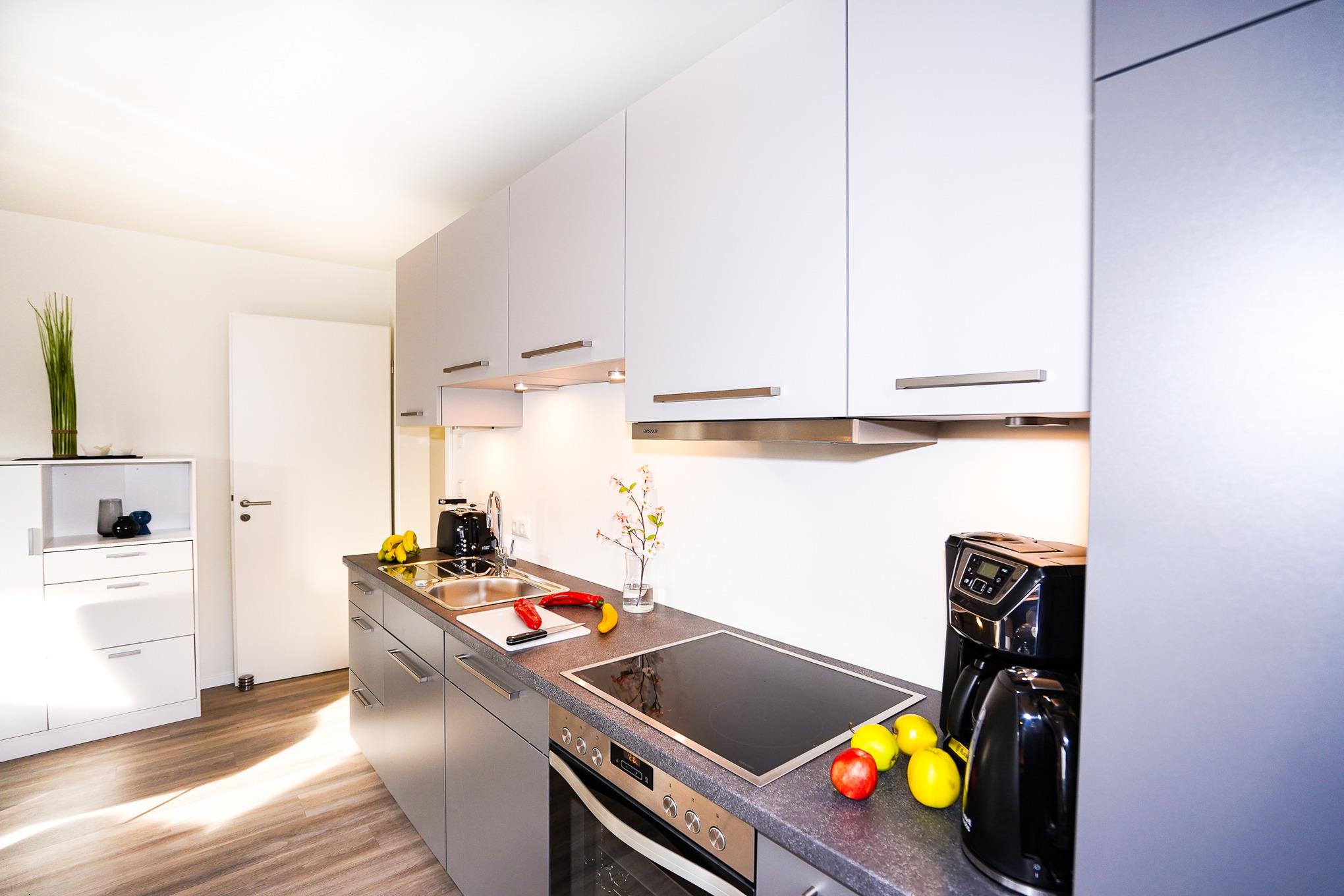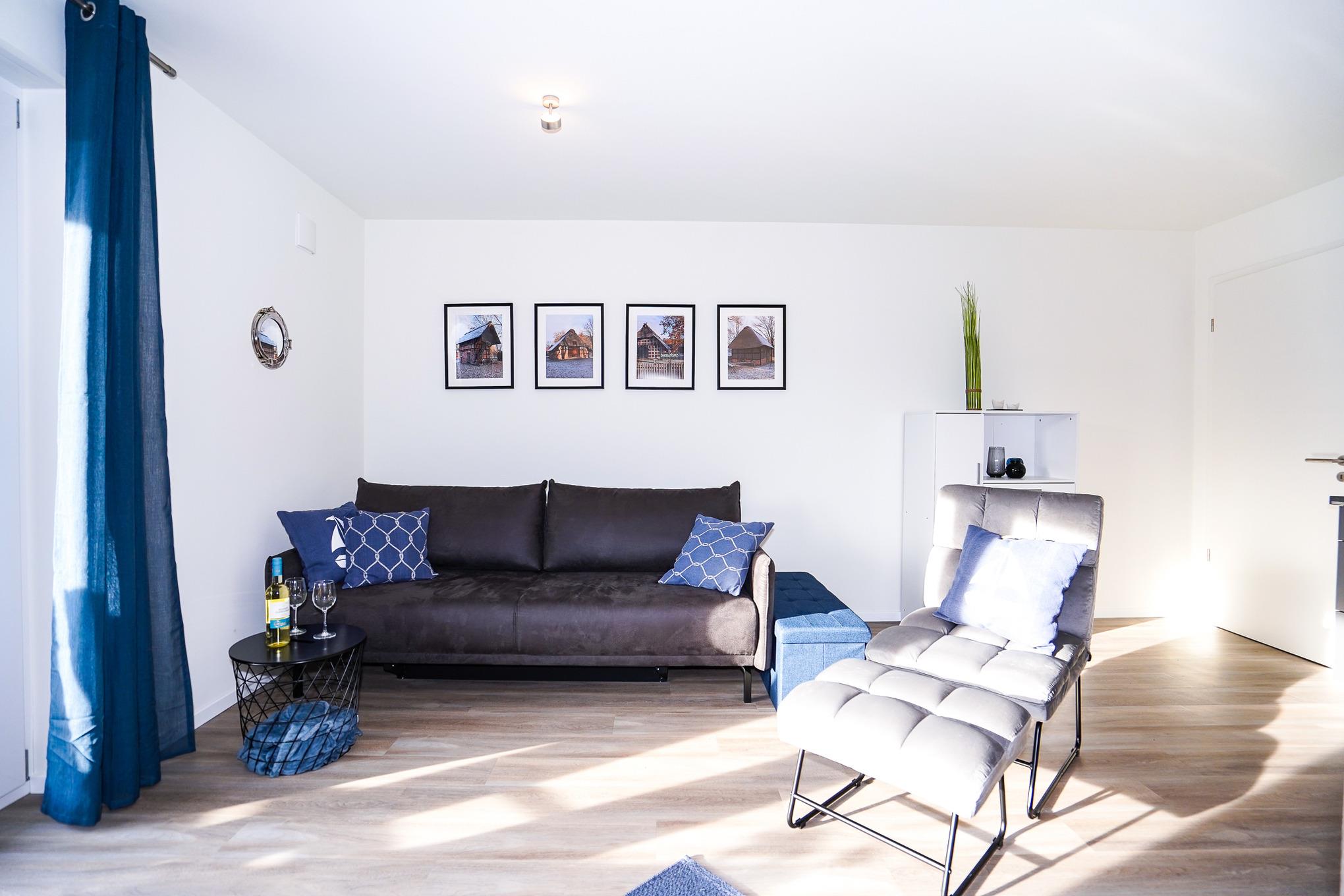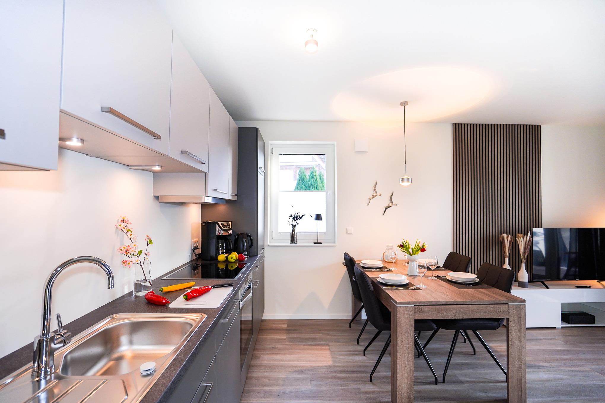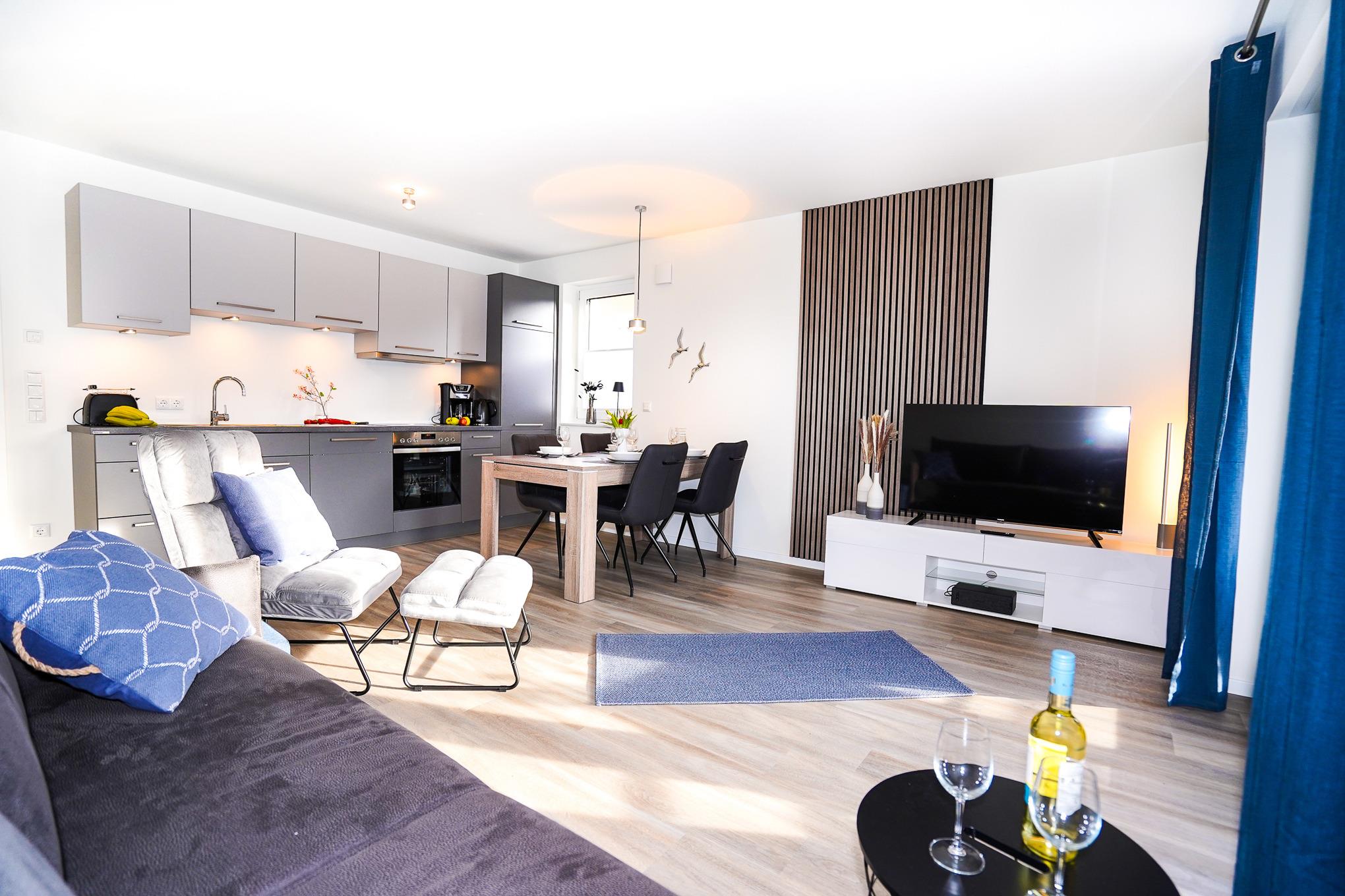 Die im 1. OG liegende Ferienwohnung überzeugt durch ihre bodentiefen Fenster, welche viel Licht hereinlassen. Das Wohnzimmer ist mit einer hochwertigen und bequemen Schlafcouch (150x200cm), einem Fernsehsessel und einer Essgruppe ausgestattet. Ein großer Flatscreen-TV und WLAN (Glasfaser) stehen Ihnen zum Ausklingen des Tages zur Verfügung. Die stilvolle und offene Küche ist mit allen erforderlichen Geräten wie bsp. Backofen, Induktionsherd, Spülmaschine und Kühlschrank mit Gefrierfach ausgestattet.