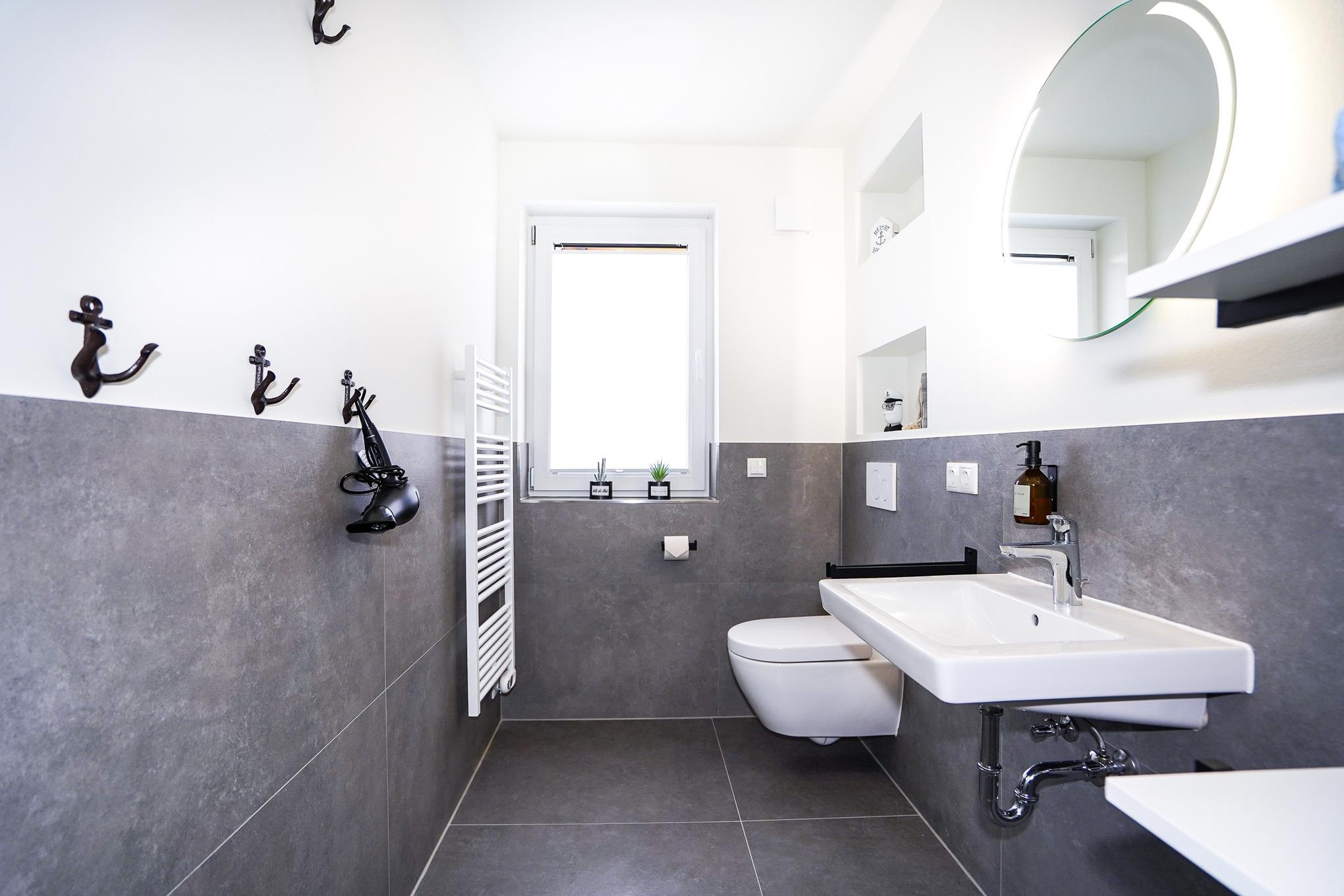 Im modernen Badezimmer mit bodengleicher Dusche und Tageslicht finden Sie diverse Ablagemöglichkeiten und einen Handtuchheizkörper vor.