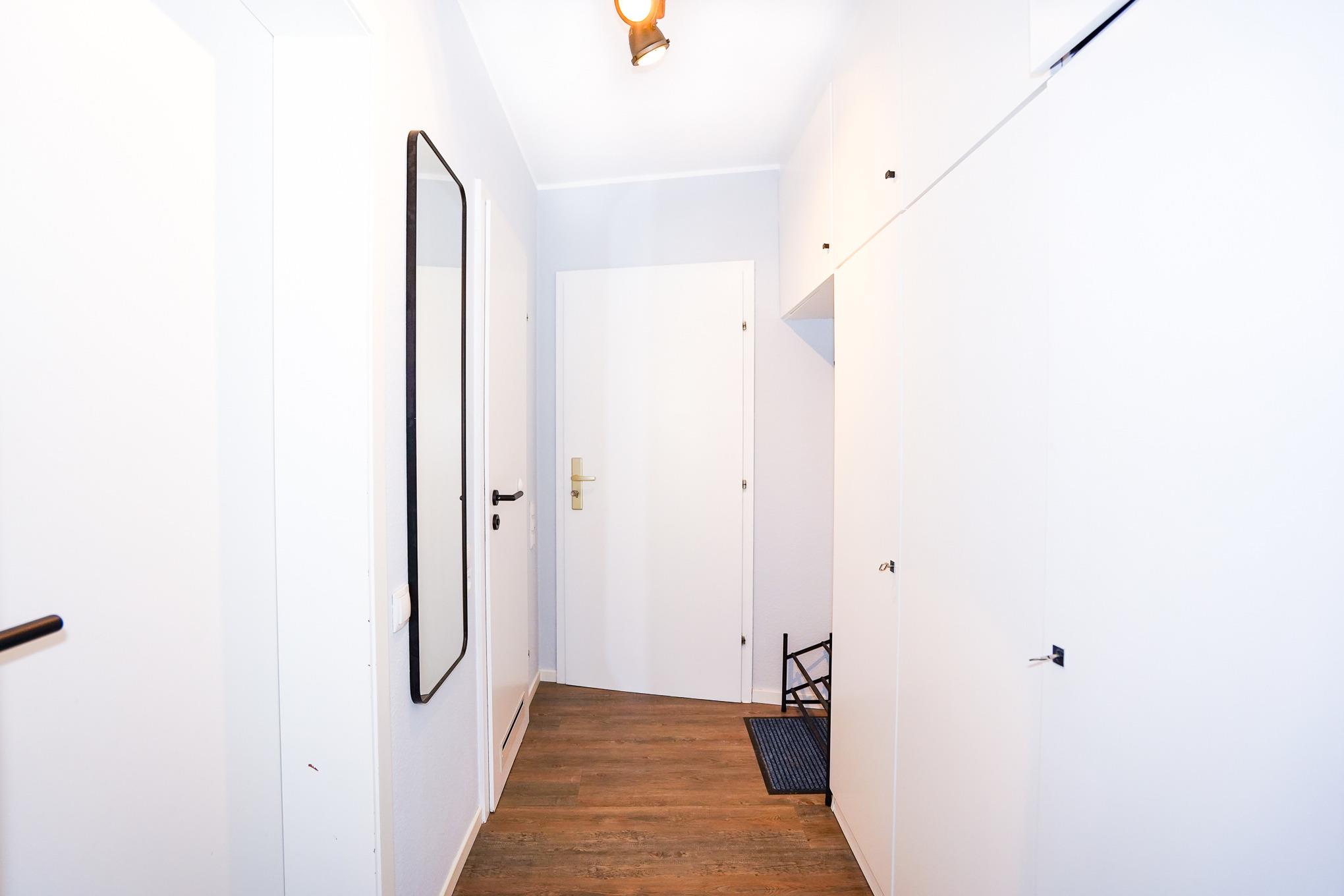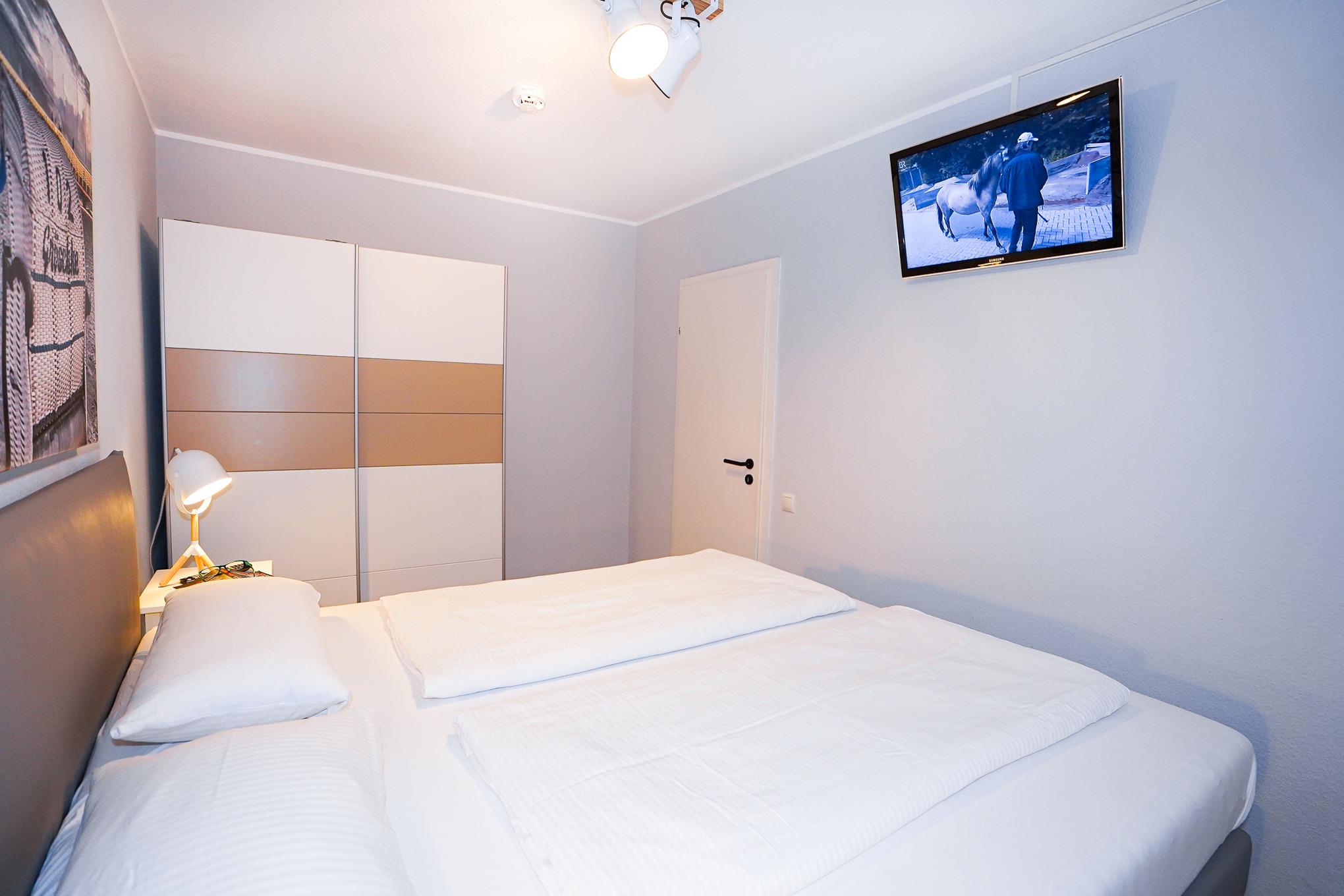 Das Schlafzimmer wurde mit einem neuen und sehr hochwertigen Doppelbett, einem weiteren Fernseher und einem Kleiderschrank ausgestattet. Große Einbauschränke im Flur bieten weitere Ablagemöglichkeiten.