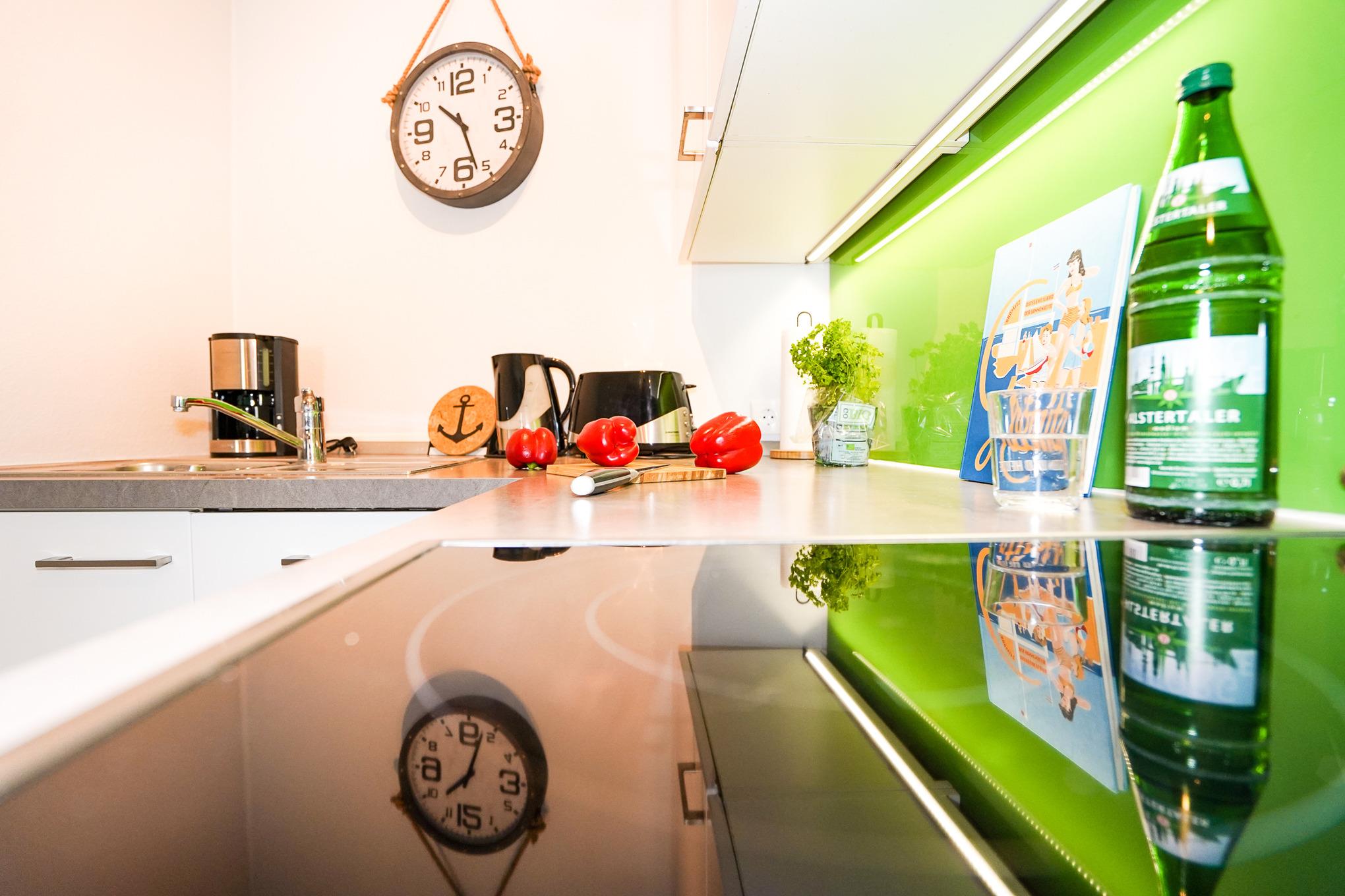 Die moderne halb offen gestaltete Küche ist voll ausgestattet und bietet unter anderem ein Cerankochfeld, Backofen, Kühlschrank mit Gefrierfach, Spülmaschine und weitere kleine Küchenhelfer wie Kaffeemaschine, Wasserkocher und Toaster.