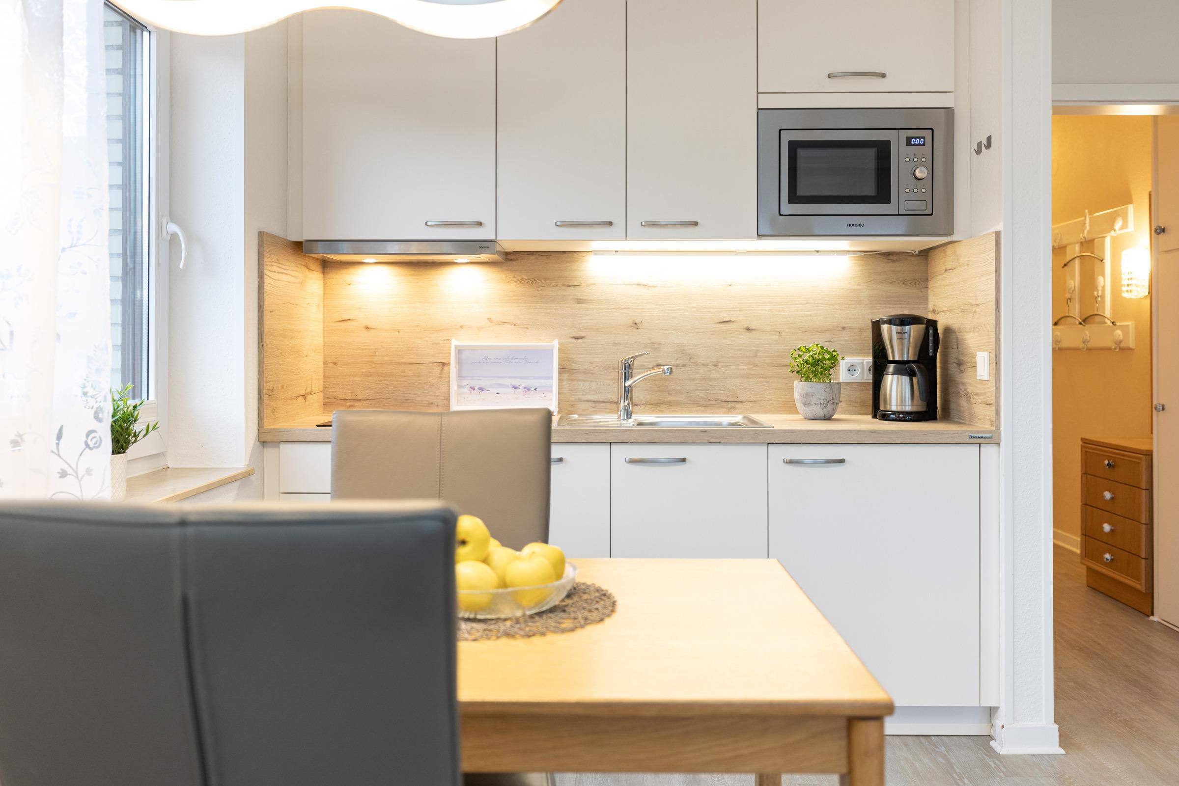 Die Küche ist neben einem Kühlschrank mit Eisfach auch mit einer Mikrowelle, einem Ceran-Kochfeld, einer Filterkaffeemaschine und einem Wasserkocher ausgestattet.