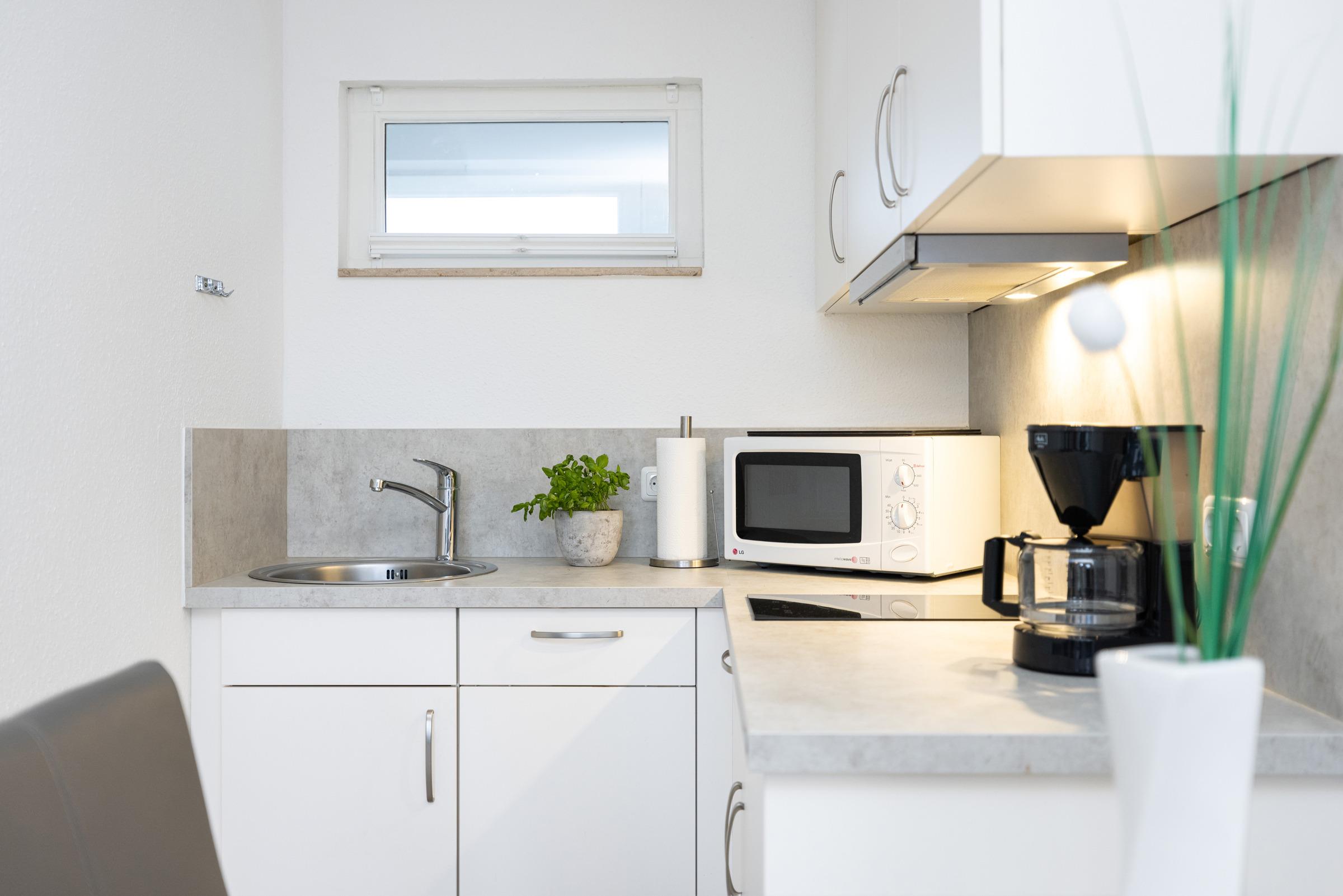 Die angrenzende Küche ist mit einem Kühlschrank mit Eisfach, einer Mikrowelle, einem Ceran-Kochfeld, einer Filterkaffeemaschine und einem Wasserkocher ausgestattet.