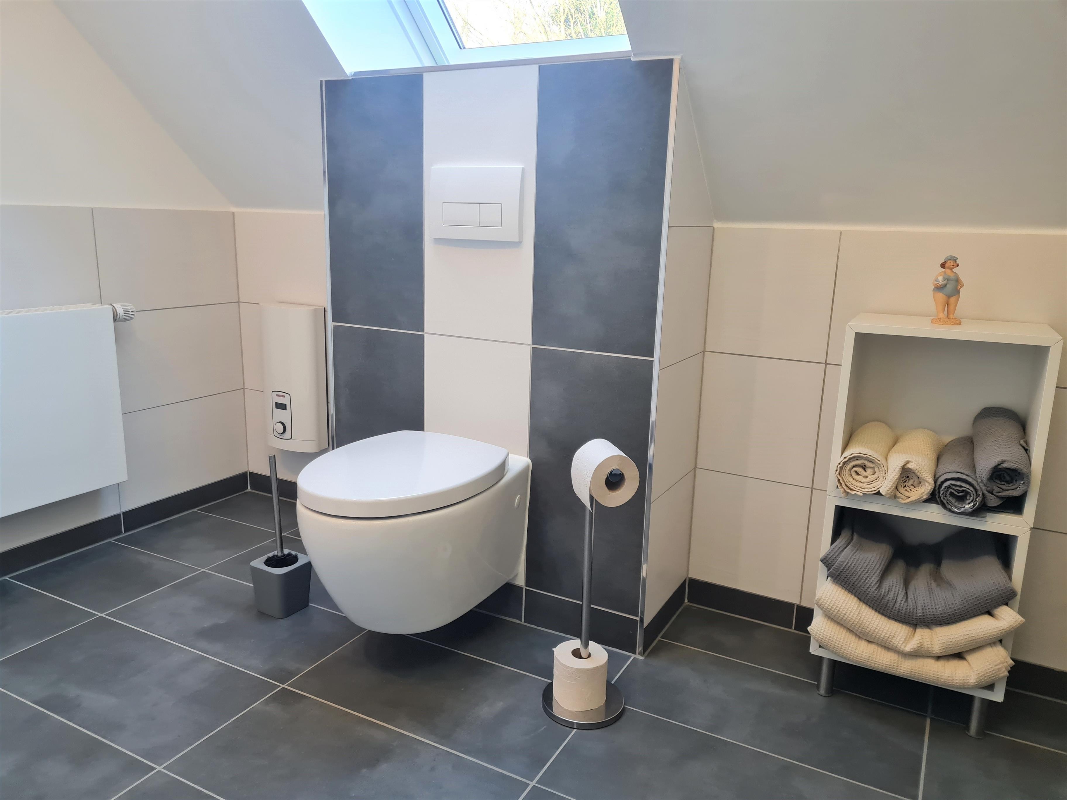 Das helle Duschbad mit Tageslicht hat eine bodengleiche Dusche mit Glaswand und Regendusche.