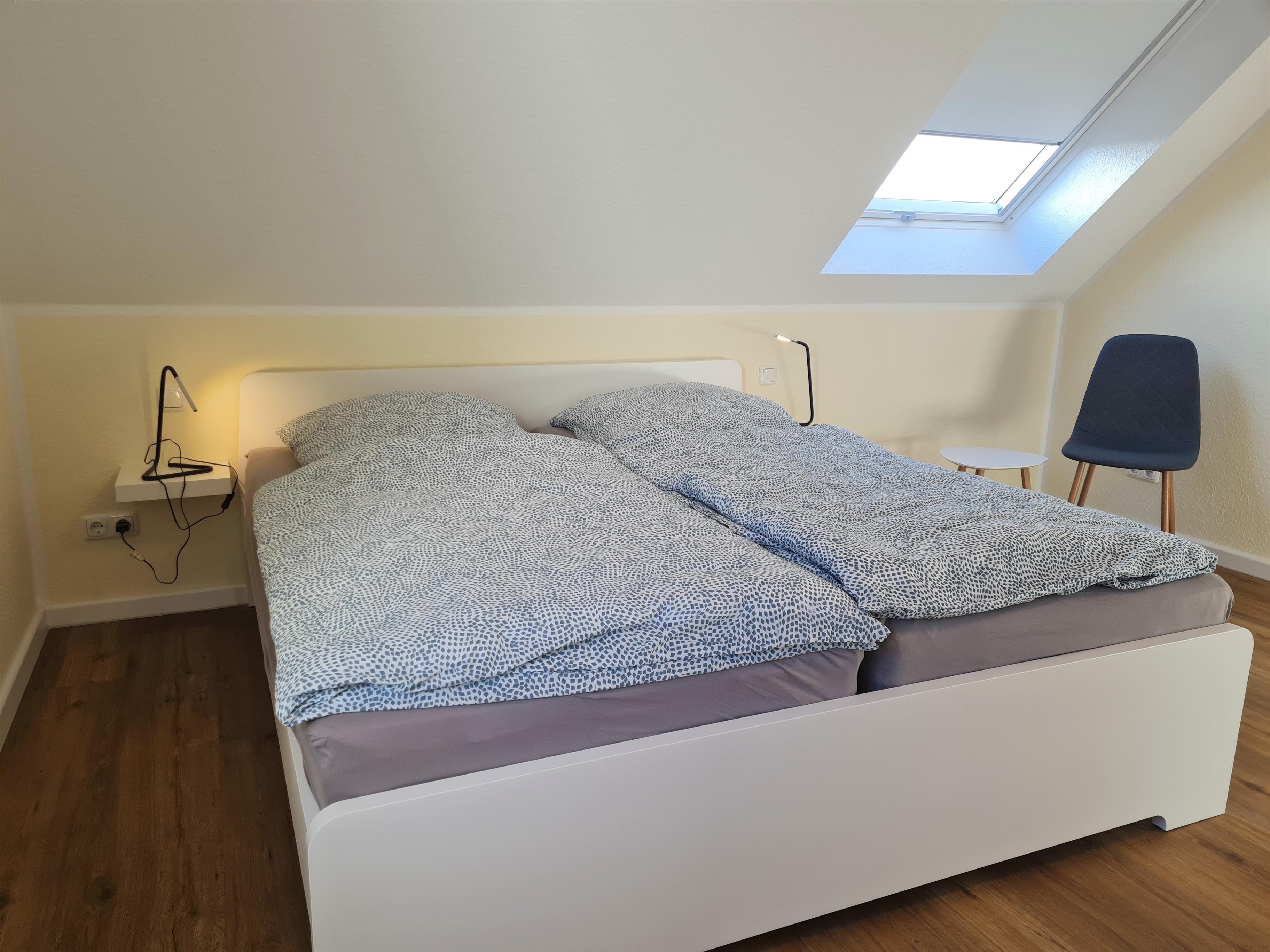 Das 1. Schlafzimmer ist mit einem Doppelbett (180 x 200cm, getrennte Matratzen) und Kleiderschränken eingerichtet. Auch von hier hat man einen Ausblick auf die Ostsee.