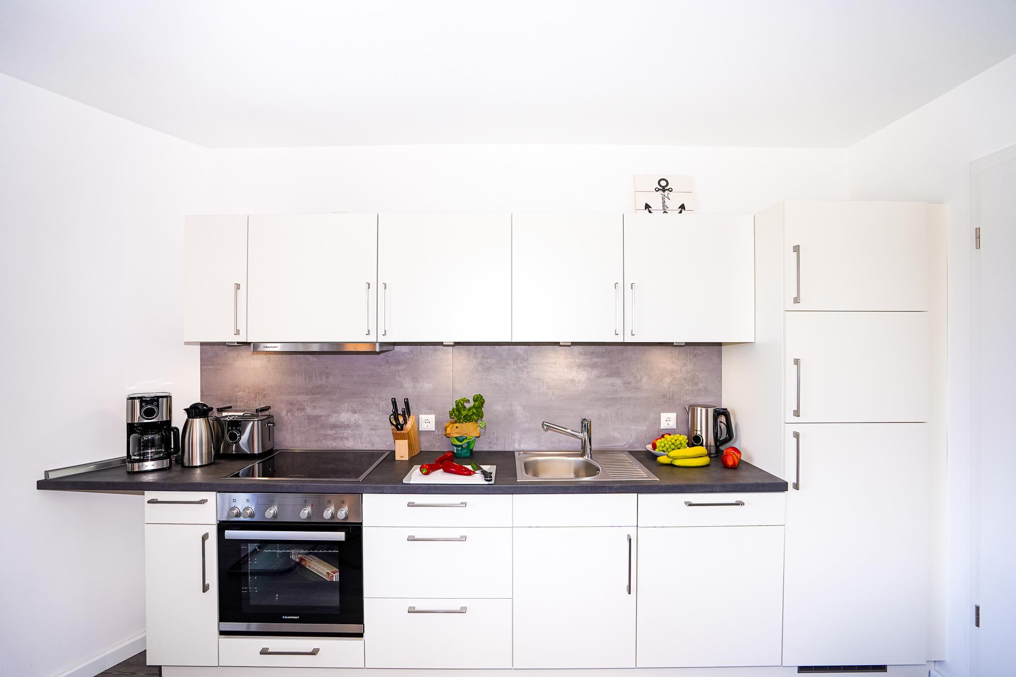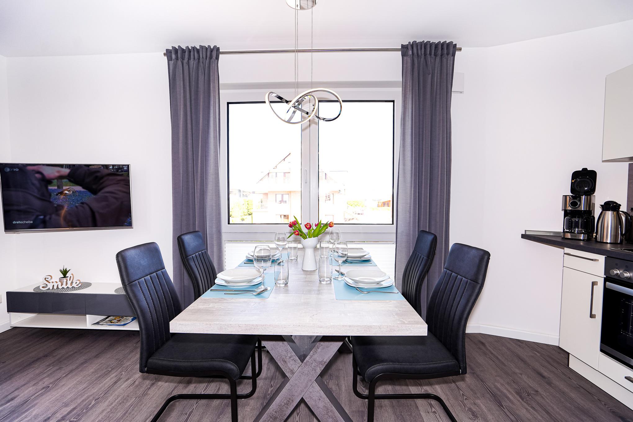 Der offene Wohn- und Kochbereich lässt keine Wünsche offen. In der voll ausgestatteten neuen Küche mit Backofen, Cerankochfeld, Spülmaschine, Kühlschrank mit Gefrierfach, Mikrowelle und einem großen Esstisch für 4 Personen kann man es sich im lichtdurchfluteten Raum kulinarisch richtig gut gehen lassen. Kostenloses WLAN, ein großer Flatscreen (Kabel-TV) und eine schöne große Couch laden zum gemütlichen ausklingen des Tages ein oder man genießt die Abendsonne auf dem Balkon.