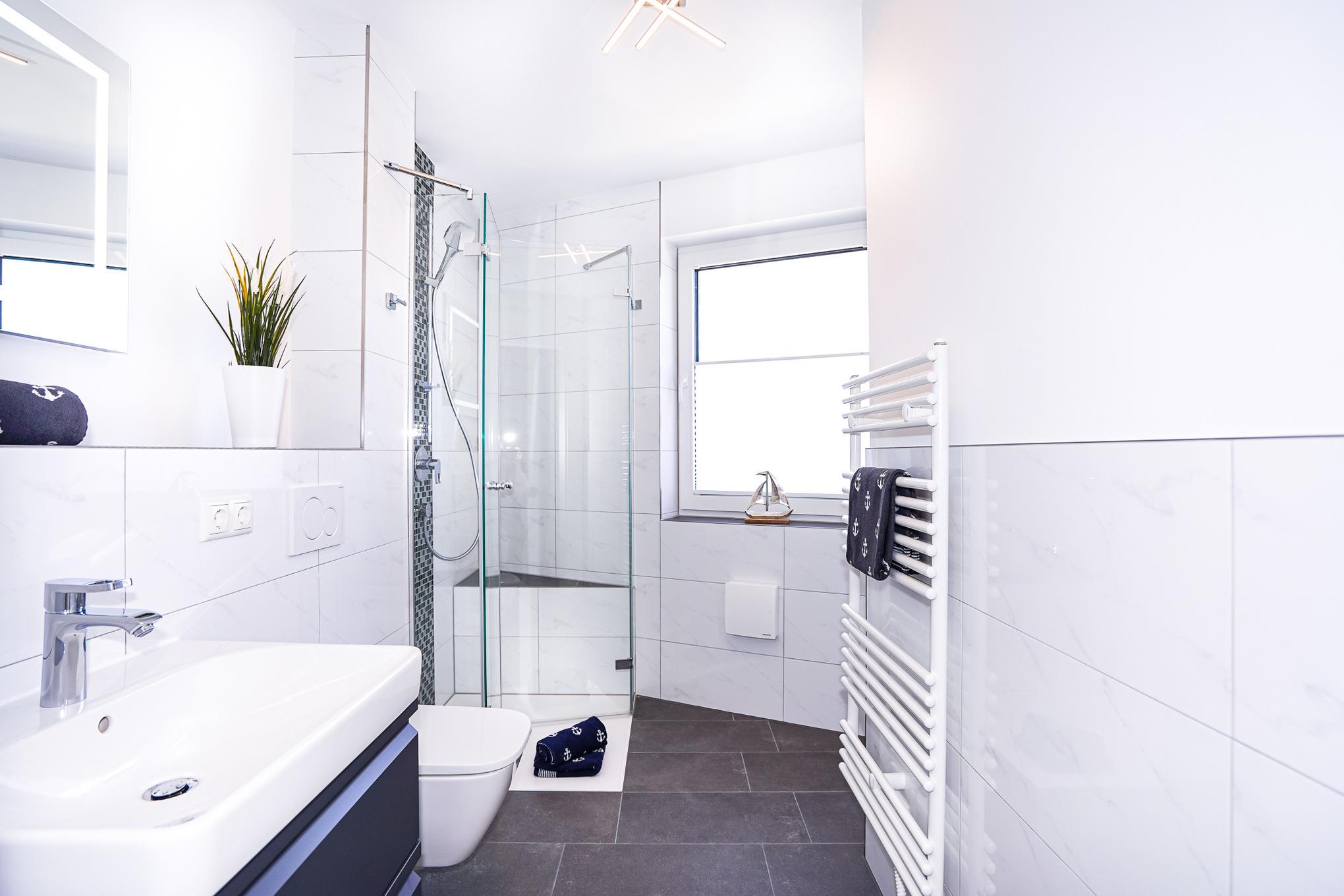 Im modernen Badezimmer mit Tageslicht finden Sie eine Fußbodenheizung, ein Handtuchheizkörper und eine bodengleiche Dusche mit Ablagemöglichkeiten. Highlight ist hier eine Waschmaschine inkl. Trocknerfunktion, welche Ihnen kostenlos zur Verfügung steht.
