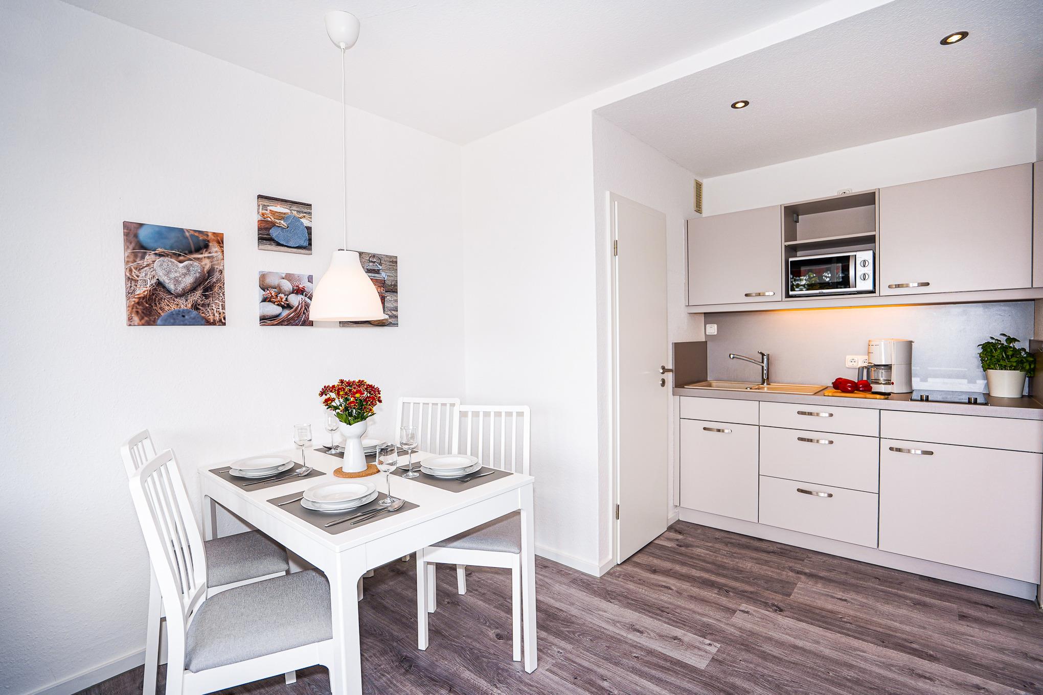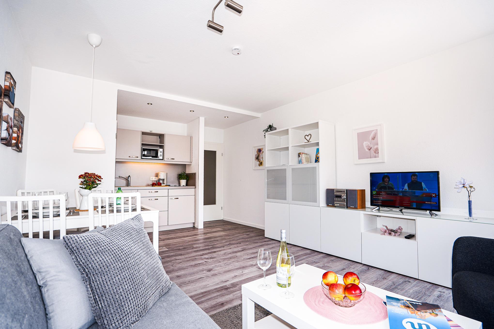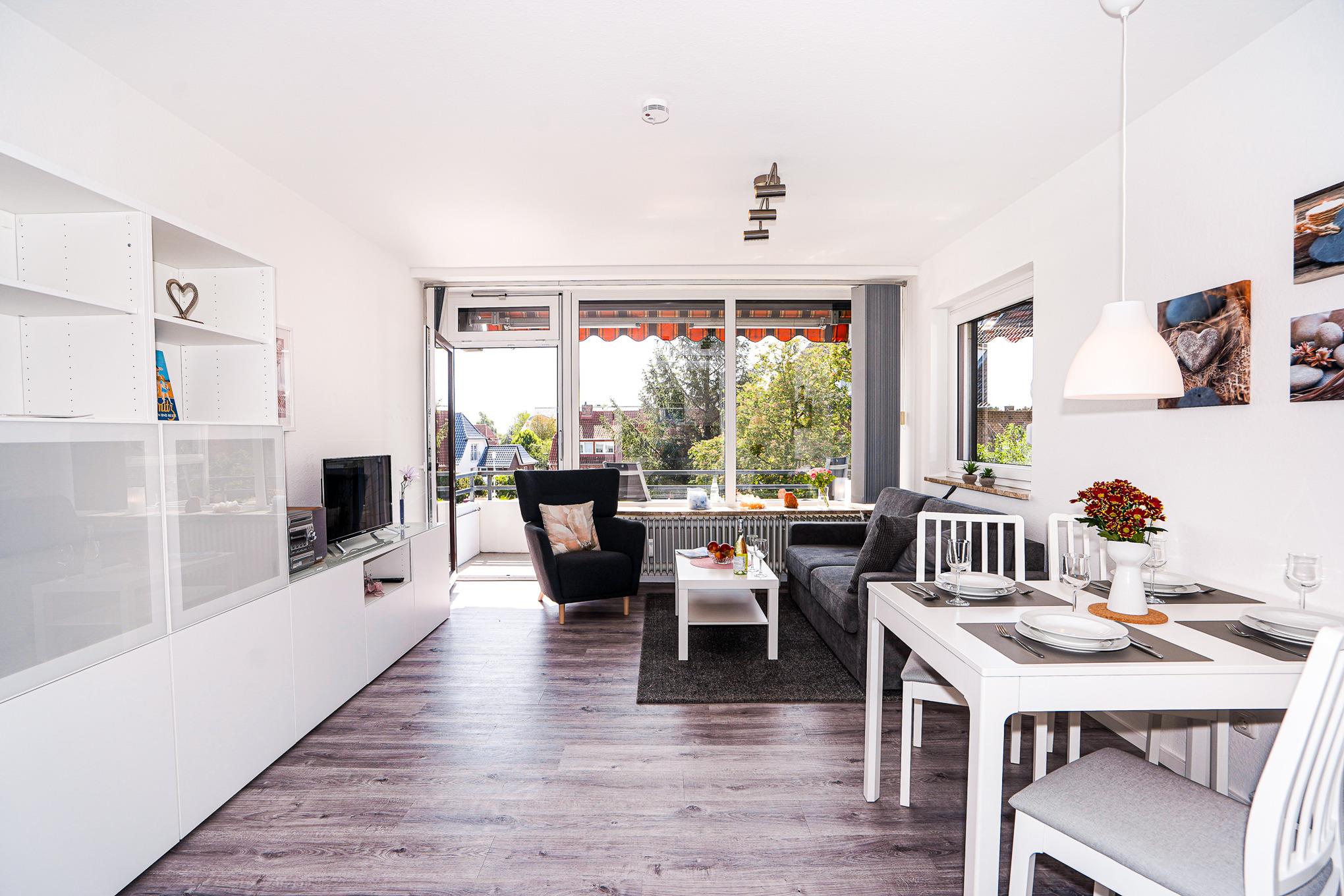 Den Mittelpunkt der Wohnung bildet der lichtdurchflutete, kombinierte Wohn-/Essbereich mit direktem Balkonzugang. Hier lässt es sich auf dem Sofa auch an Regentagen gemütlich machen. Ein Fernseher, Stereoanlage und selbstverständlich kostenloses W-LAN sorgen für Unterhaltung. Das Sofa lässt sich abends bei Bedarf mit wenigen Handgriffen leicht in eine Schlafstätte (150x200)