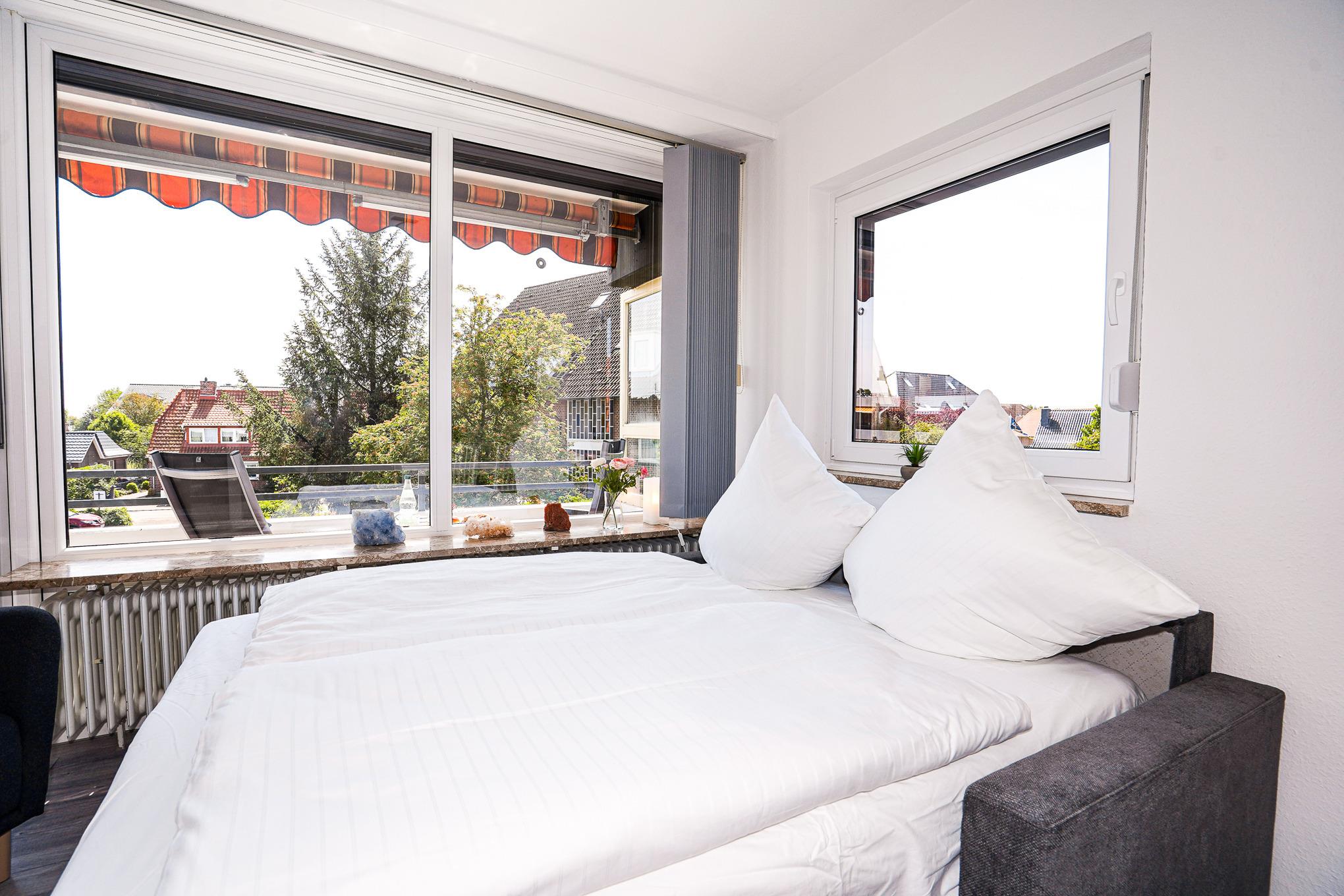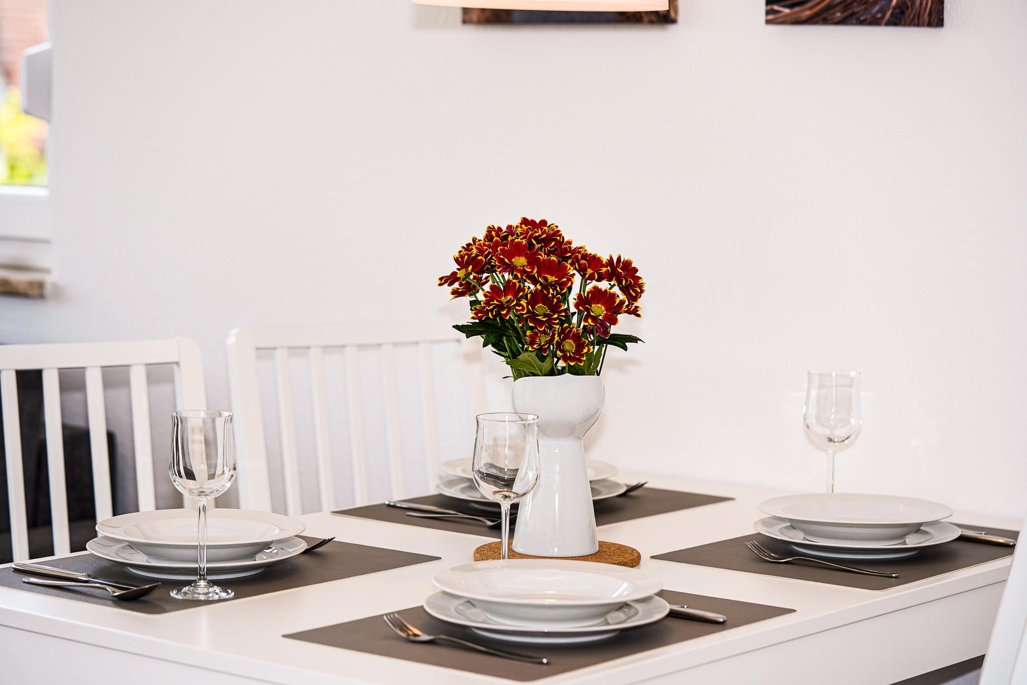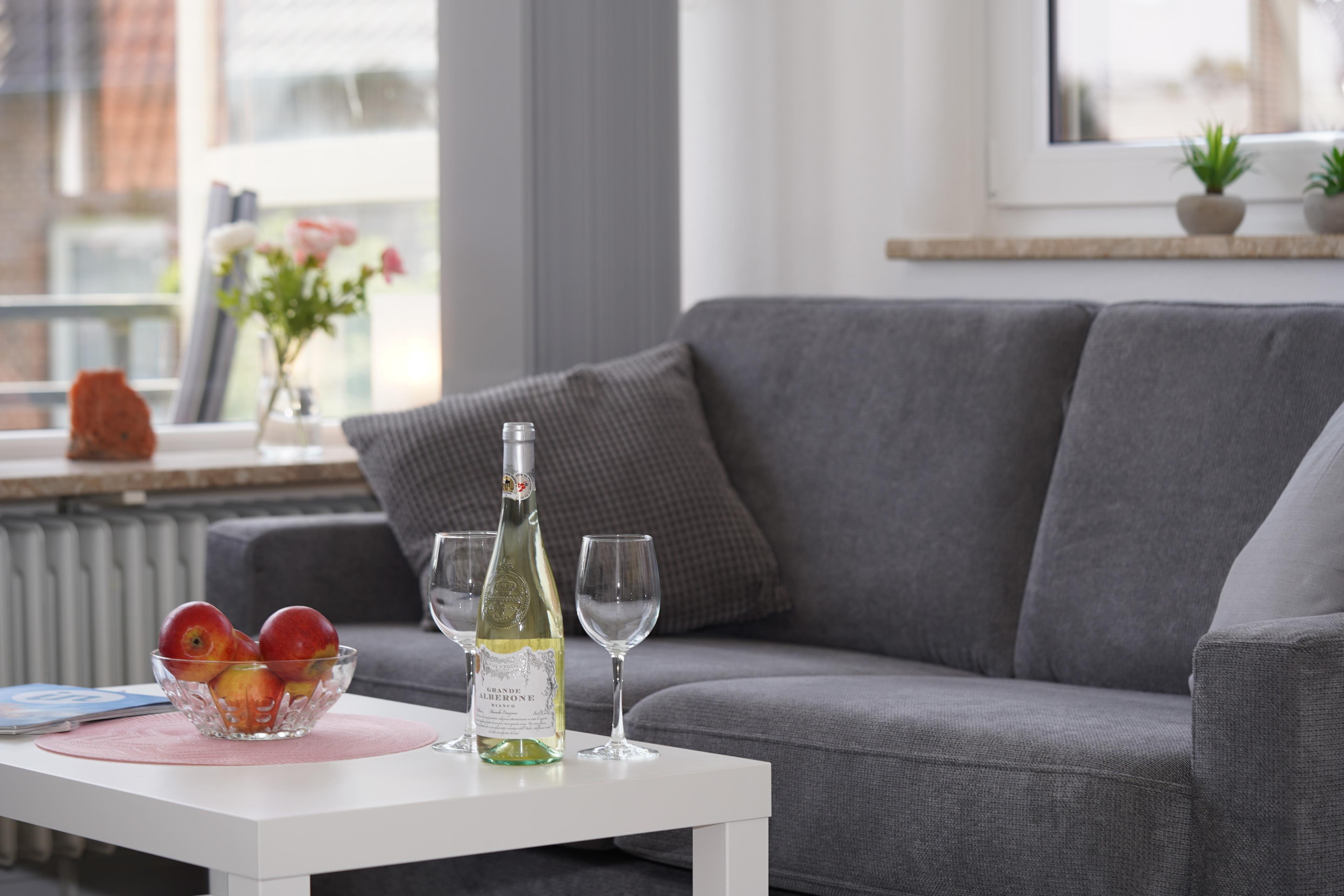 Den Mittelpunkt der Wohnung bildet der lichtdurchflutete, kombinierte Wohn-/Essbereich mit direktem Balkonzugang. Hier lässt es sich auf dem Sofa auch an Regentagen gemütlich machen. Ein Fernseher, Stereoanlage und selbstverständlich kostenloses W-LAN sorgen für Unterhaltung. Das Sofa lässt sich abends bei Bedarf mit wenigen Handgriffen leicht in eine Schlafstätte (150x200)