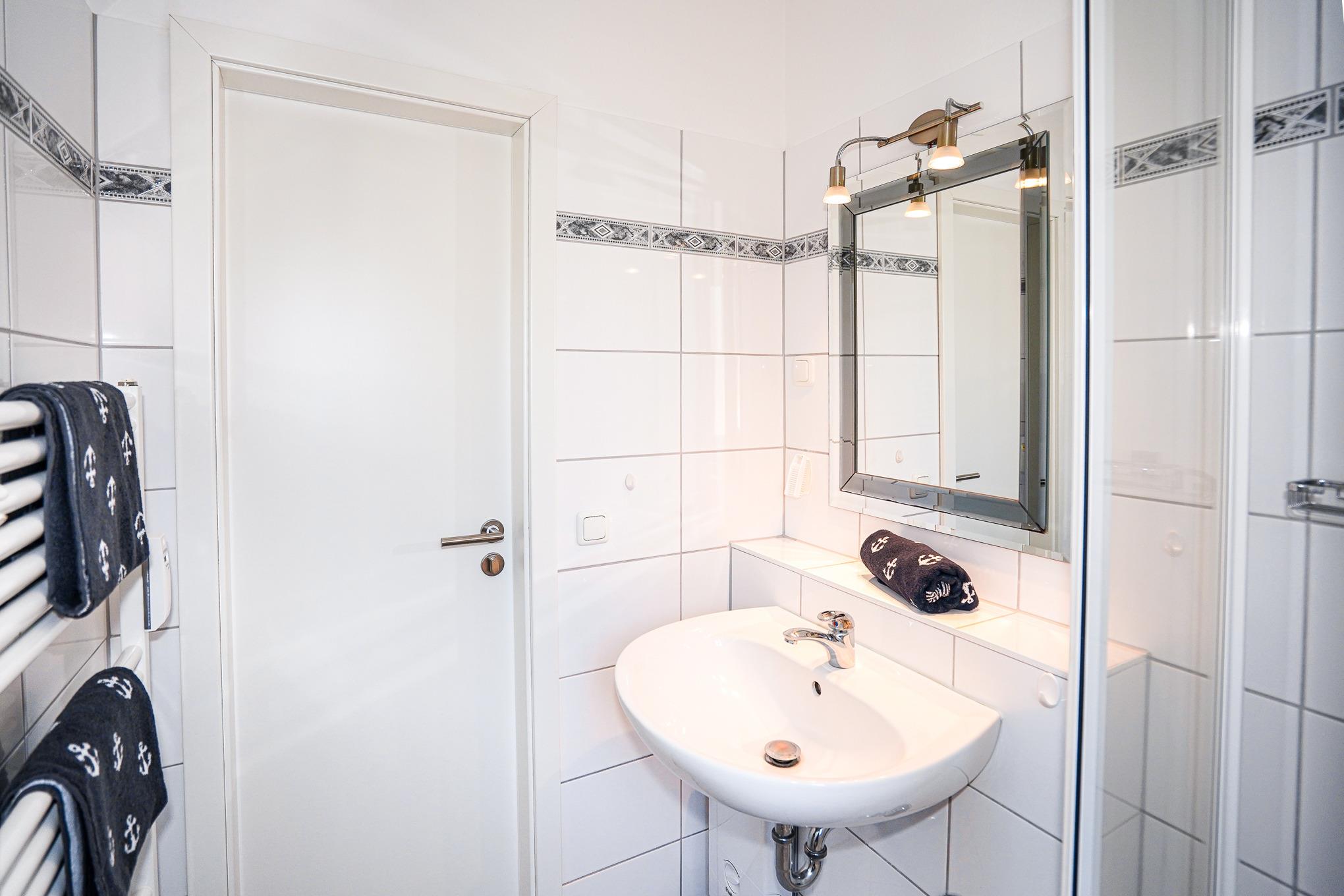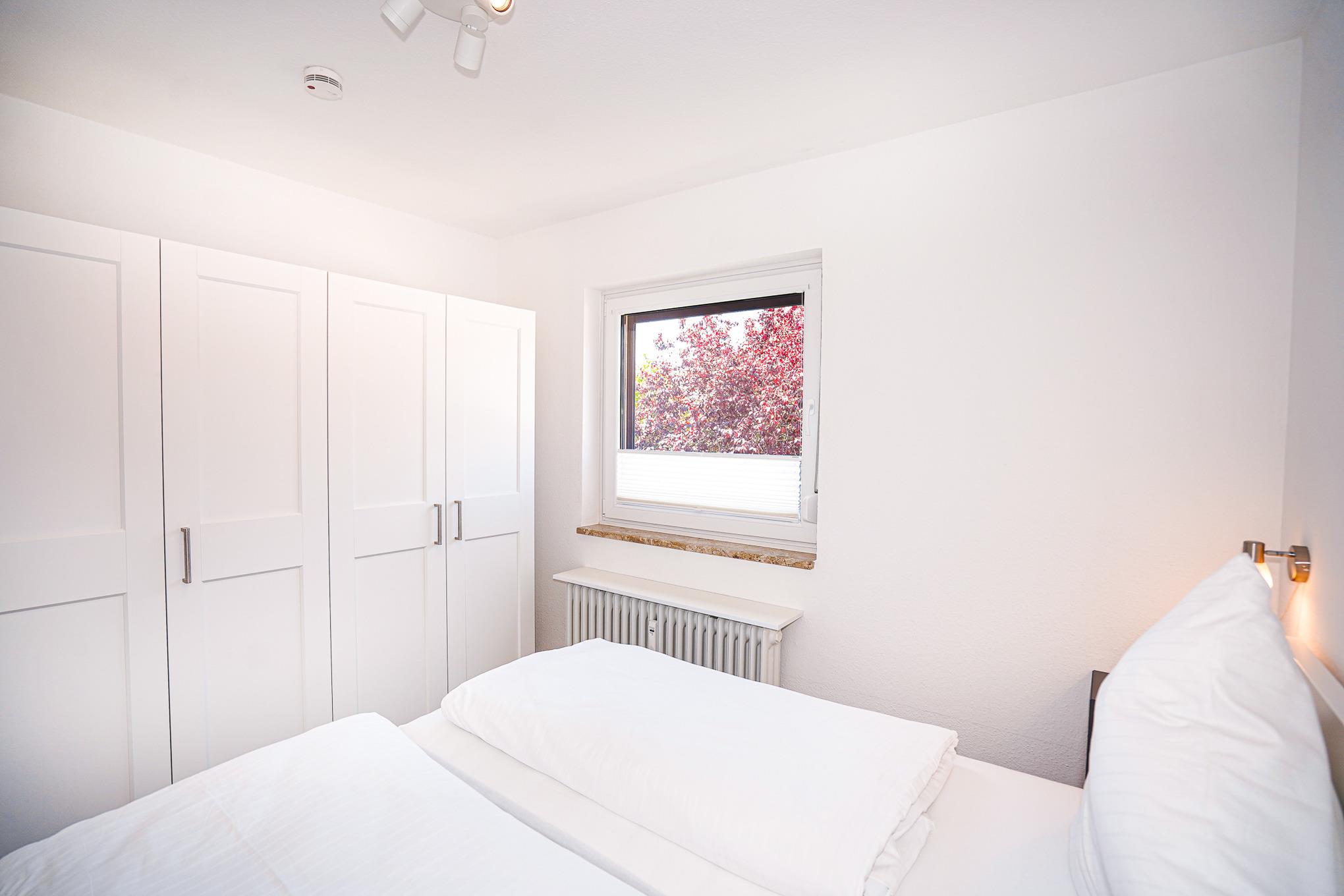 Im Schlafzimmer, welches mit einem bequemen Doppelbett ausgestattet ist, befinden sich große Kleiderschränke mit ausreichend Staumöglichkeit für Ihre Urlaubskleidung. Das Tageslichtbadezimmer ist hell gefliest und mit einer Dusche, WC sowie Handtuchheizkörper ausgestattet.